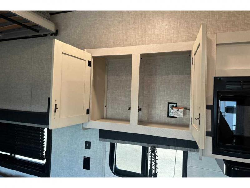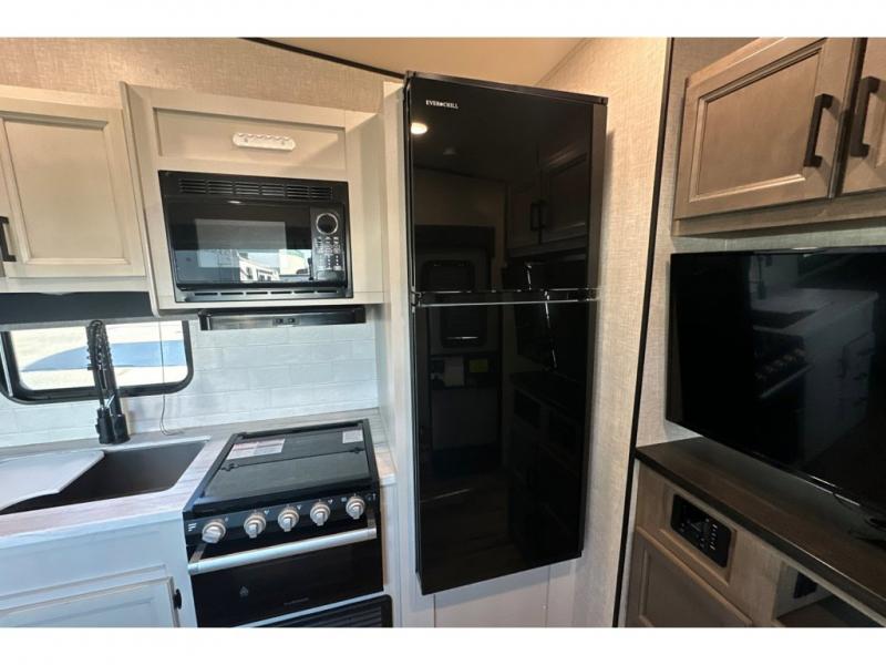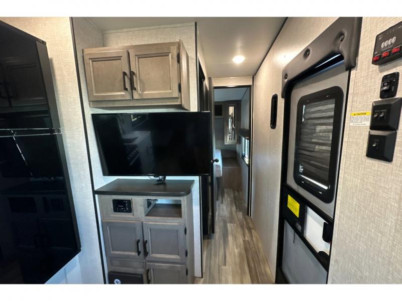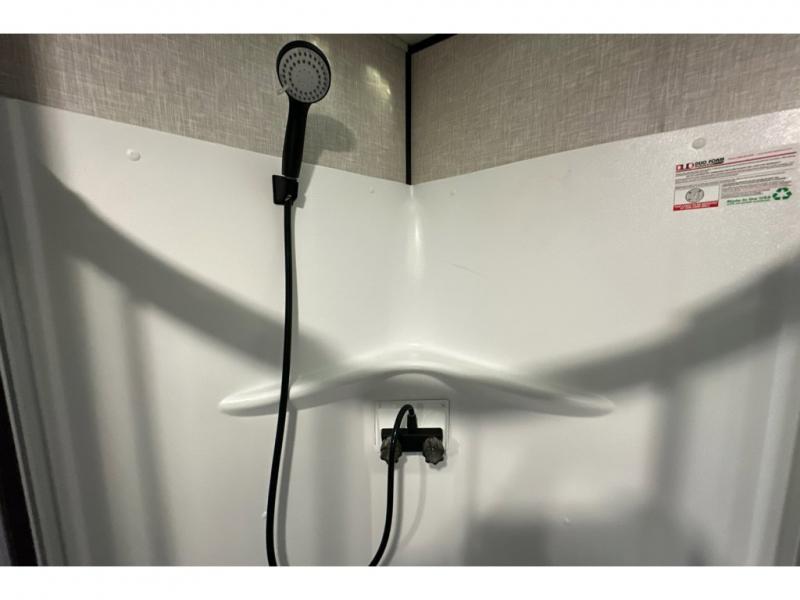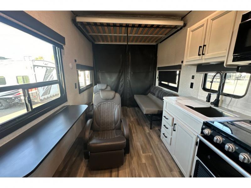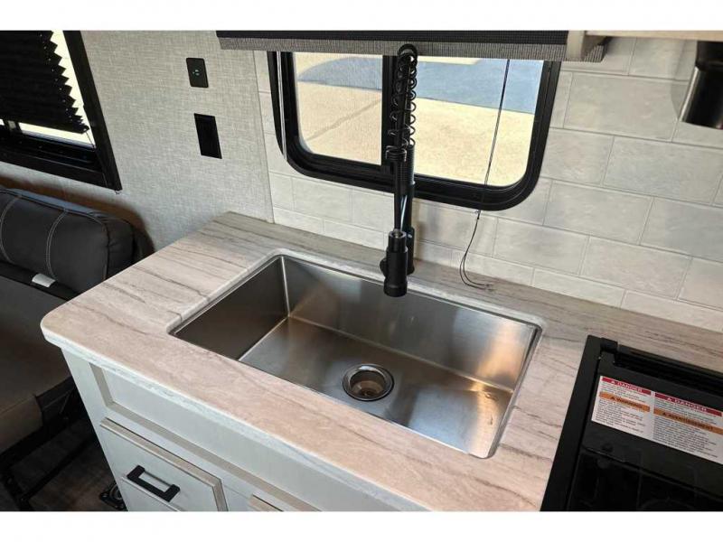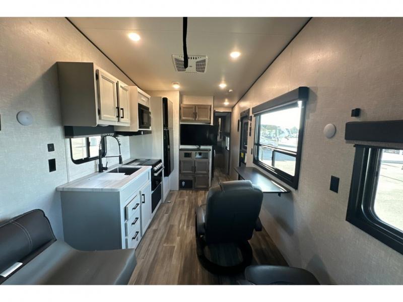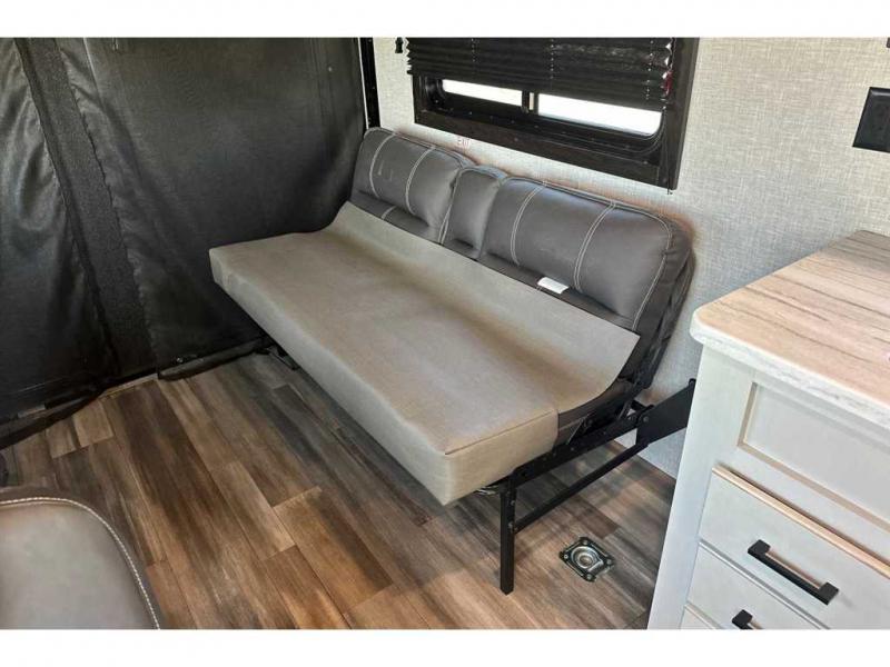You will have everything you need for a comfortable camping trip in this toy hauler! Unload your off-road toy easily from the cargo area featuring up to 14' of space using the spring assist 8' ramp door for a fun day out on the trails. The fully equipped kitchen has a three burner cooktop to fry up some eggs in the morning, and you can enjoy them at either the flip-up bar top with two stools or at the rear convertible sofa and two chairs in the other side if the removable table. The dual entry bathroom is easy to access from the front private bedroom and it has a radius shower to wash the mud out of your hair.