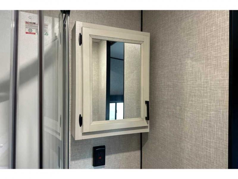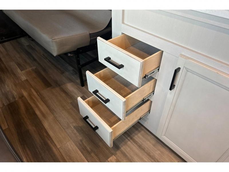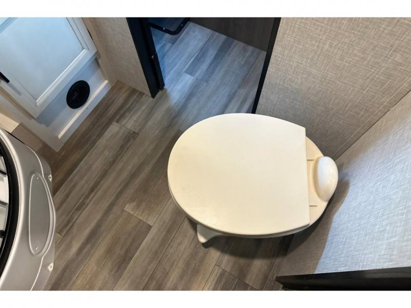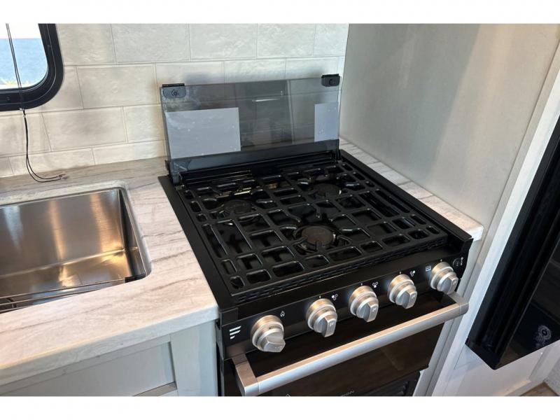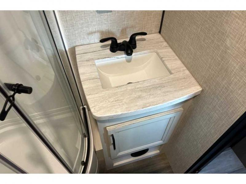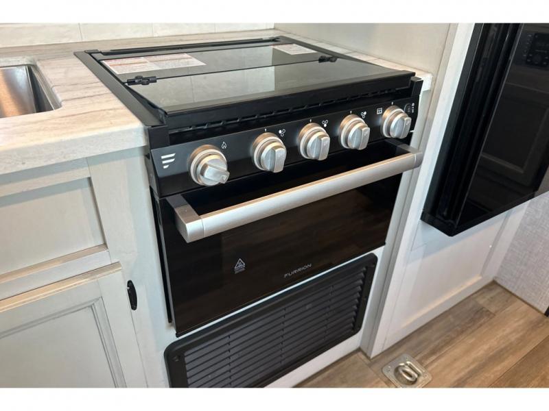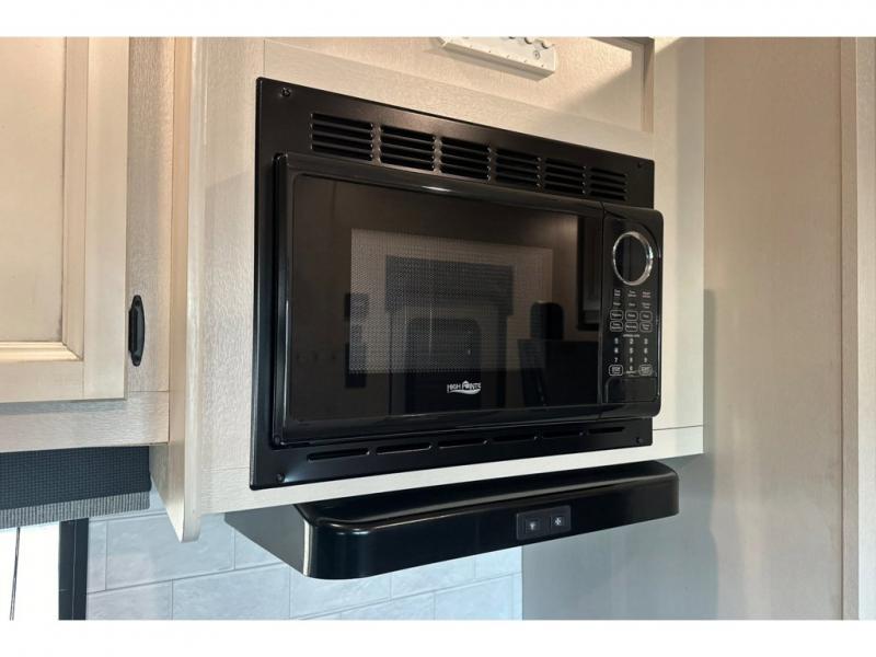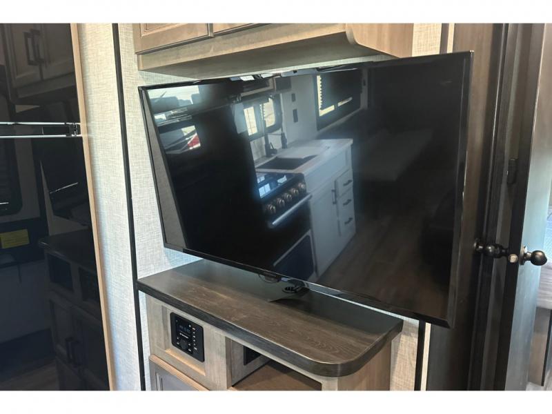 You will have everything you need for a comfortable camping trip in this toy hauler! Unload your off-road toy easily from the cargo area featuring up to 14' of space using the spring assist 8' ramp door for a fun day out on the trails. The fully equipped kitchen has a three burner cooktop to fry up some eggs in the morning, and you can enjoy them at either the flip-up bar top with two stools or at the rear convertible sofa and two chairs in the other side if the removable table. The dual entry bathroom is easy to access from the front private bedroom and it has a radius shower to wash the mud out of your hair.