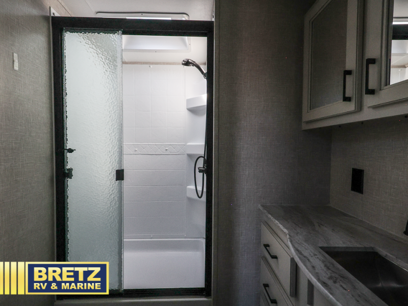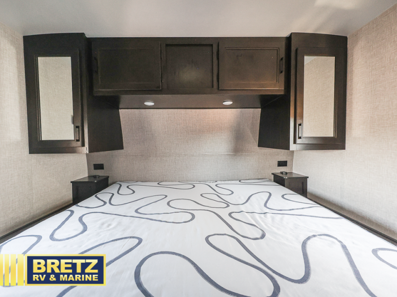 Cozy, comfortable and spacious are just a few of the adjectives you will be thinking about when you camp in this trailer! From the fireplace at the entertainment center to the theater seats, the rear tri-fold sofa and the booth dinette. The dual opposing slides in the main living and kitchen area create more walking around space. The kitchen includes appliances to make warm meals, an island with a sink to keep the dishes clean, a large pantry for lots of dry goods, and a hutch to store dishes, plus the outside kitchen gives the cook choices. There is a full bathroom, and a front bedroom with a king bed and a closet that is prepped to add an optional washer and dryer. You will find lots of features along the exterior as well such a two power awnings, a pass-through compartment, a sprayer hose and docking station to make camping more convenient.