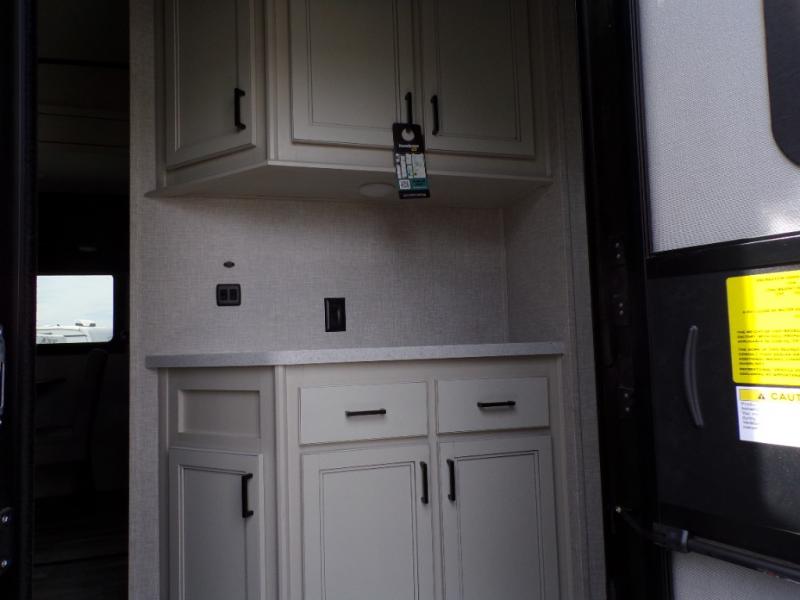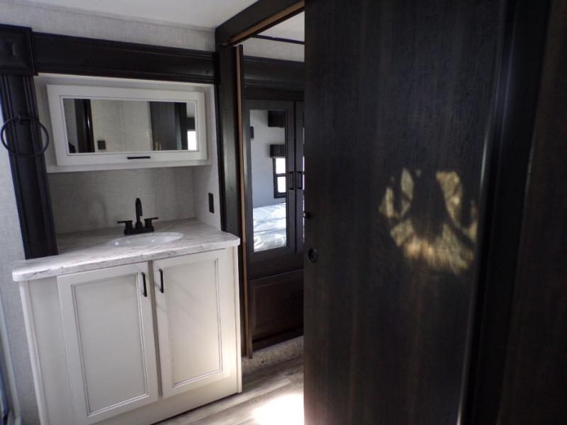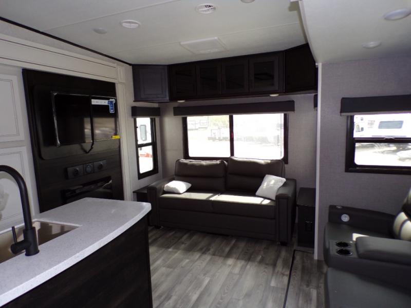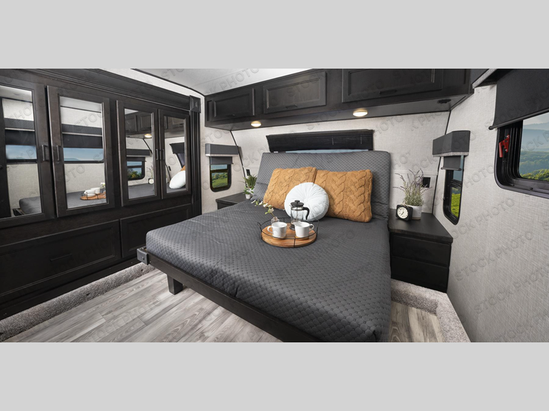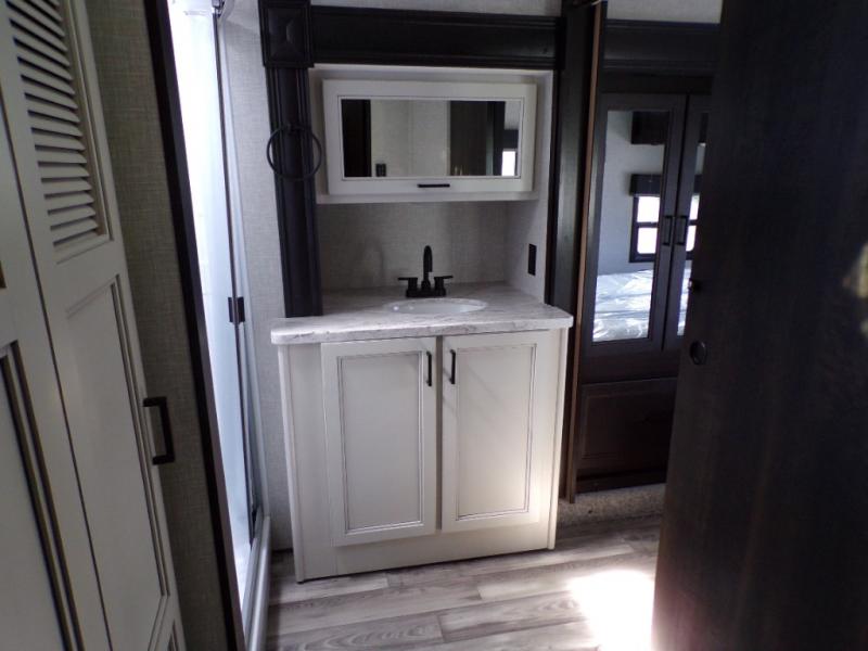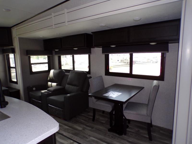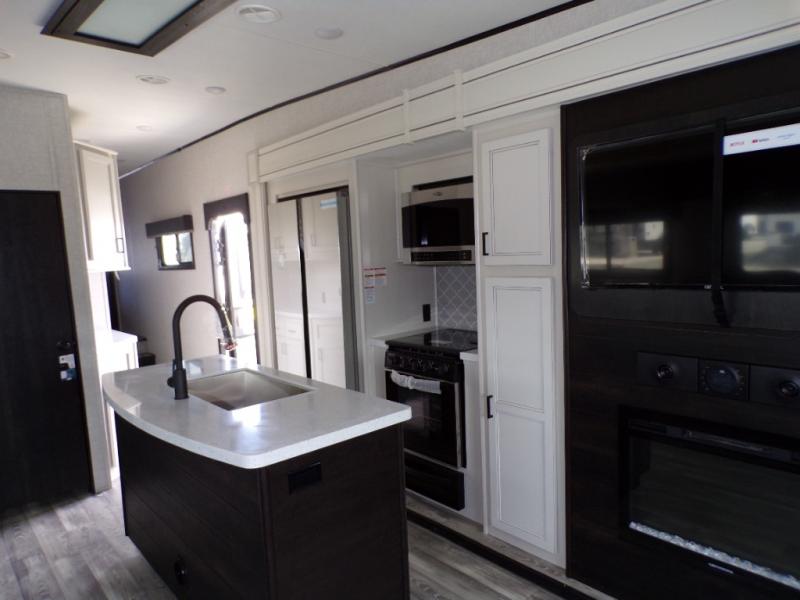 This fifth wheel is decked out with convenient features! Starting in the front private bedroom with the queen bed that has a power base, a wardrobe slide, and an entrance into the dual entry bathroom. The bathroom has a shower for you to freshen up in each morning and an area prepped to add an optional washer and dryer. The second bedroom has two entrances into it, a flip-up bunk above a dinette slide across from an entertainment center and a closet to keep your clothes out of the way. The chef can prepare their best meals indoors with the kitchen island and three burner cooktop or head to the outside kitchen and use the griddle. When mother nature rains on your parade you can either sit underneath one of the two power awnings or relax in the rear living area on either the tri-fold sofa or the theater seating across from the entertainment center with a fireplace and a 39" LED HDTV!