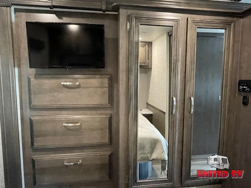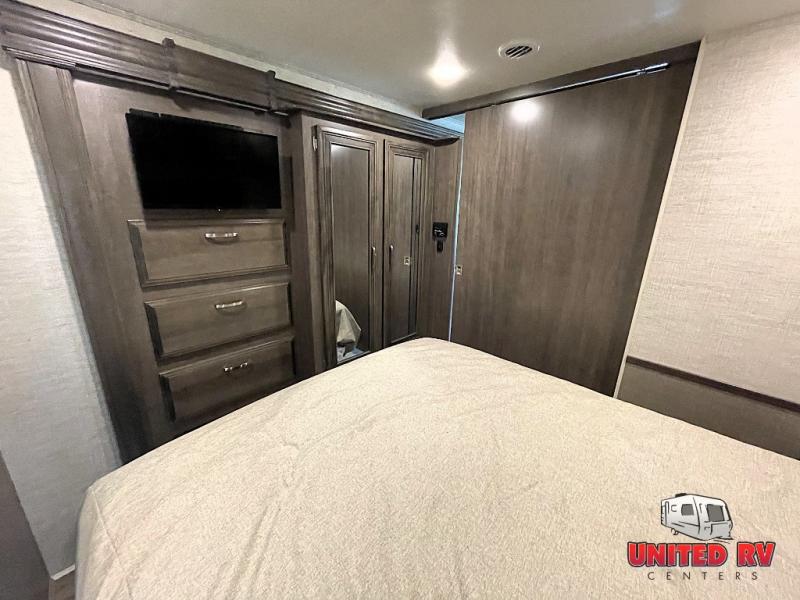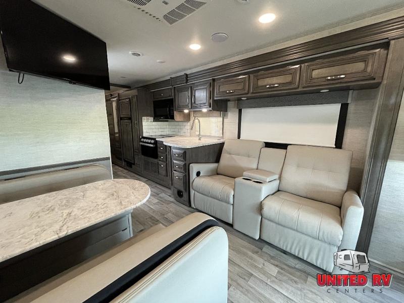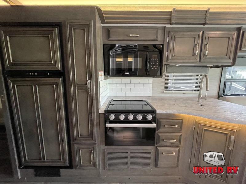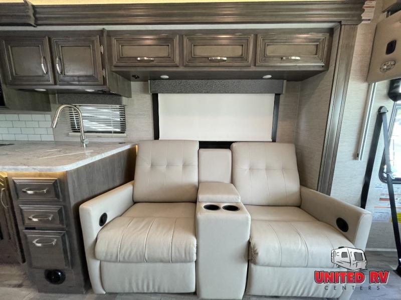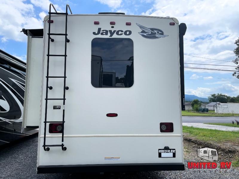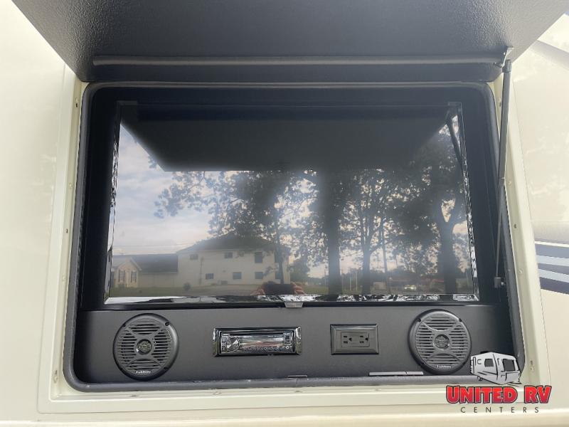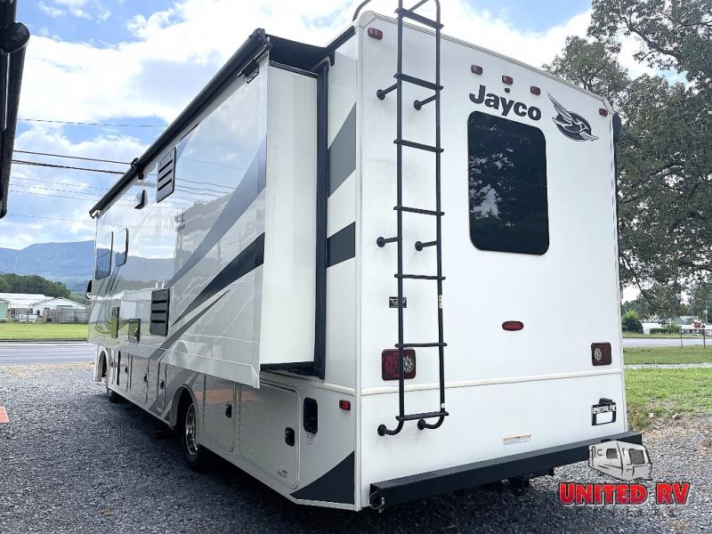 Travel to see new places and enjoy interior comforts as well as outdoor entertainment with this coach! After easily setting up the 23' electric awning you can relax and unwind while taking in the scenery or watching the the exterior LED HD Smart TV. The chef can utilize the outside kitchen or the full kitchen amenities inside such as an 8 cu. ft. refrigerator or choose the 12 cu. ft. option, the Furrion all-in-one cooktop and oven, plus a residential-size microwave, and there is a pop-up charging center. Enjoy privacy in the rear bedroom while you sleep on the walk-around queen bed, and add the TV option if you like. You will find seating in the main area on the Jayco-exclusive easy-operation legless dinette table, and the jack-knife sofa or choose the theater seating option, and the cockpit table gives you another surface to place your things while you sit in the driver and passenger seats that swivel. And maybe you add the drop down overhead bunk option for more sleeping space, it's your choice.