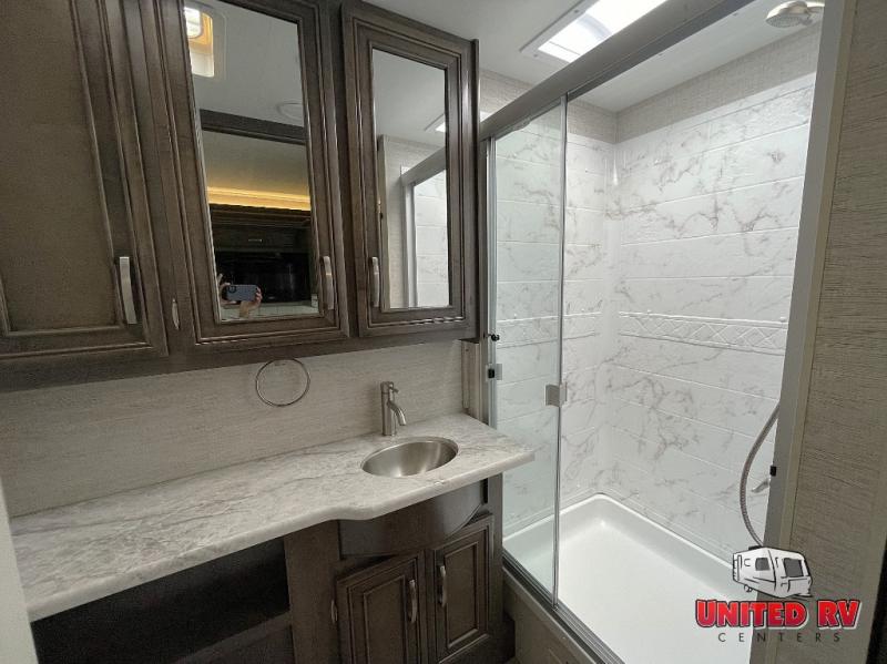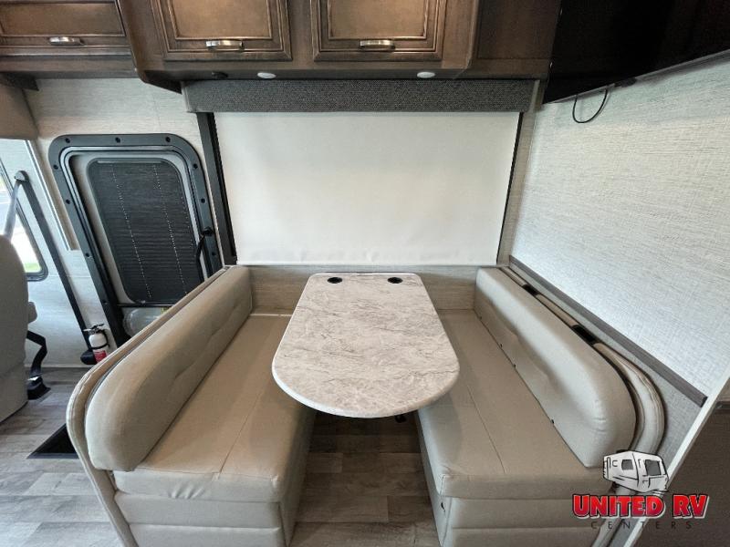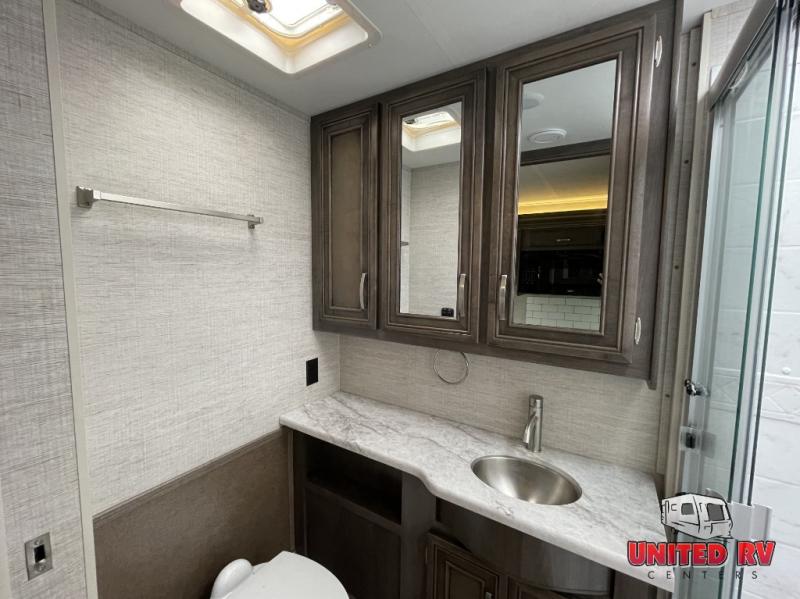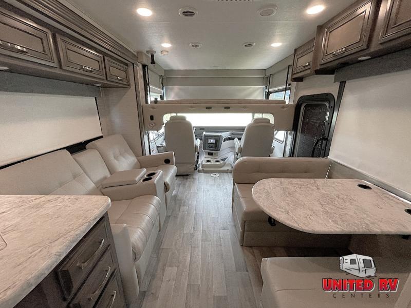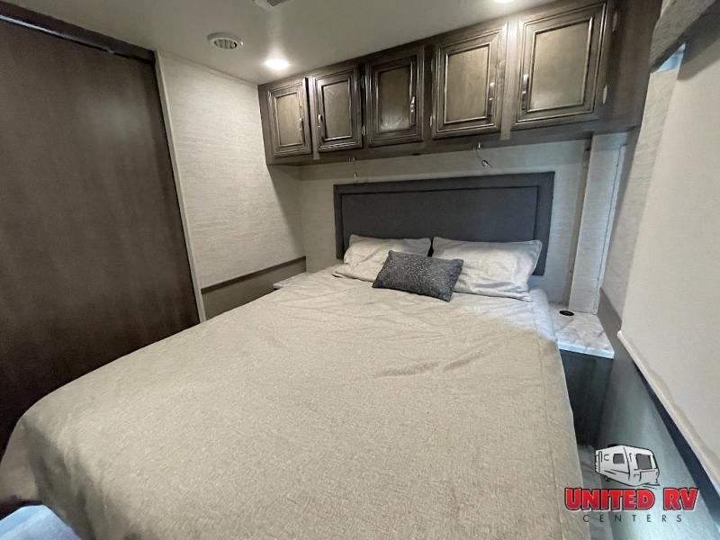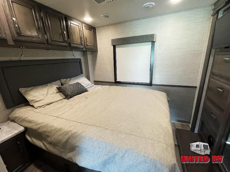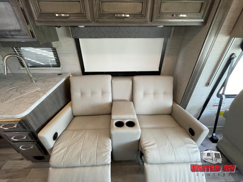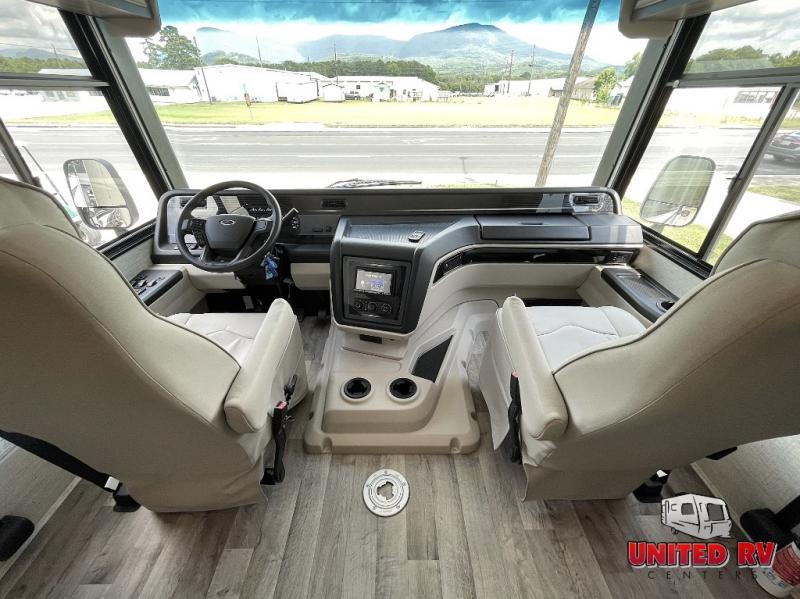With any Alante Class A gas motorhome by Jayco, the mandatory Customer Value package provides JRide technology with a computer-balanced driveshaft ensuring smooth and efficient power transfer to the wheels, the Bilstein steering stabilizer, and SACHS shock absorbers offering independent adjustments to the road conditions, plus a one-piece, seamless, crowned fiberglass roof, and an exterior entertainment center to watch shows and movies. The automatic hydraulic leveling jacks, the 120 in. panoramic windshield, the 190W solar panel, the entrance door with industry's largest travel-view window, and the electric-powered entrance step will make traveling that much easier. And the interior equipment includes a Sony infortainment center with Apple CarPlay and Android Auto, a backup and side-view cameras for easy parking, and a 6-way power driver seat for comfortable and safe driving, plus a power front privacy shade with manual side privacy shades, LED-lit hardwood fascia and countertops, a pop-up charging station in the kitchen and a USB port and wireless charging in the nightstands.