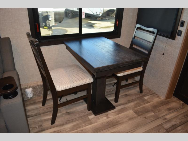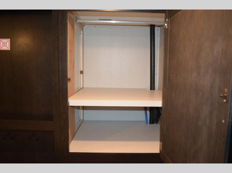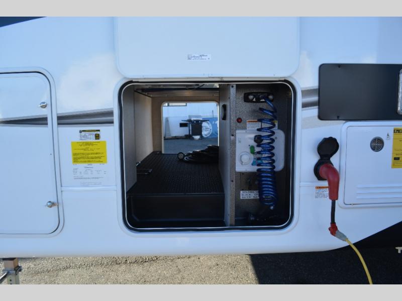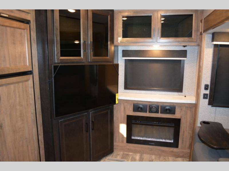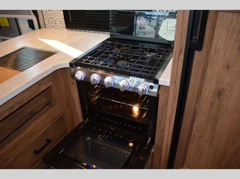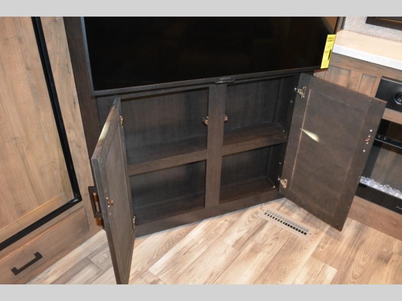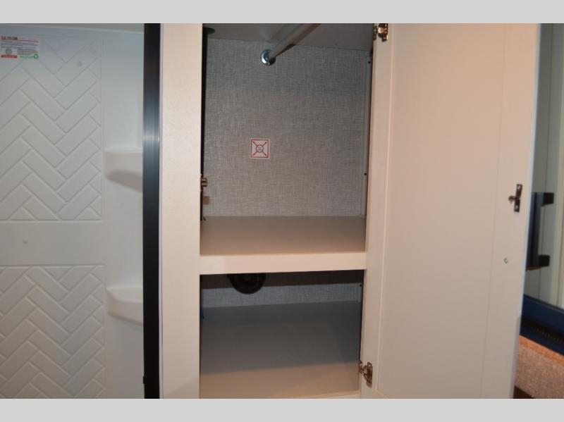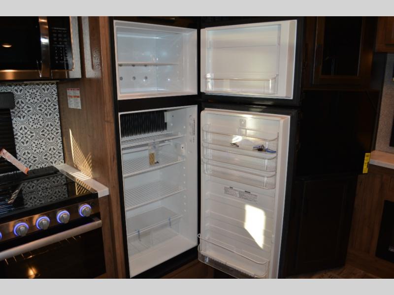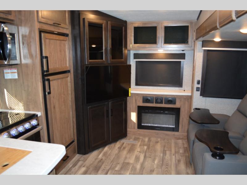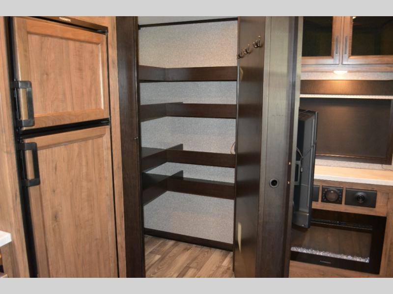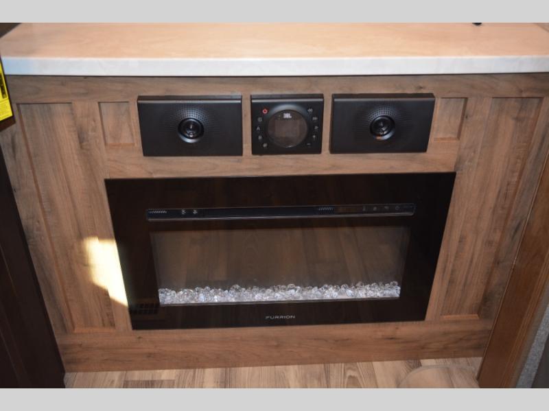 This travel trailer is perfect for two people with a passion for camping! Start each morning feeling well rested after sleeping on the queen bed in the front private bedroom and it has wardrobes on either side of it, plus a wardrobe/linen closet with washer and dryer prep. Grab some eggs from the refrigerator and fry them up on the three burner stainless steel range then enjoy them at the free standing table and chairs. Behind the entertainment center is a walk-in pantry to store your favorite snacks and enjoy them while you relax on the tri-fold sofa. You can even add the optional fireplace to make your evenings cozier!