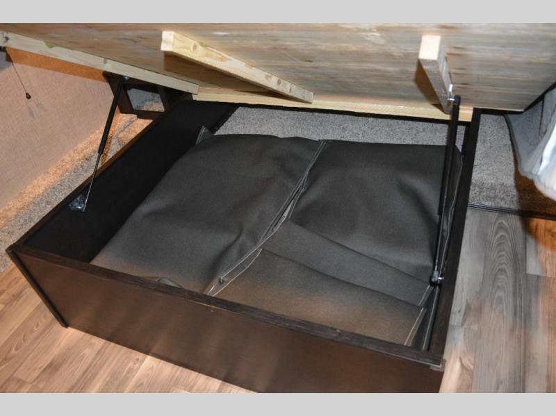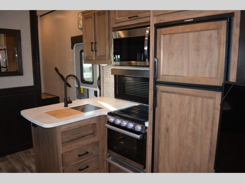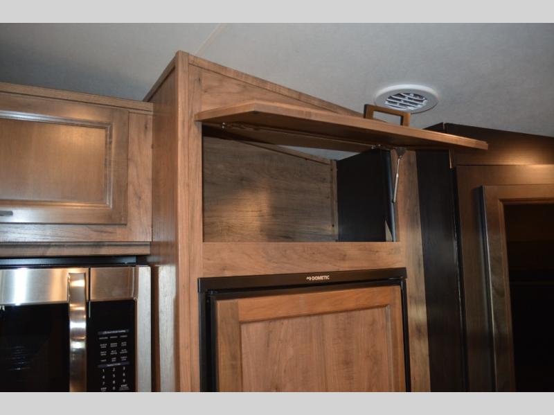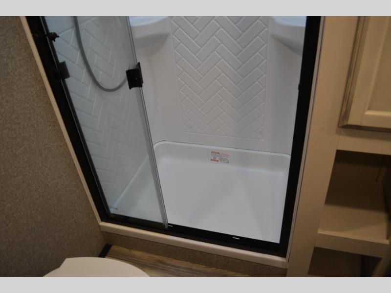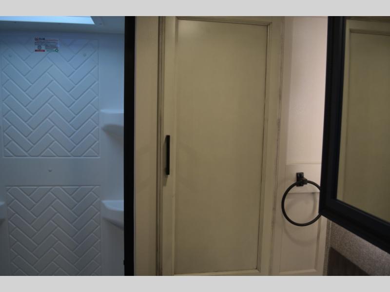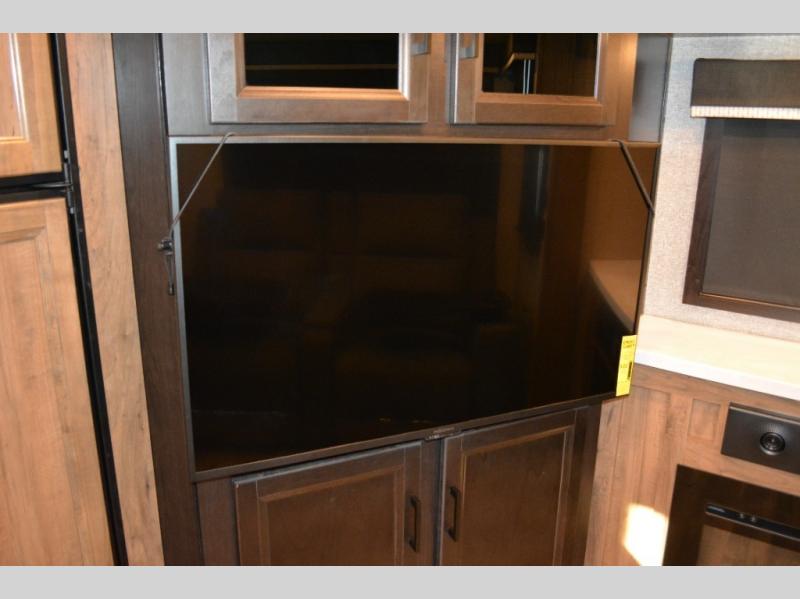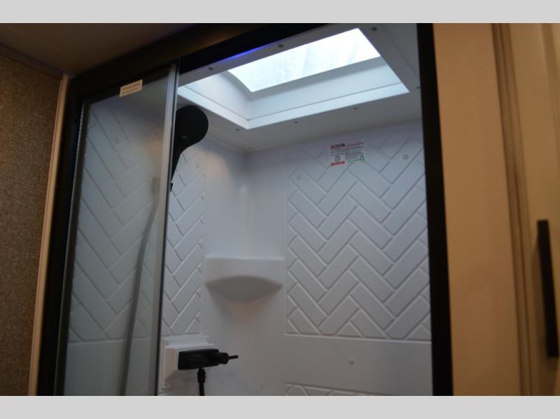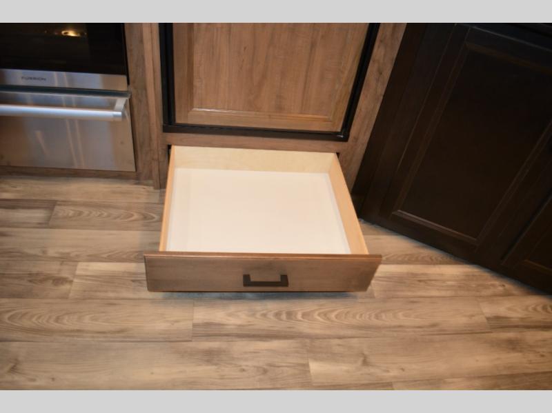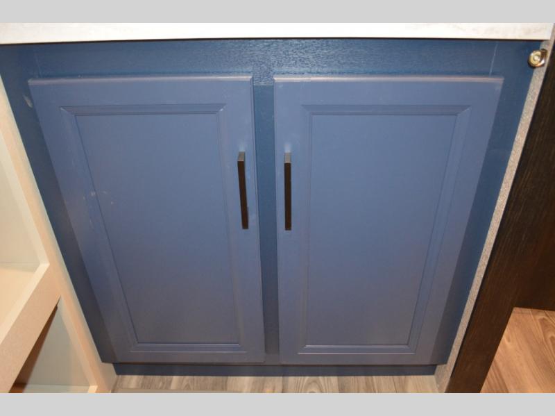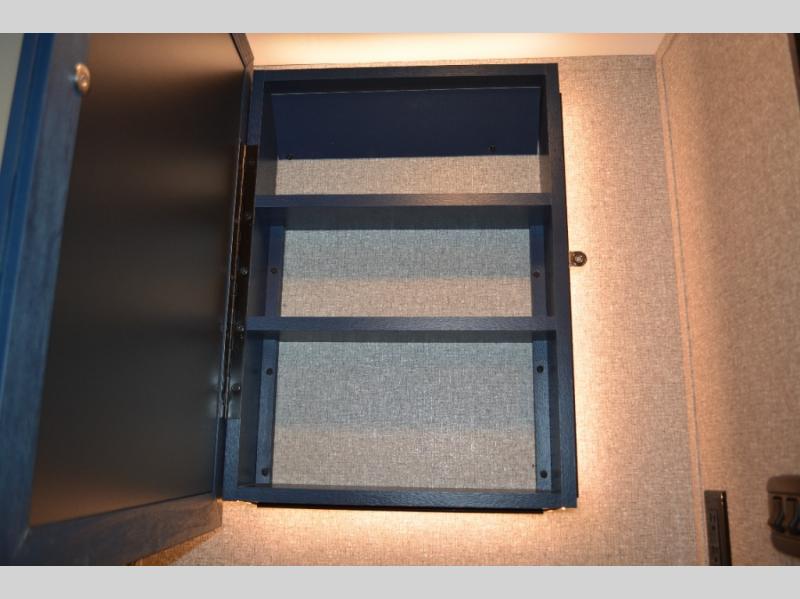 This travel trailer is perfect for two people with a passion for camping! Start each morning feeling well rested after sleeping on the queen bed in the front private bedroom and it has wardrobes on either side of it, plus a wardrobe/linen closet with washer and dryer prep. Grab some eggs from the refrigerator and fry them up on the three burner stainless steel range then enjoy them at the free standing table and chairs. Behind the entertainment center is a walk-in pantry to store your favorite snacks and enjoy them while you relax on the tri-fold sofa. You can even add the optional fireplace to make your evenings cozier!