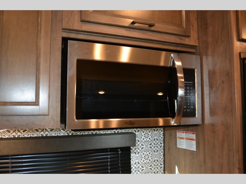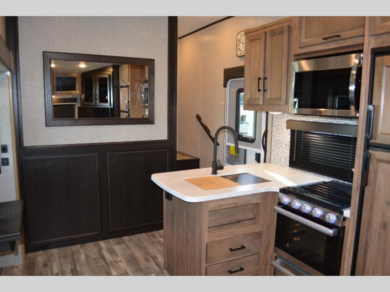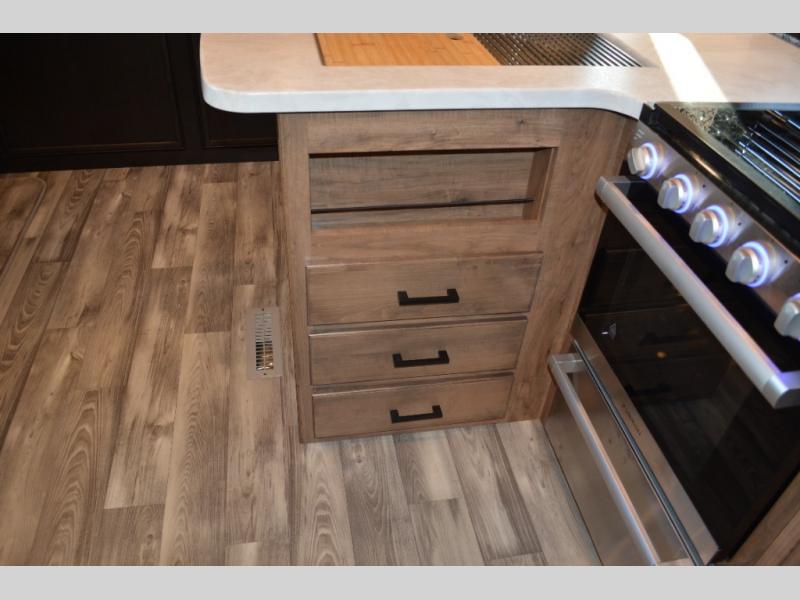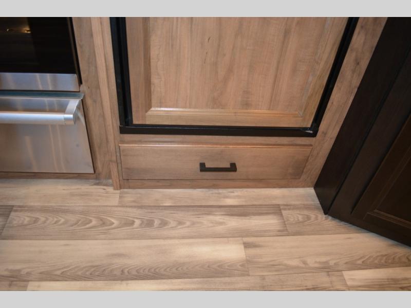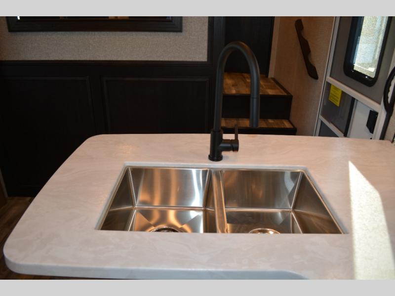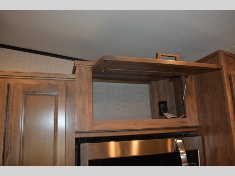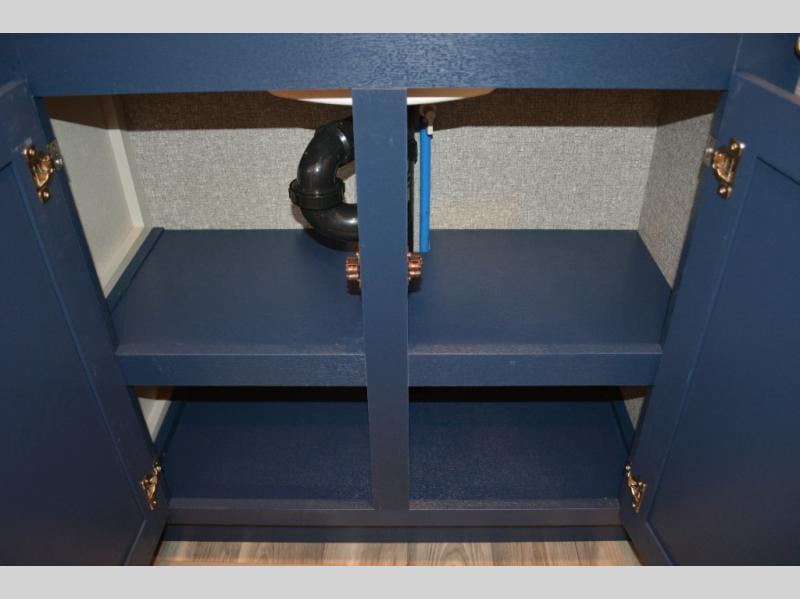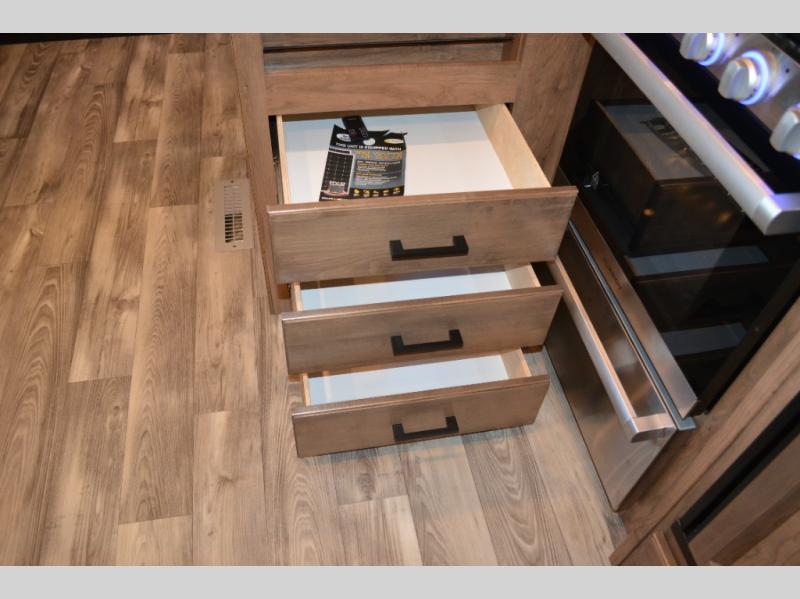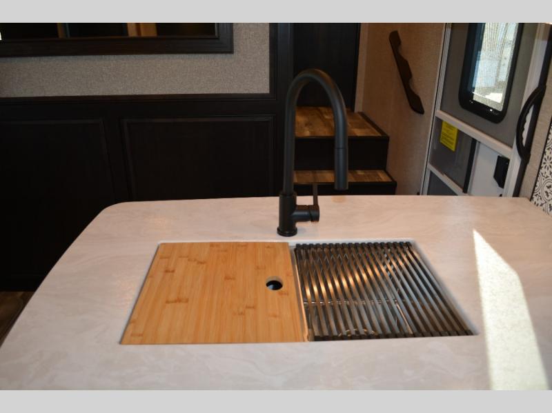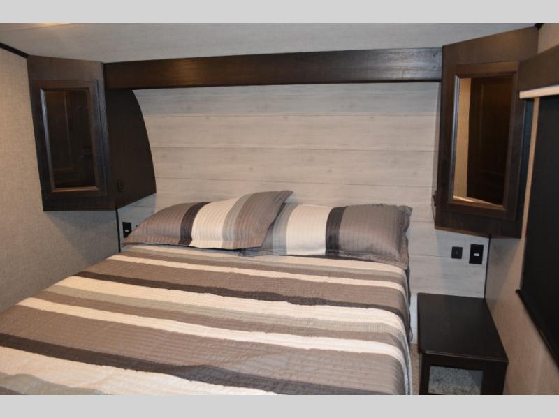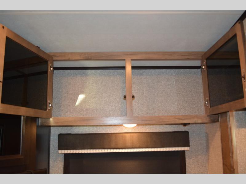 This travel trailer is perfect for two people with a passion for camping! Start each morning feeling well rested after sleeping on the queen bed in the front private bedroom and it has wardrobes on either side of it, plus a wardrobe/linen closet with washer and dryer prep. Grab some eggs from the refrigerator and fry them up on the three burner stainless steel range then enjoy them at the free standing table and chairs. Behind the entertainment center is a walk-in pantry to store your favorite snacks and enjoy them while you relax on the tri-fold sofa. You can even add the optional fireplace to make your evenings cozier!