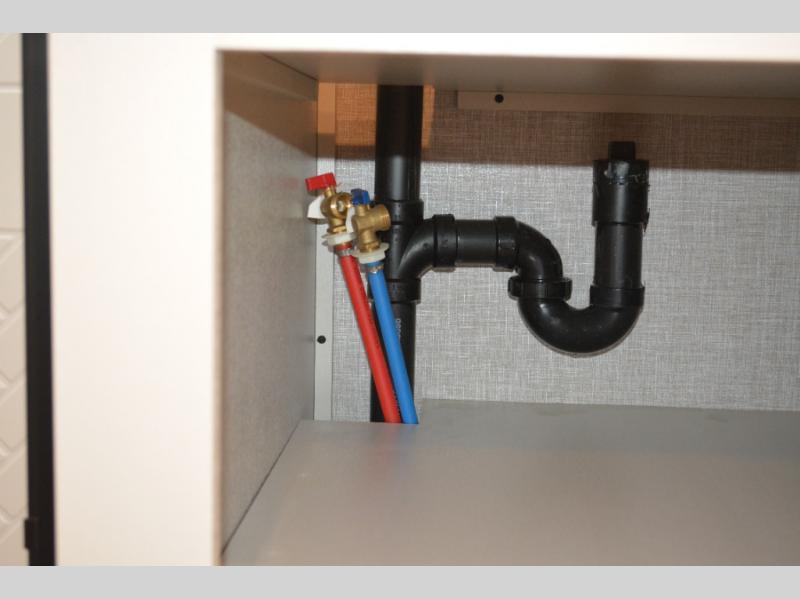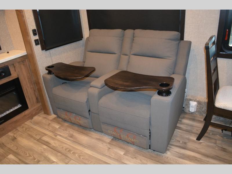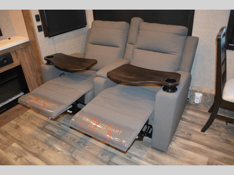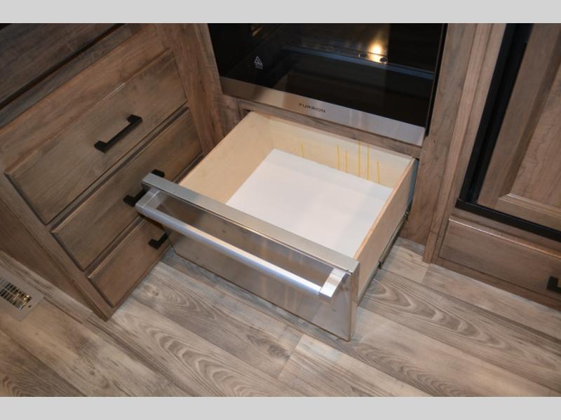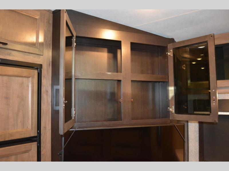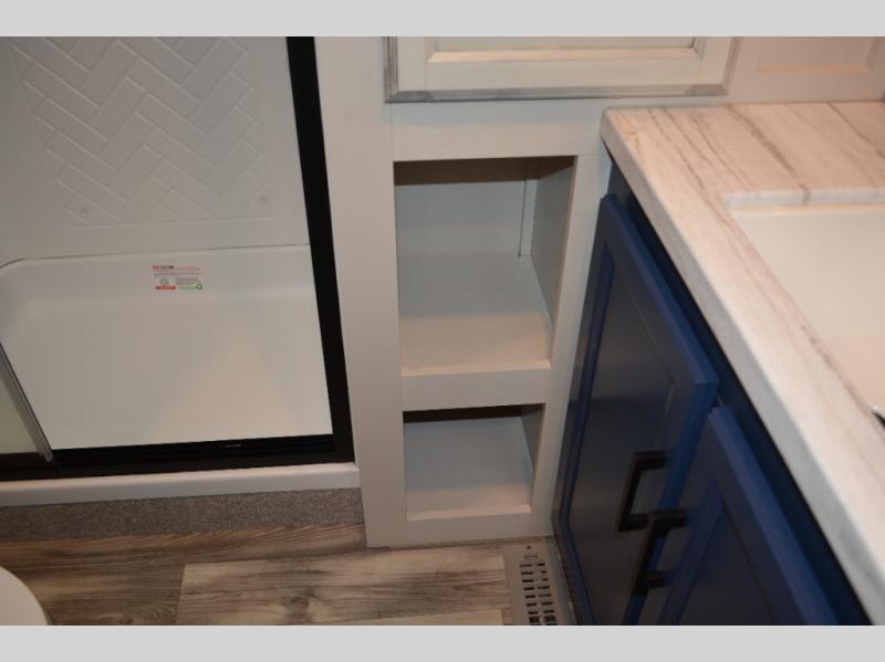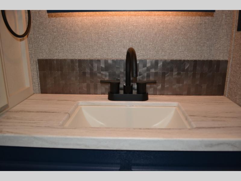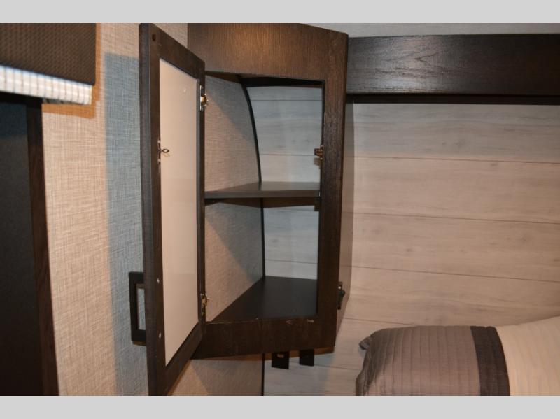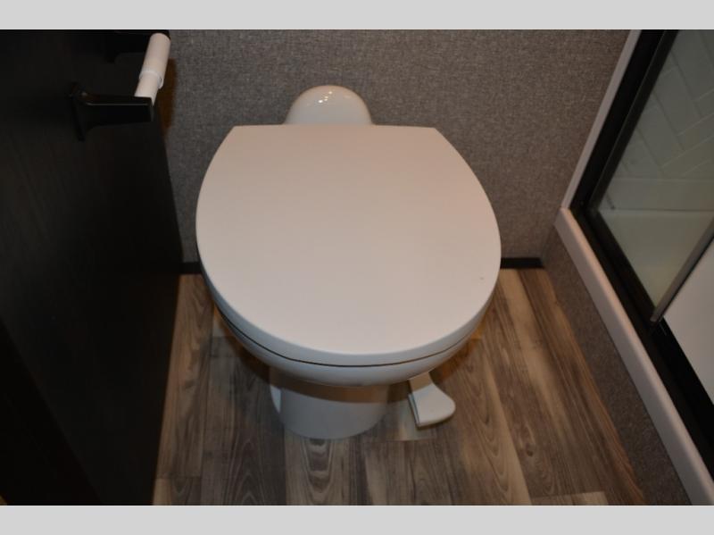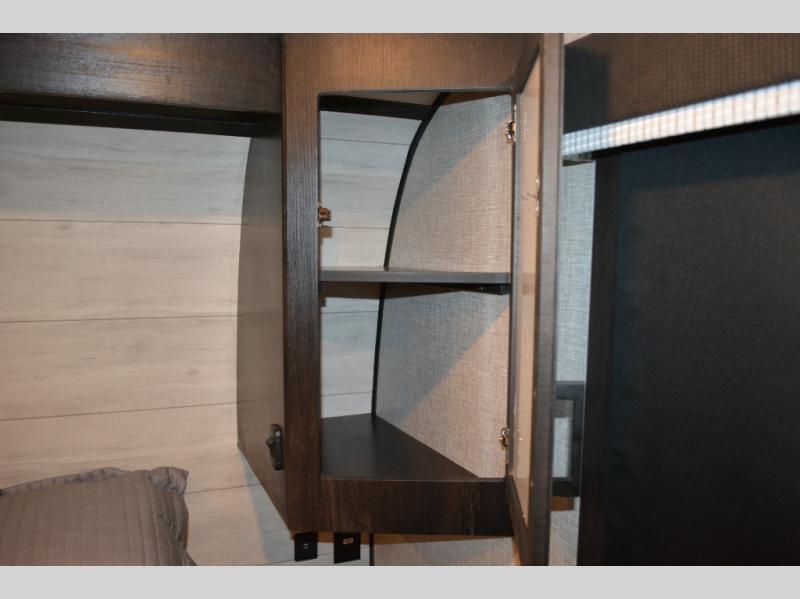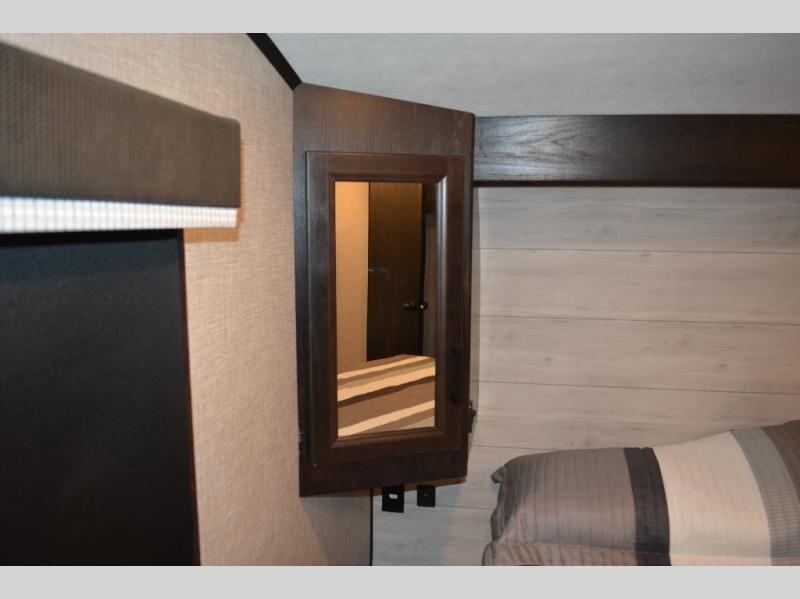 This travel trailer is perfect for two people with a passion for camping! Start each morning feeling well rested after sleeping on the queen bed in the front private bedroom and it has wardrobes on either side of it, plus a wardrobe/linen closet with washer and dryer prep. Grab some eggs from the refrigerator and fry them up on the three burner stainless steel range then enjoy them at the free standing table and chairs. Behind the entertainment center is a walk-in pantry to store your favorite snacks and enjoy them while you relax on the tri-fold sofa. You can even add the optional fireplace to make your evenings cozier!