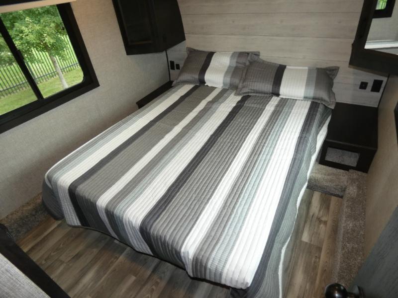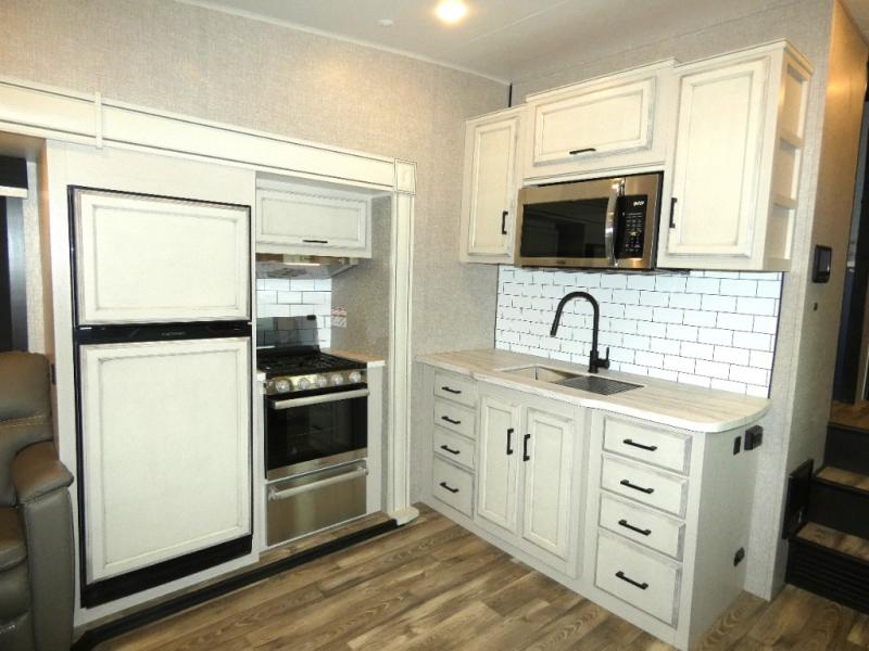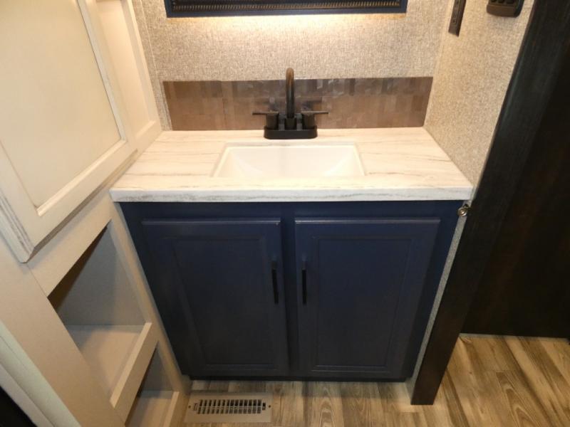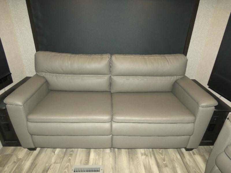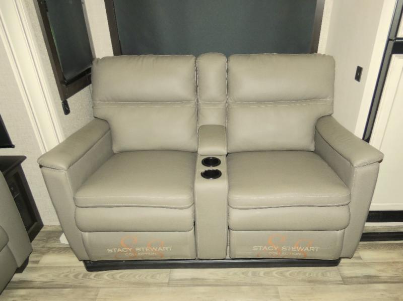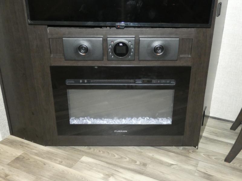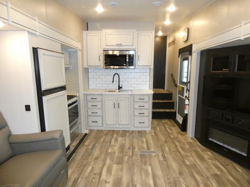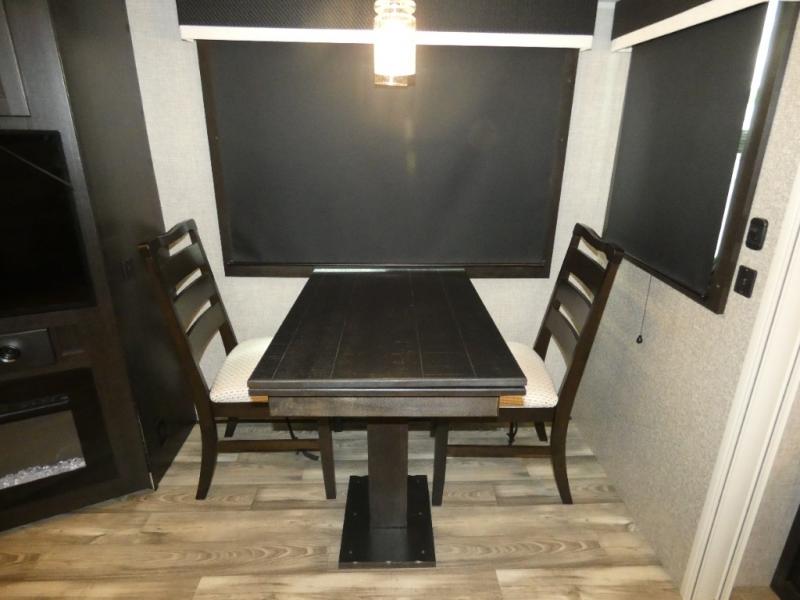 Experience comfort and convenience all throughout this fifth wheel from the queen bed in the front private bedroom to the two rear recliners and walk-in pantry! There is also a hinged entertainment center with a fireplace for those chilly evenings. There is plenty of countertop space in the kitchen for you to prepare your best meals and a free standing table and chairs to enjoy them at then play a card game. The tri-fold sofa is not only a comfortable place to take an afternoon nap, but also for transforming into an extra sleeping space for a guest or two. Everyone can freshen up in the full bathroom with the 30" x 36" shower each morning too!