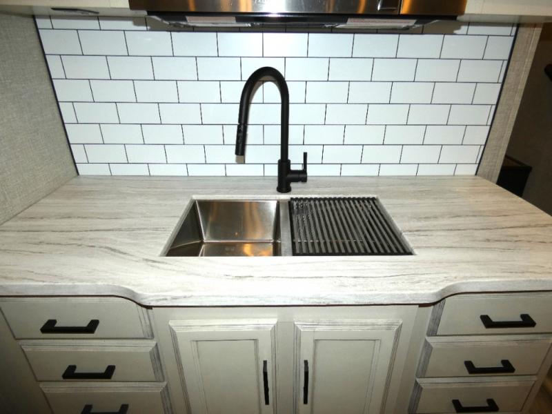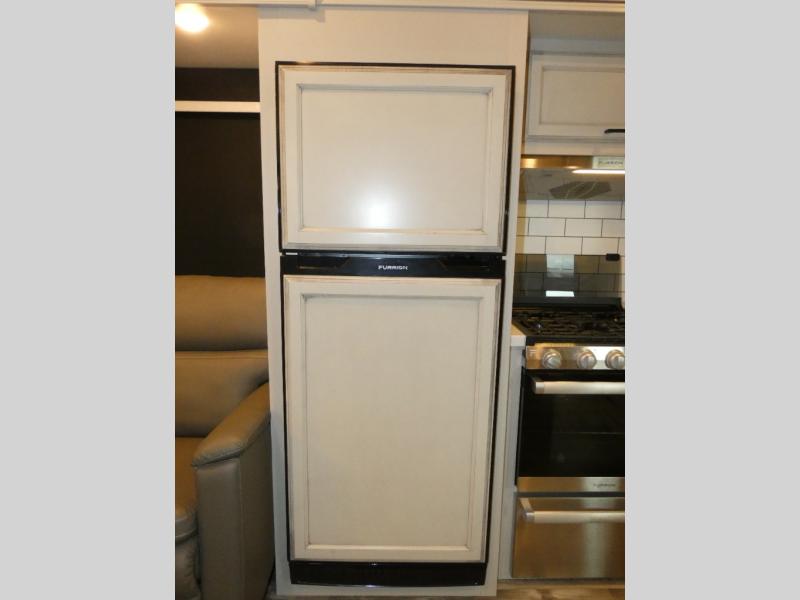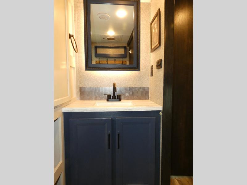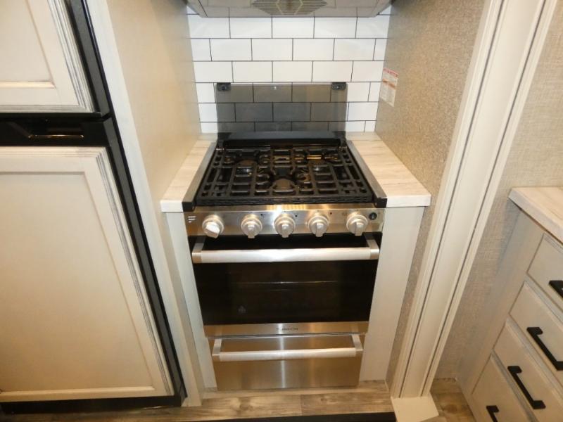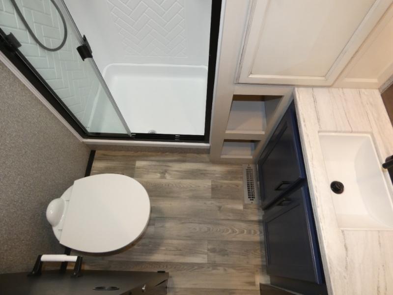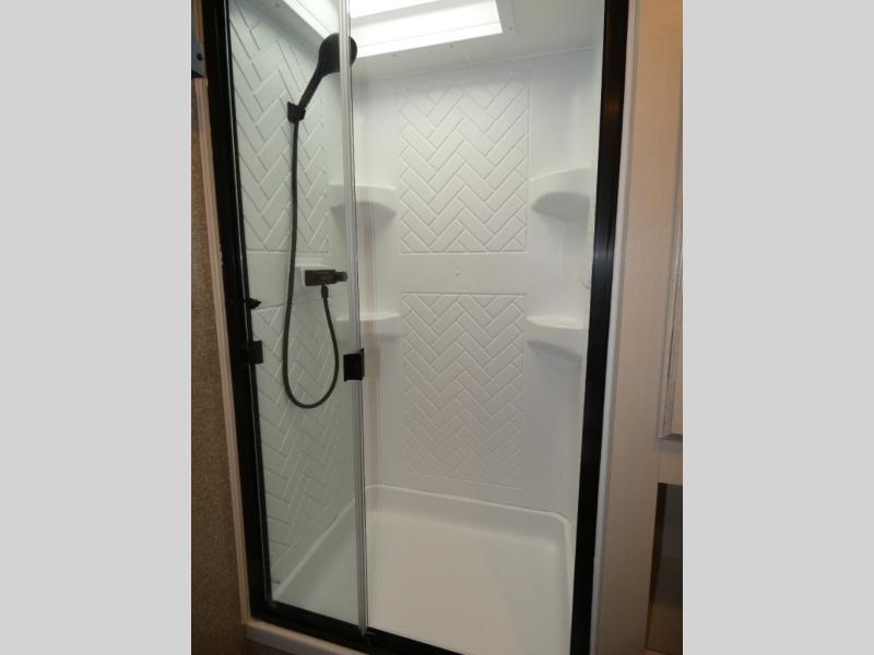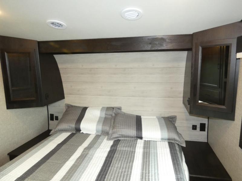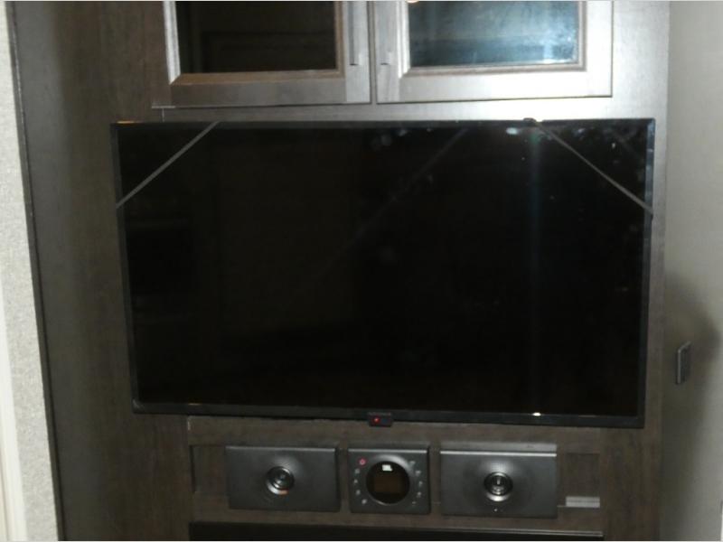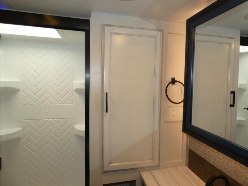Experience comfort and convenience all throughout this fifth wheel from the queen bed in the front private bedroom to the two rear recliners and walk-in pantry! There is also a hinged entertainment center with a fireplace for those chilly evenings. There is plenty of countertop space in the kitchen for you to prepare your best meals and a free standing table and chairs to enjoy them at then play a card game. The tri-fold sofa is not only a comfortable place to take an afternoon nap, but also for transforming into an extra sleeping space for a guest or two. Everyone can freshen up in the full bathroom with the 30" x 36" shower each morning too!