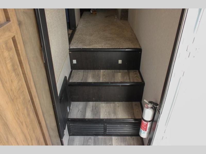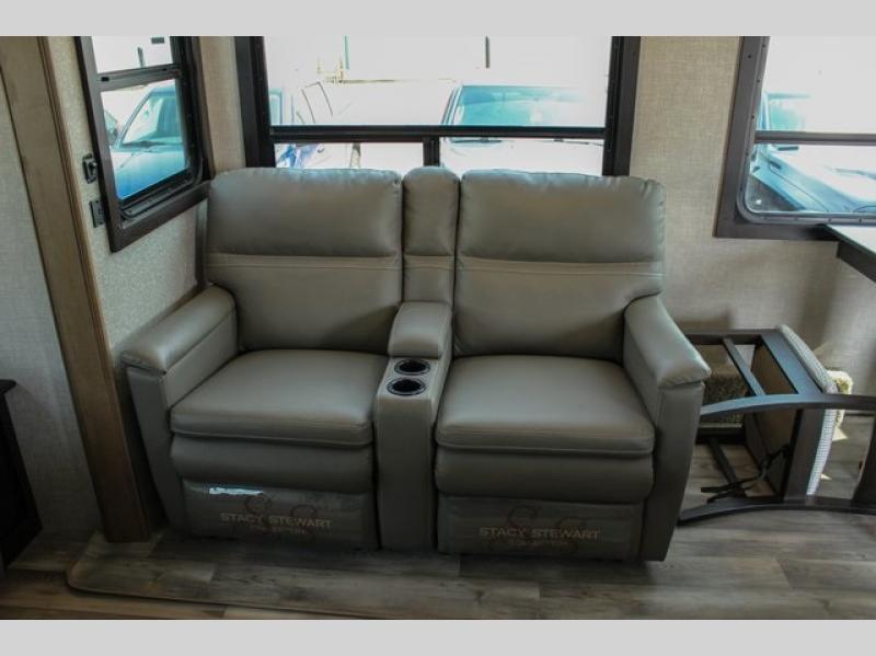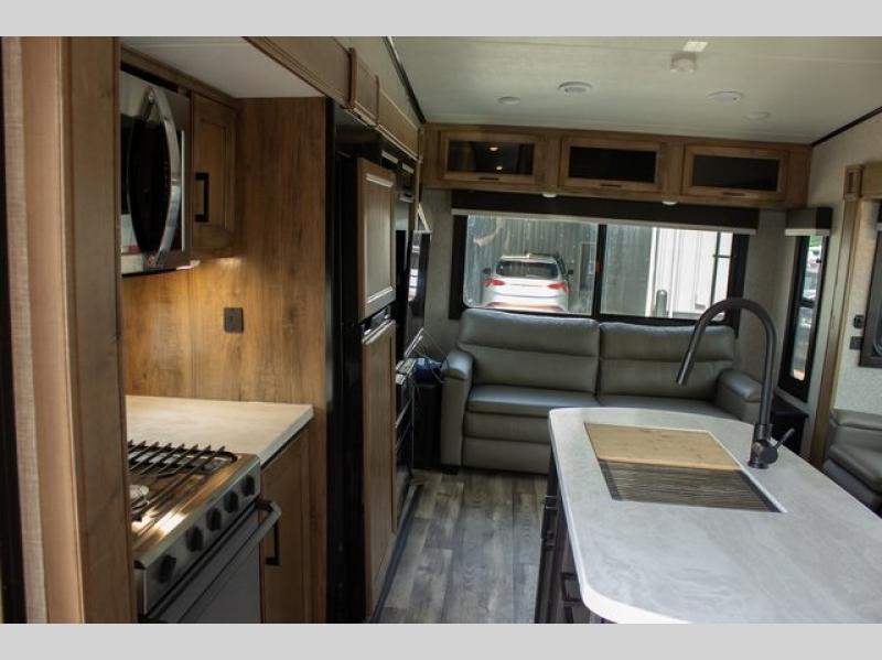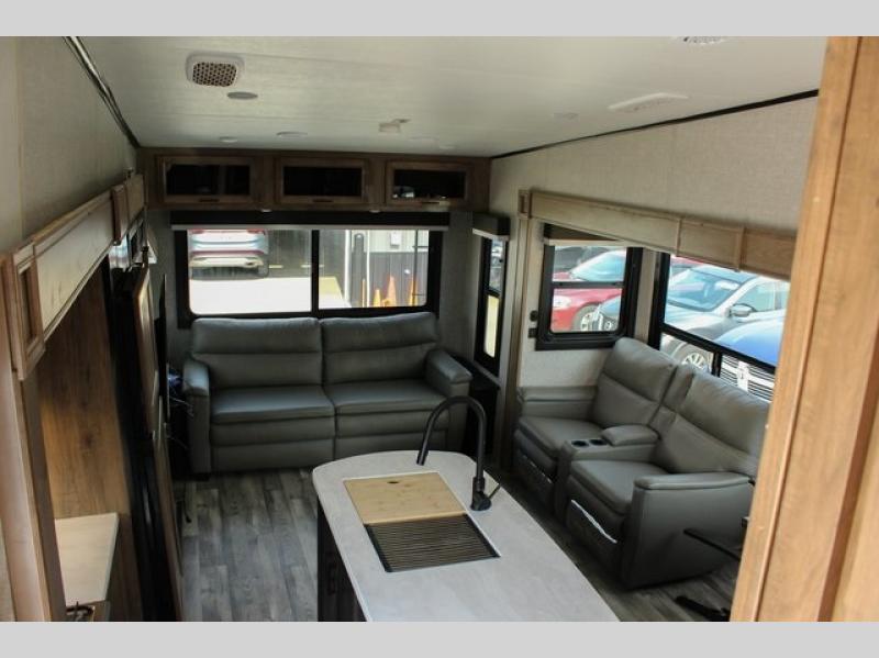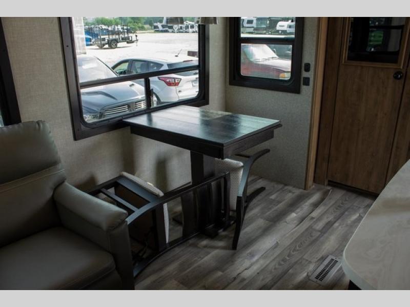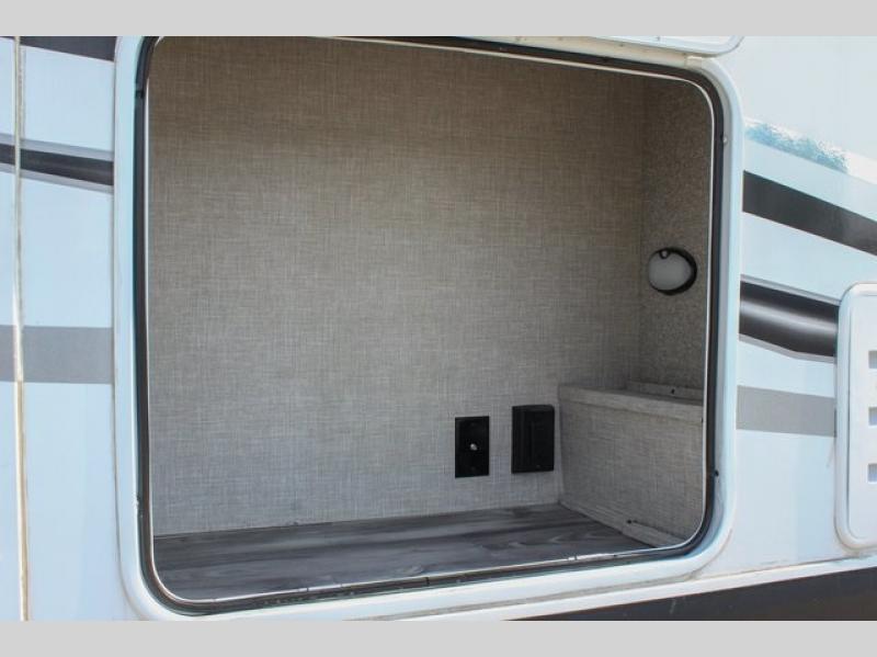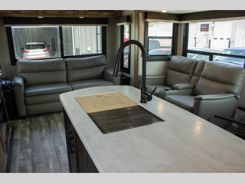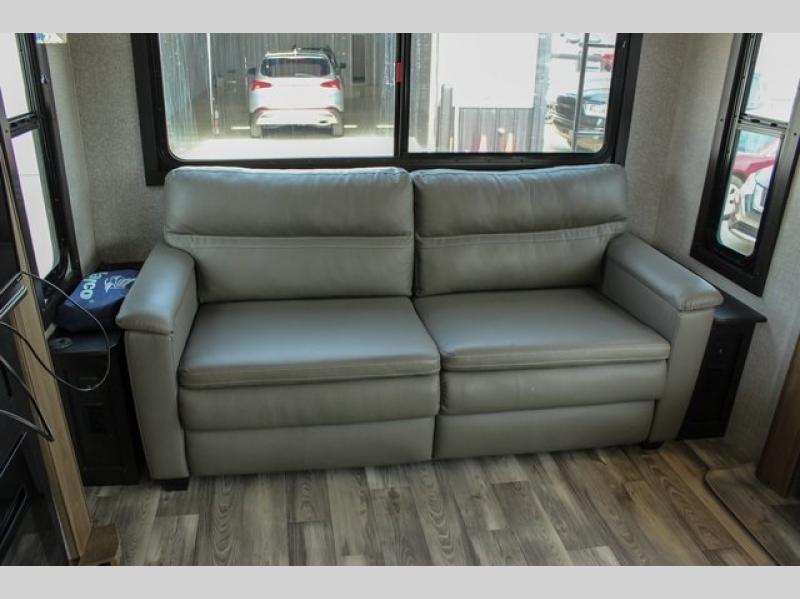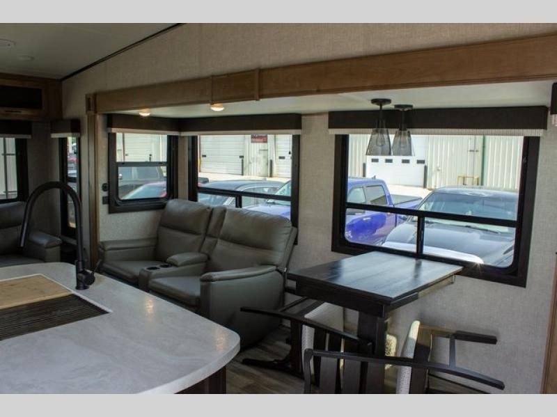 You're going to feel right at home in this fifth wheel! The kitchen island makes your meal prepping easier and you can enjoy your meals at the free standing table and chairs. There is plenty of storage space throughout between the overhead cabinets, the entry wardrobe, the kitchen pantry, and the wardrobe/linen closet in the front private bedroom. The bedroom also has a queen bed with wardrobes and nightstands on either side to set your glass of water or phone. After a fun day of exploring, you can freshen up in the full bathroom with the shower and then relax in the rear living area on either the tri-fold sofa or the theater seating across from the entertainment center which has an optional fireplace to add for even more comfort!