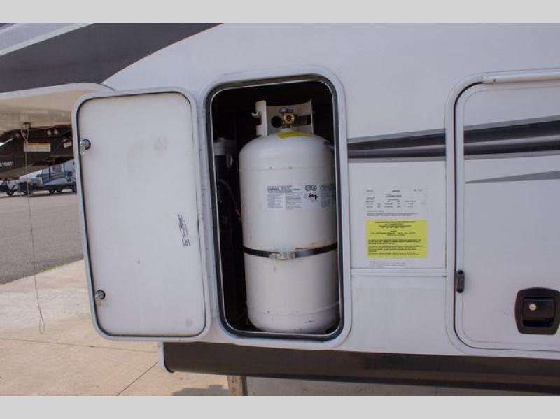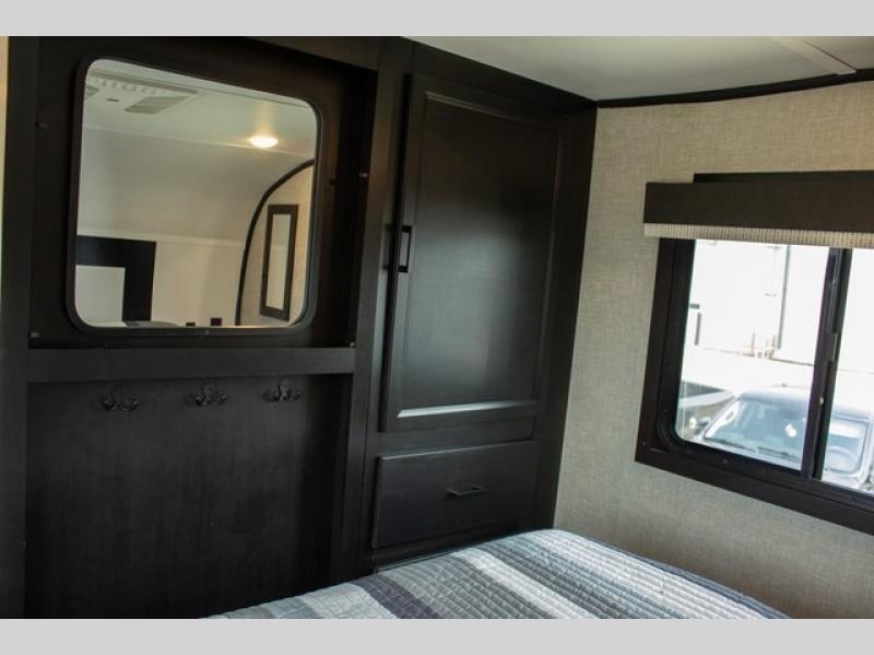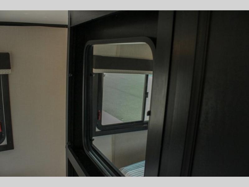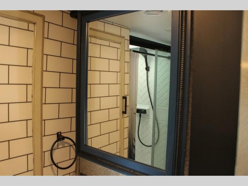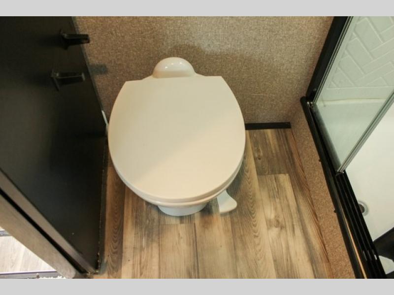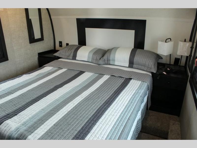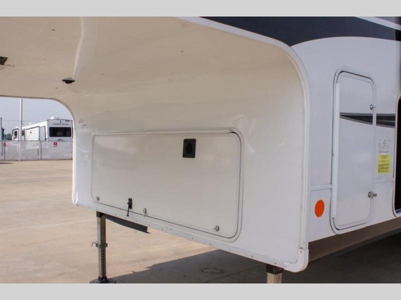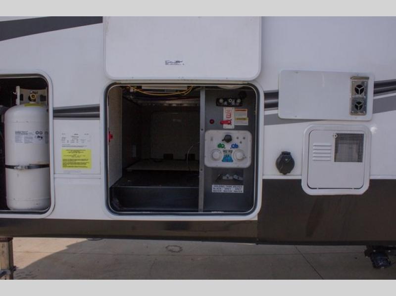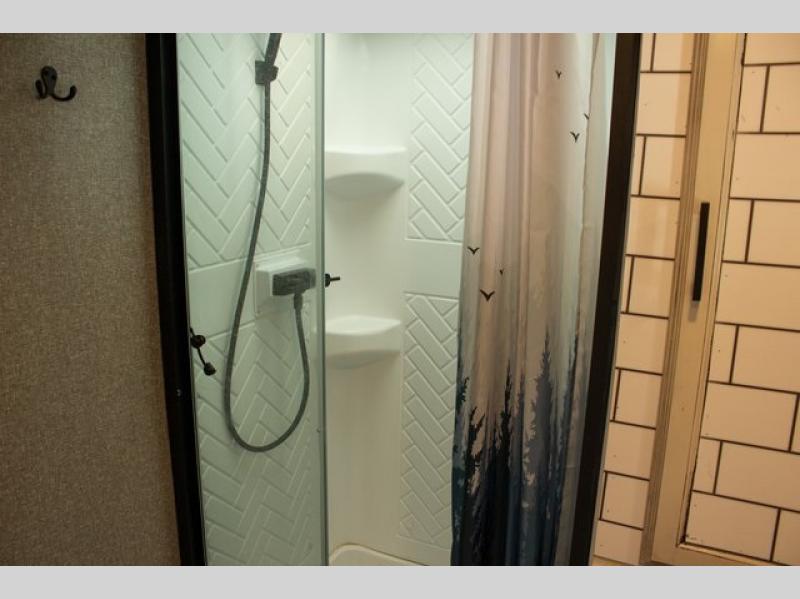 You're going to feel right at home in this fifth wheel! The kitchen island makes your meal prepping easier and you can enjoy your meals at the free standing table and chairs. There is plenty of storage space throughout between the overhead cabinets, the entry wardrobe, the kitchen pantry, and the wardrobe/linen closet in the front private bedroom. The bedroom also has a queen bed with wardrobes and nightstands on either side to set your glass of water or phone. After a fun day of exploring, you can freshen up in the full bathroom with the shower and then relax in the rear living area on either the tri-fold sofa or the theater seating across from the entertainment center which has an optional fireplace to add for even more comfort!