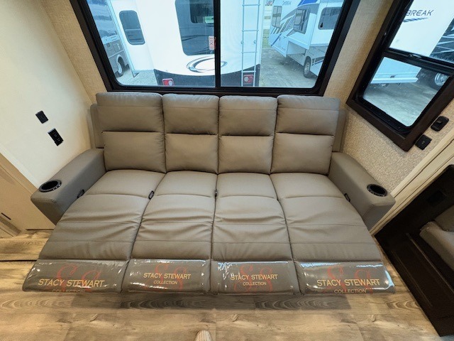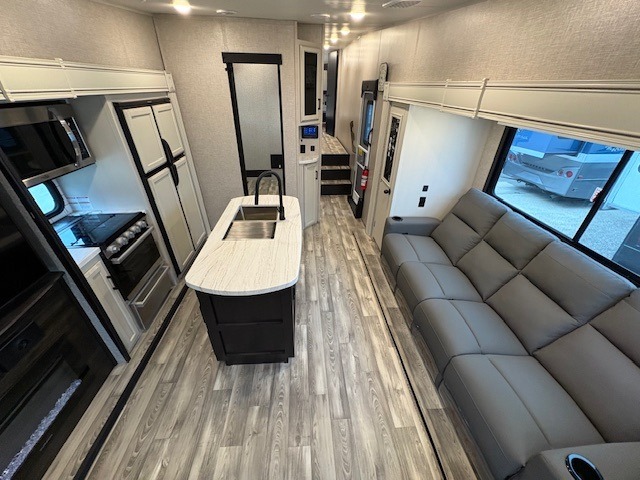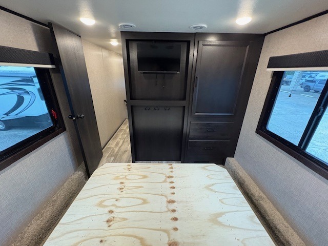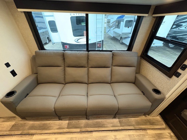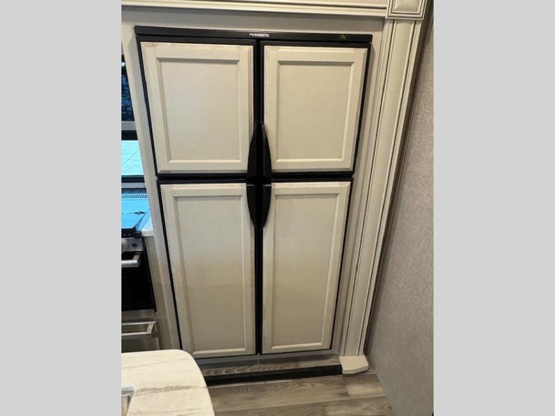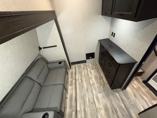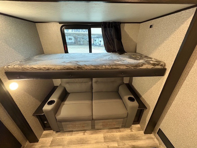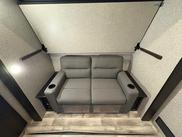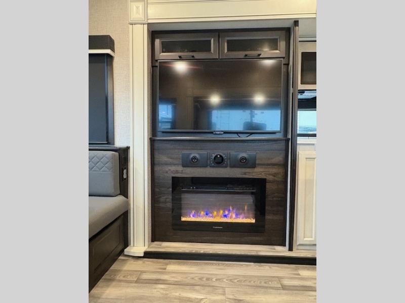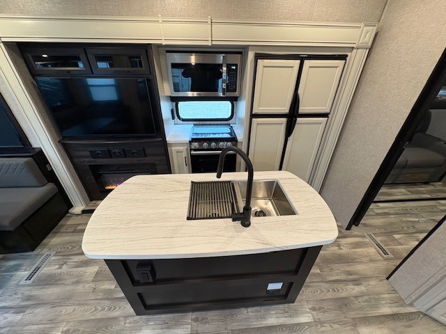 With a front bedroom and a middle bunkhouse, everyone will have a comfortable place to sleep! The front private bedroom has a queen bed with wardrobes on either side and a wardrobe/linen closet, and the dual entry bunkhouse has a 30" x 74" flip-top bunk above a tri-fold sofa and a dresser with overhead cabinets for storage. The kitchen island will make meal prepping easier and you can even cook your meals at the outside kitchen. Grab a snack from one of the two pantries then relax on the theater sofa while watching a movie with the entertainment center which also has a fireplace. The rear U-shaped dinette is great for not only enjoying meals and playing card games, but also for transforming into an extra sleeping space so more can tag along!