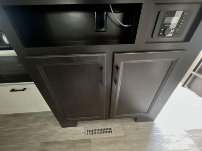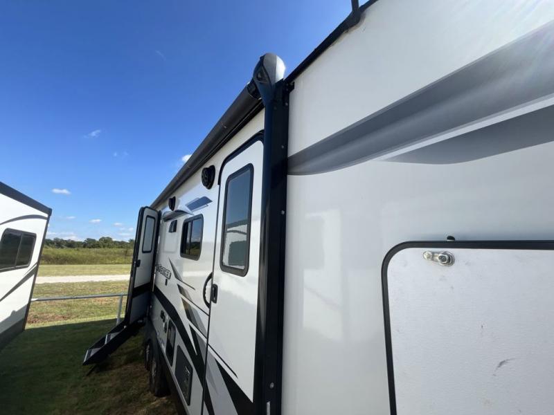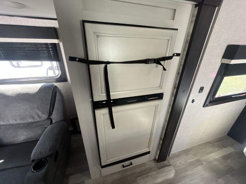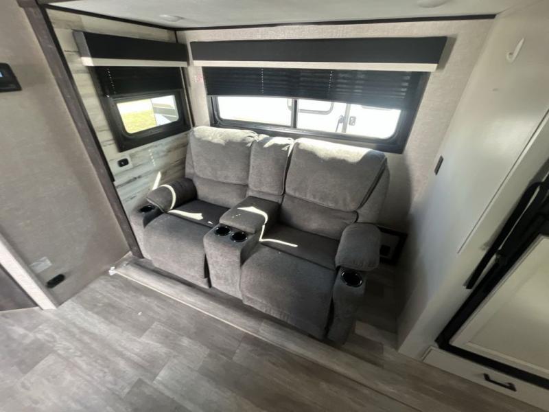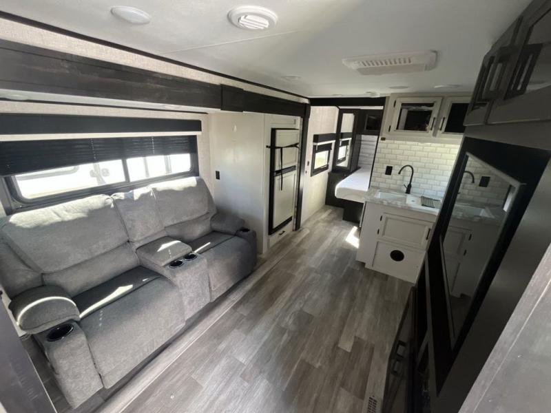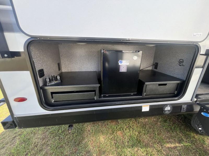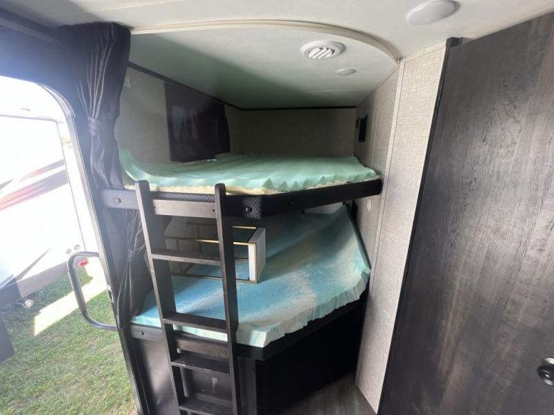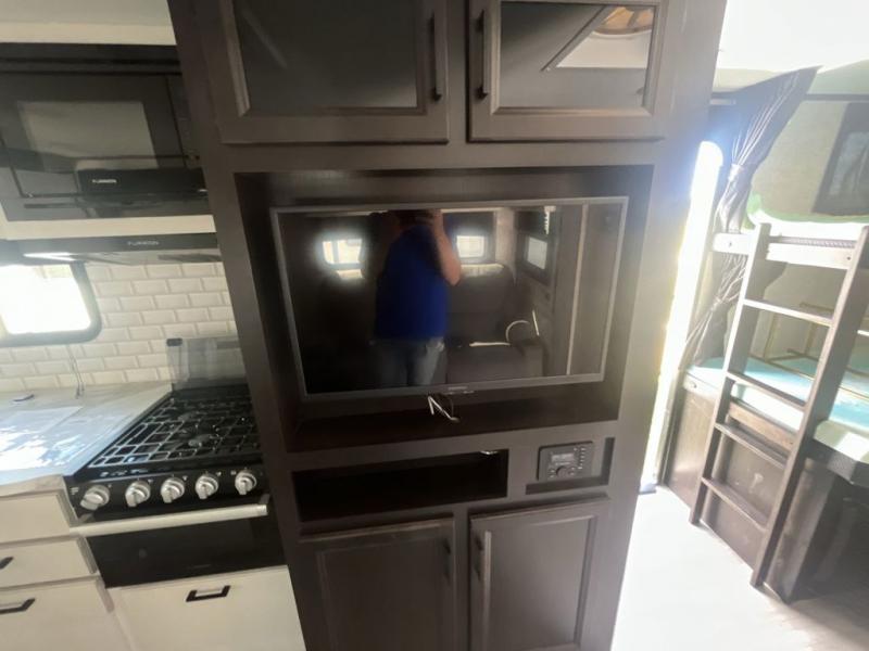 There is so much to love about this trailer from the double-size bunks in the rear with a ladder for easy access, plus the cargo door that allows you to stow larger items from the exterior to the interior underneath the bunks. You also have exterior storage compartments for outdoor gear. And the cook can choose to make meals using the outside kitchen including a fridge to store some cold items or the inside kitchen with full amenities including an 8 cu. ft. refrigerator and a flip-up counter for more space to prepare meals and dry the dishes. The walk-in pantry is a nice feature as well especially when you have a big crew. There is a private bedroom up front with the second exterior entry and a queen bed, plus the main area offers a U-shaped dinette and LED Smart TV to watch. And you might like to add a few options such as theater seats in place of the dinette, 12V heated tank pads if you plan to camp often in the cold weather, and/or the Solar Power package if you like staying off-grid.