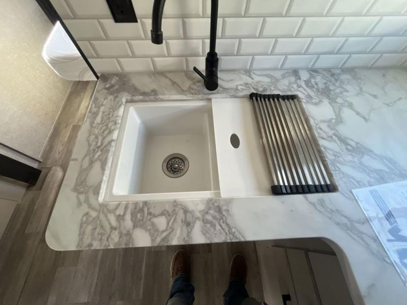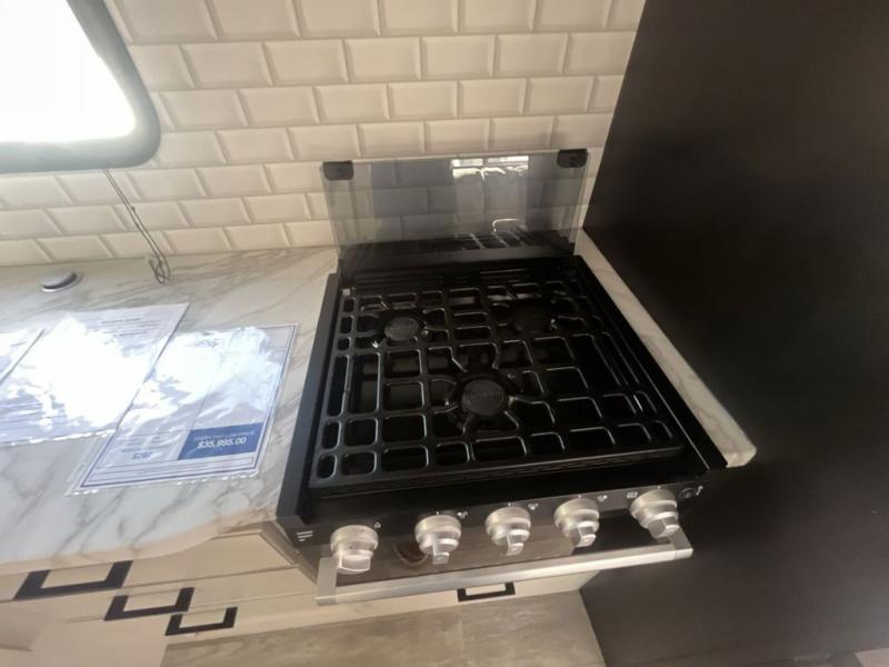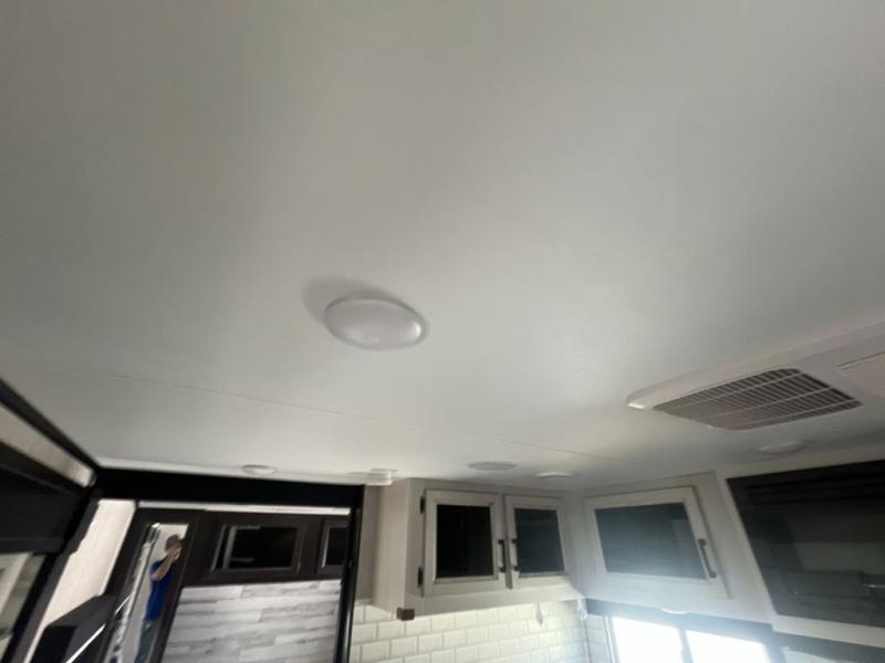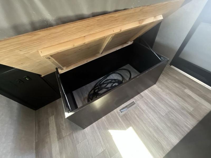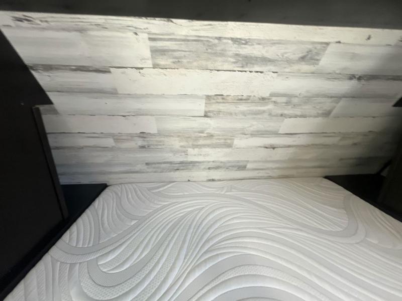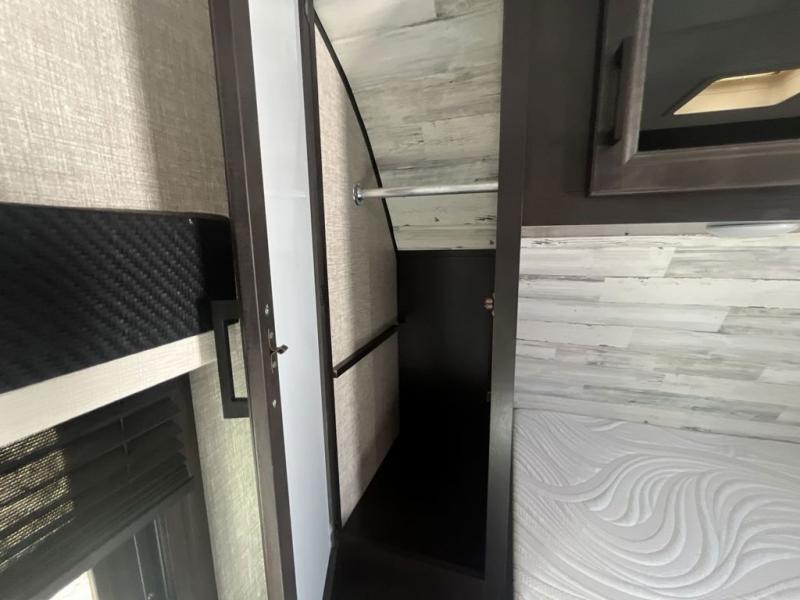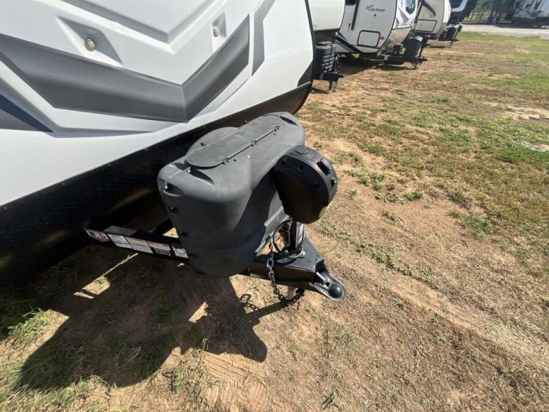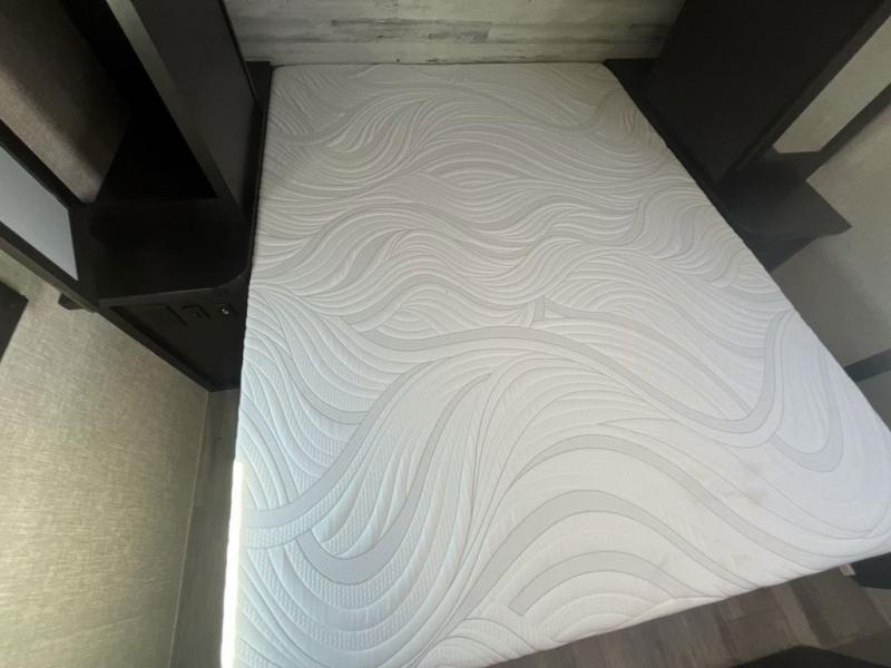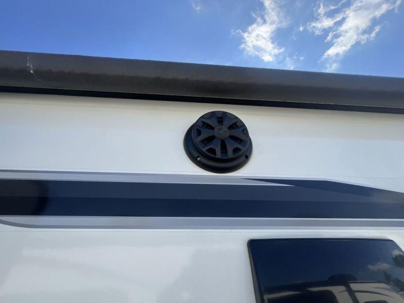 There is so much to love about this trailer from the double-size bunks in the rear with a ladder for easy access, plus the cargo door that allows you to stow larger items from the exterior to the interior underneath the bunks. You also have exterior storage compartments for outdoor gear. And the cook can choose to make meals using the outside kitchen including a fridge to store some cold items or the inside kitchen with full amenities including an 8 cu. ft. refrigerator and a flip-up counter for more space to prepare meals and dry the dishes. The walk-in pantry is a nice feature as well especially when you have a big crew. There is a private bedroom up front with the second exterior entry and a queen bed, plus the main area offers a U-shaped dinette and LED Smart TV to watch. And you might like to add a few options such as theater seats in place of the dinette, 12V heated tank pads if you plan to camp often in the cold weather, and/or the Solar Power package if you like staying off-grid.