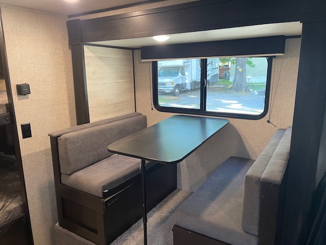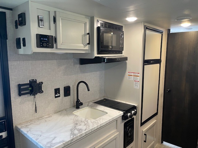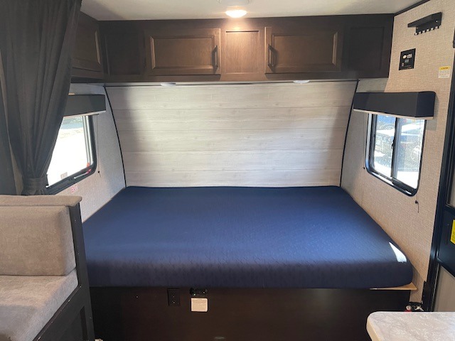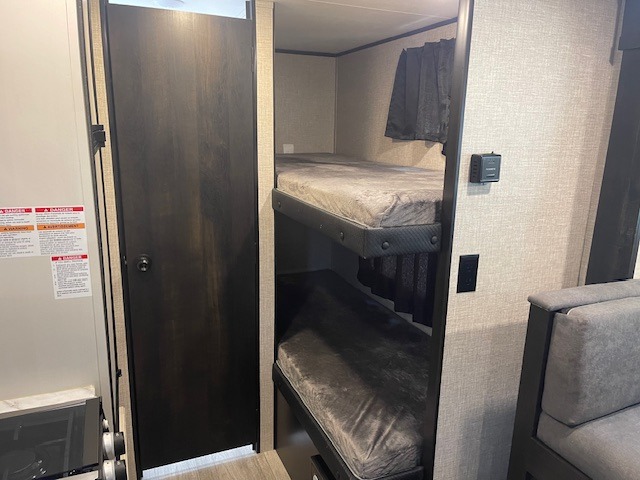 There is room to sleep five people in this Jay Flight SLX travel trailer with the 29" x 75" bunk beds, a booth dinette once converted, and on the RV queen bed. There is also added living space thanks to the single slide, and the private bathroom adds convenience for everyone with its tub/shower and toilet. The kitchen has all of the necessities for you to create delicious meals, like an 8-cubic foot refrigerator, microwave oven, and two-burner range, and you also have overhead cabinets to use for keeping your items organized.