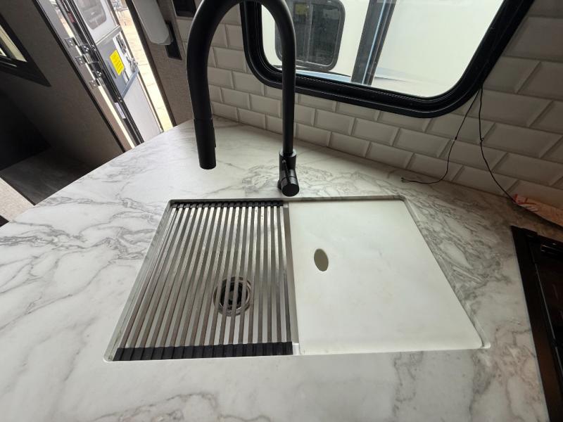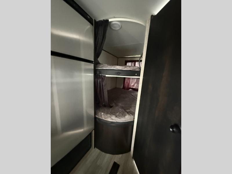 Calling larger camping groups, this trailer is waiting for your adventures! With sleeping space for eight, everyone can join you. The double size bunks offer sleeping for four, plus there is a curtain to close for privacy. The full bathroom will keep everyone clean, and the full kitchen amenities will keep everyone fed. There is an outside kitchen to use when you want to enjoy the outdoors while cooking. You will find exterior storage and a 16' power awning with LED lights that offers a covered outdoor living area when you add your camping chairs. And the front bedroom offers dual entry and wardrobes plus a queen bed, and the U-shaped dinette slide gives you extra floor space, a dining area, and sleeping space for two.