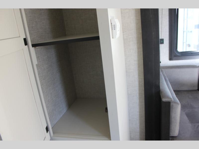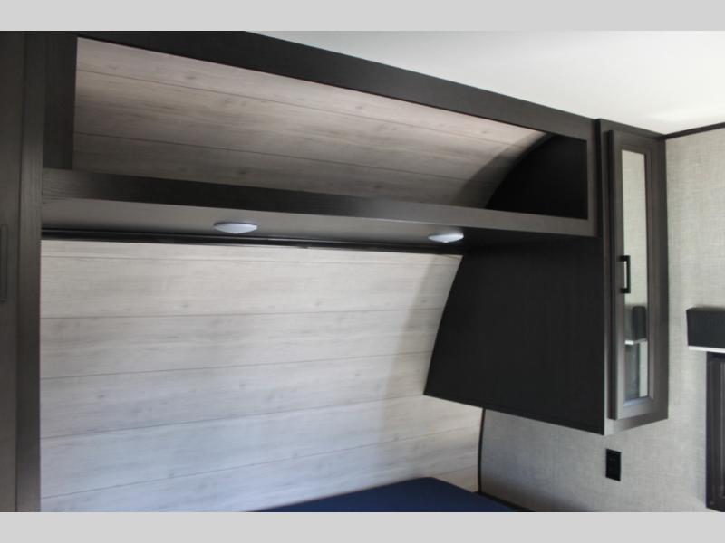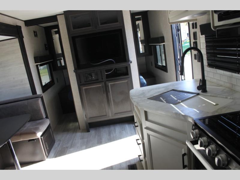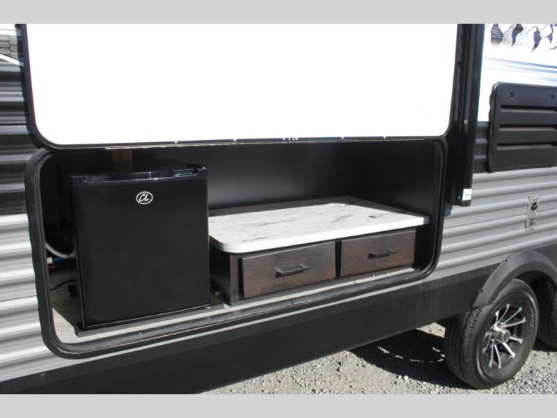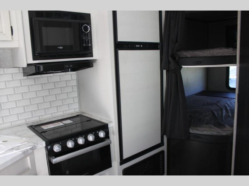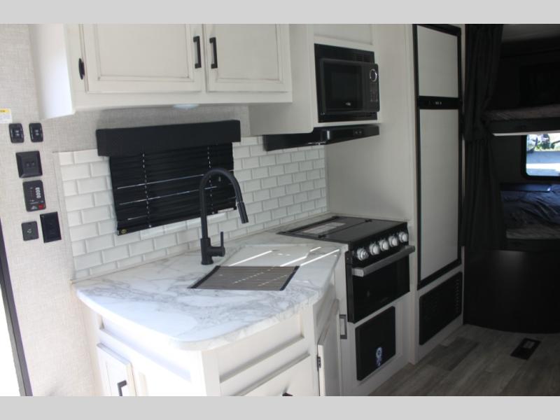 Calling larger camping groups, this trailer is waiting for your adventures! With sleeping space for eight, everyone can join you. The double size bunks offer sleeping for four, plus there is a curtain to close for privacy. The full bathroom will keep everyone clean, and the full kitchen amenities will keep everyone fed. There is an outside kitchen to use when you want to enjoy the outdoors while cooking. You will find exterior storage and a 16' power awning with LED lights that offers a covered outdoor living area when you add your camping chairs. And the front bedroom offers dual entry and wardrobes plus a queen bed, and the U-shaped dinette slide gives you extra floor space, a dining area, and sleeping space for two.