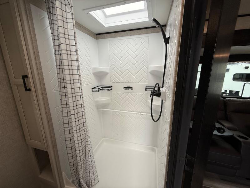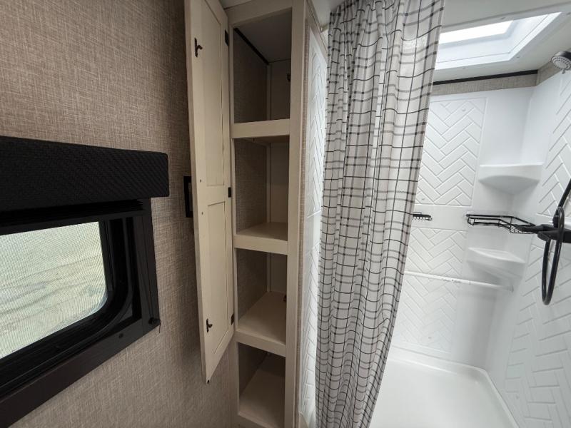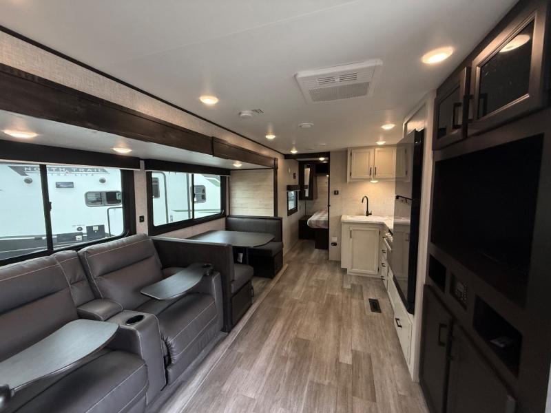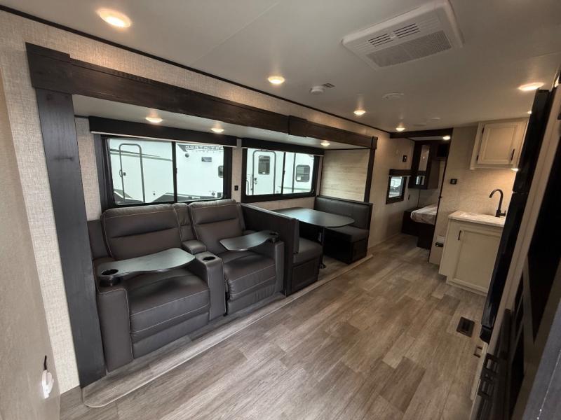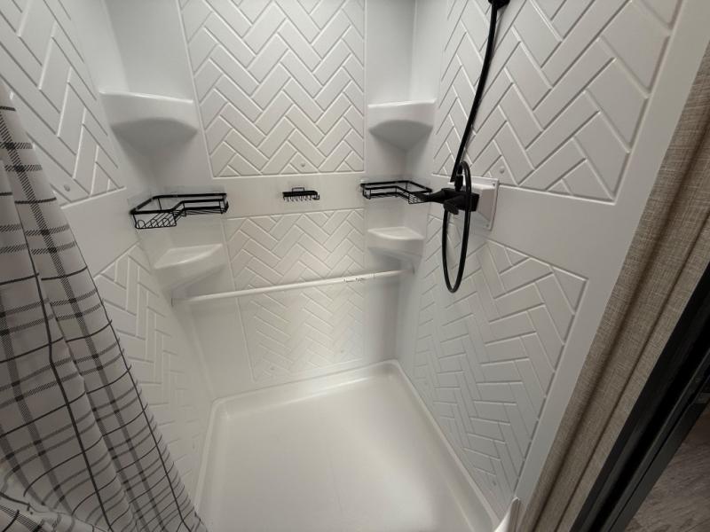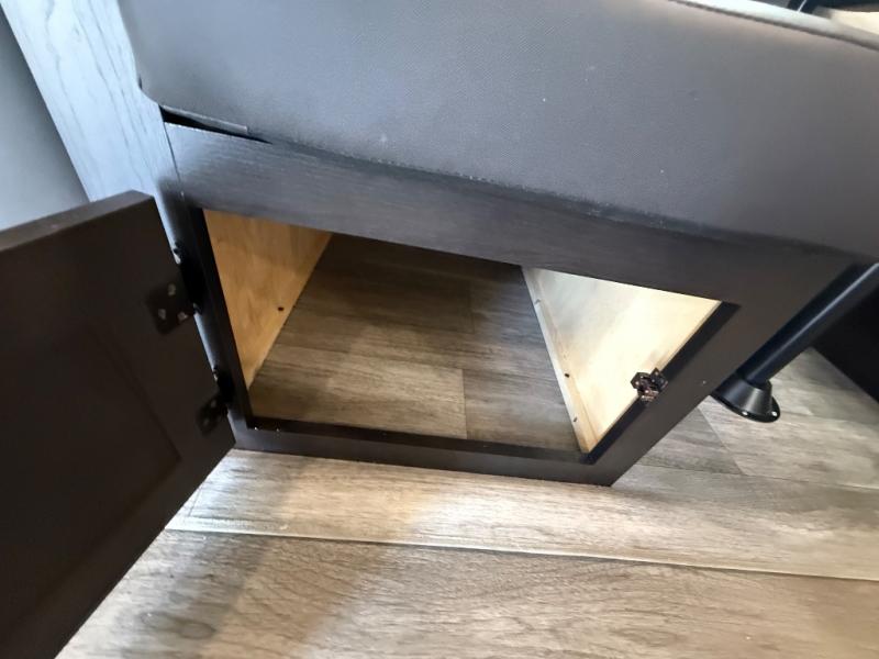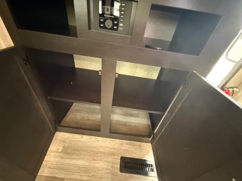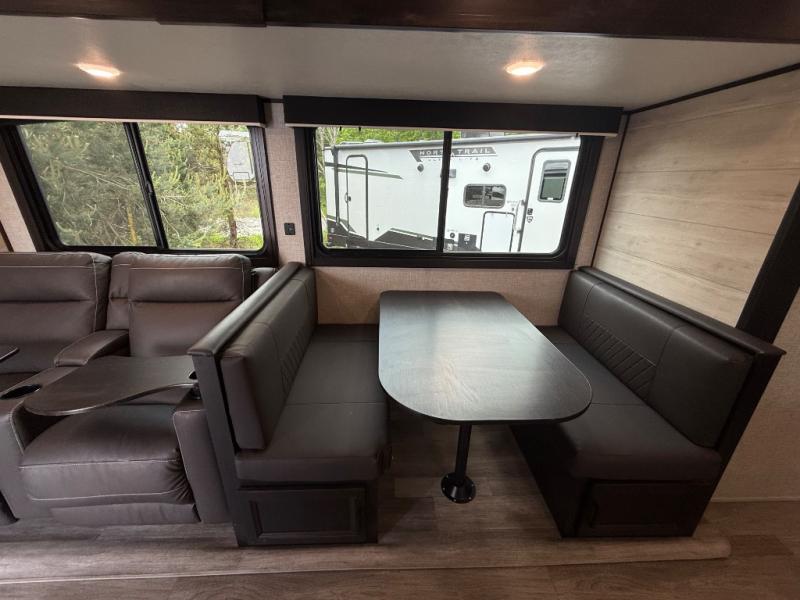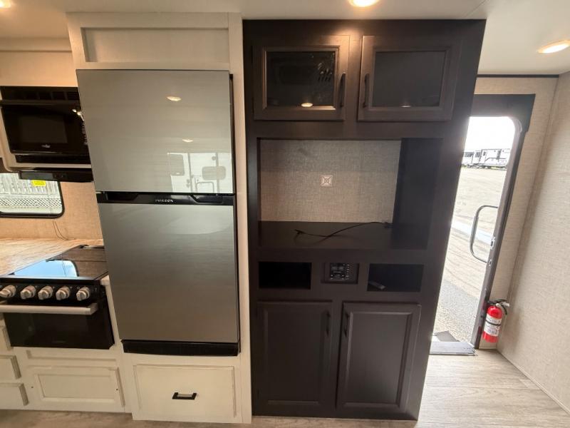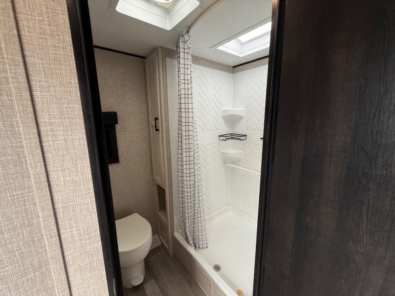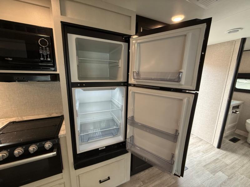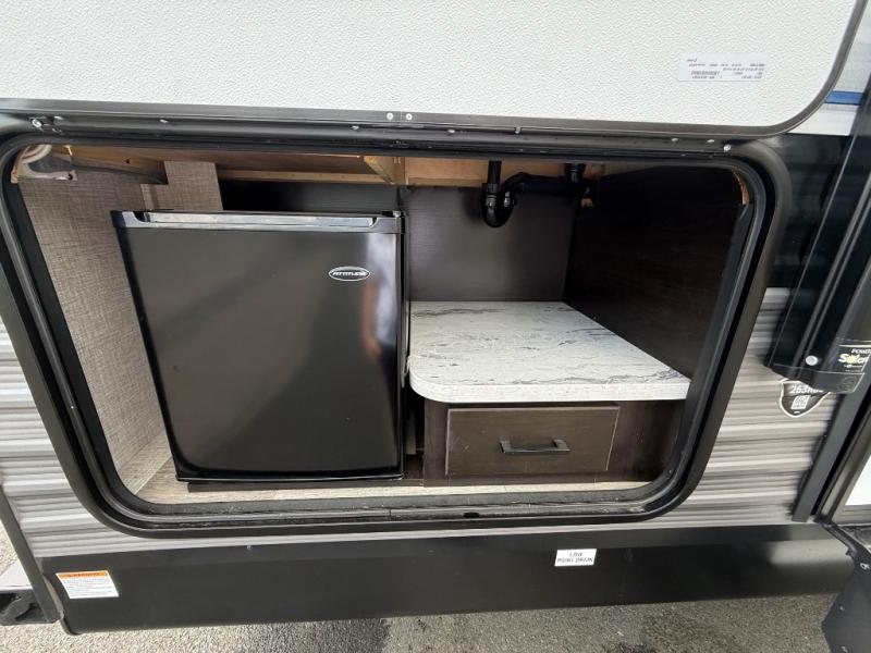 You will appreciate having dual entry doors with this travel trailer! One of the entrances leads directly into the front private bedroom with a 60" x 75" queen bed that has wardrobes on either side. The other entrance leads into the living/kitchen area which has theater seating conveniently across from the entertainment center, but it can be switched out for an optional hide-a-bed sofa if you want more guests to come along. There is also a booth dinette, a three burner cooktop, and a gas/electric refrigerator. You could even enjoy a cold beverage outside with the outside fridge. The full rear bathroom has plenty of space for you to walk around as you get ready after taking a hot shower in the tub/shower!
