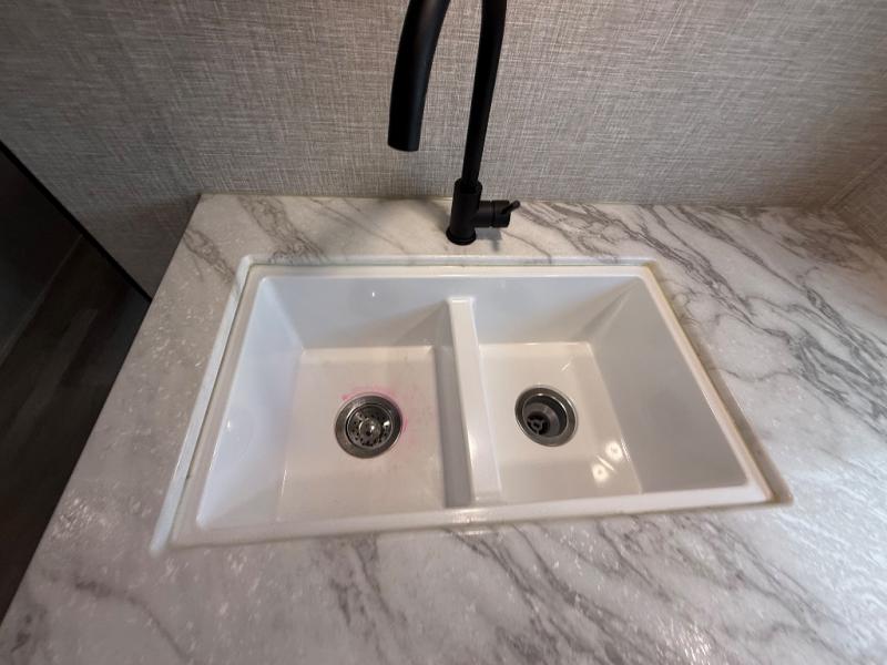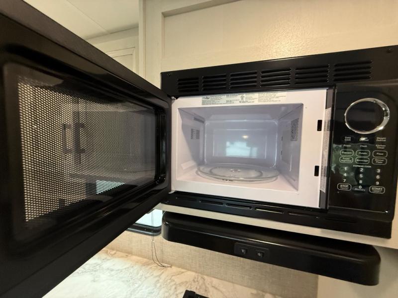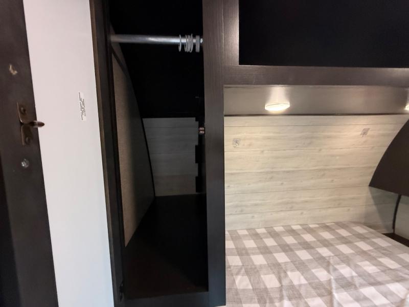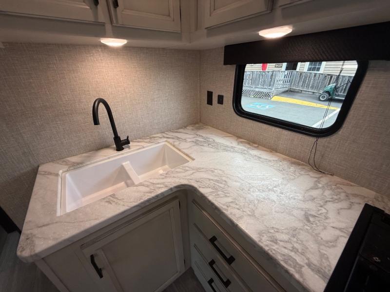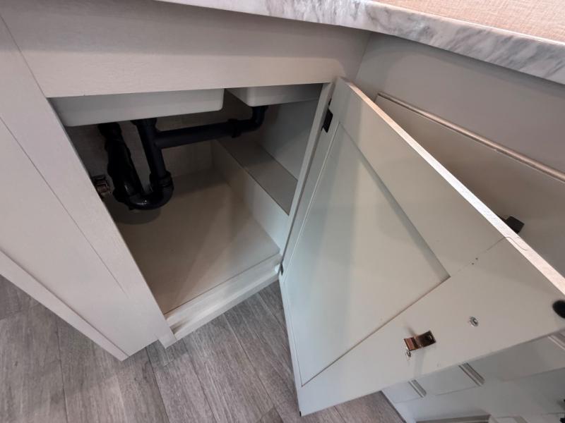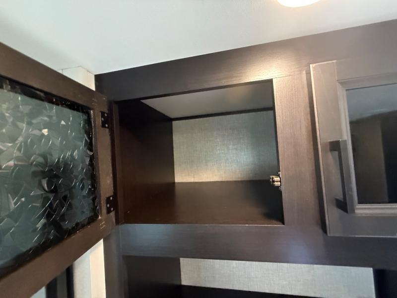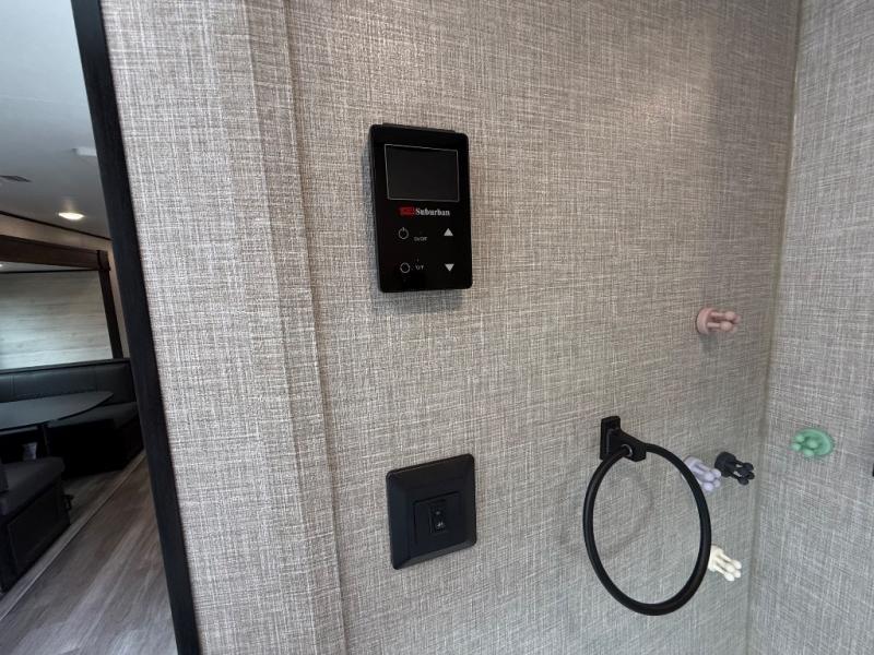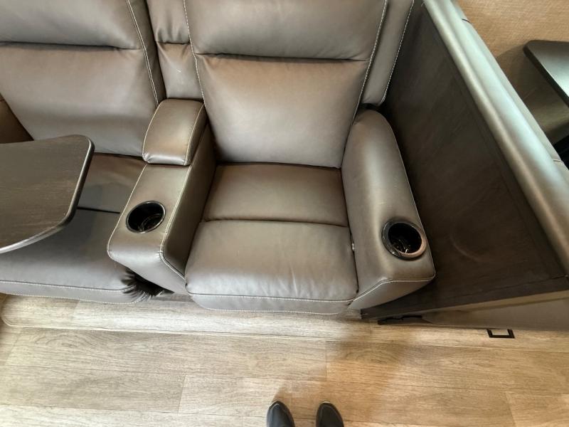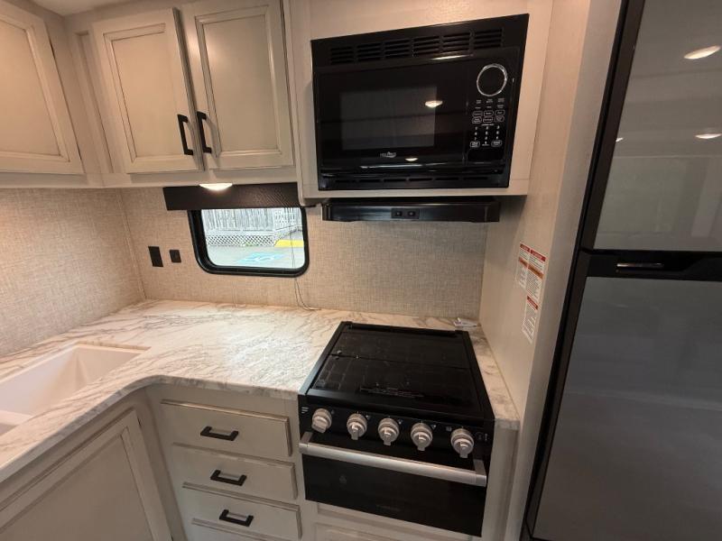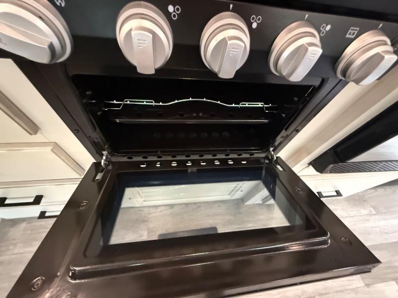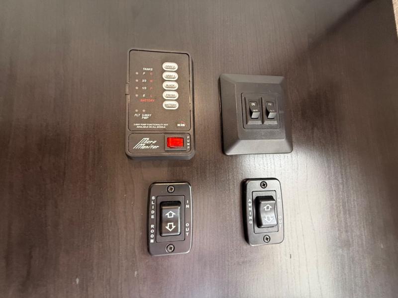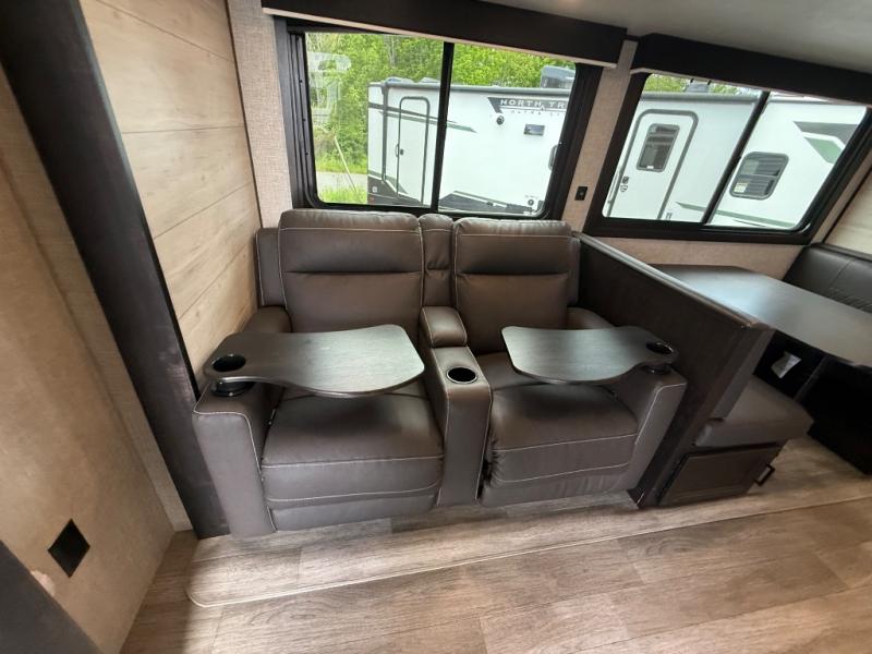 You will appreciate having dual entry doors with this travel trailer! One of the entrances leads directly into the front private bedroom with a 60" x 75" queen bed that has wardrobes on either side. The other entrance leads into the living/kitchen area which has theater seating conveniently across from the entertainment center, but it can be switched out for an optional hide-a-bed sofa if you want more guests to come along. There is also a booth dinette, a three burner cooktop, and a gas/electric refrigerator. You could even enjoy a cold beverage outside with the outside fridge. The full rear bathroom has plenty of space for you to walk around as you get ready after taking a hot shower in the tub/shower!