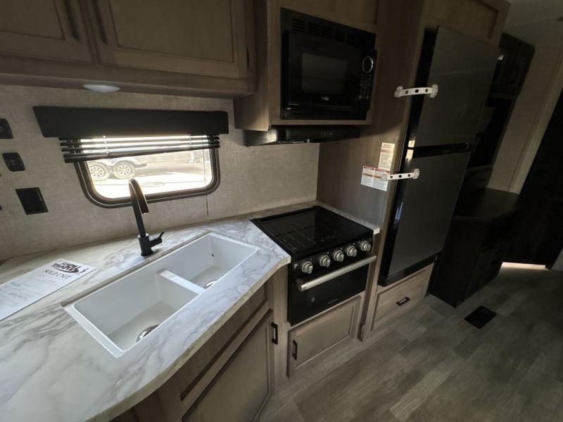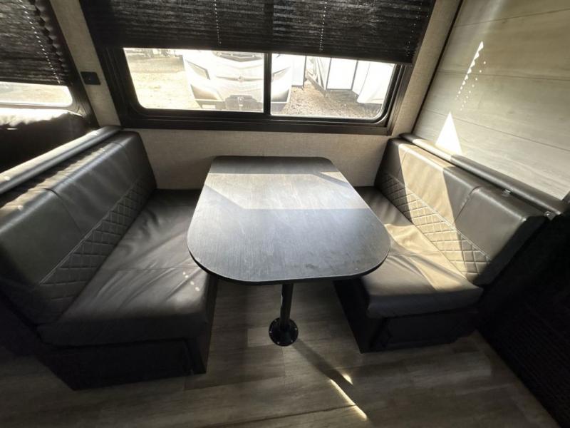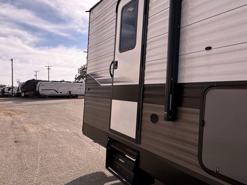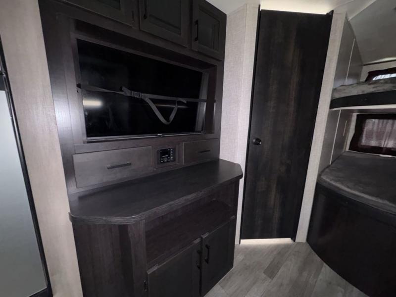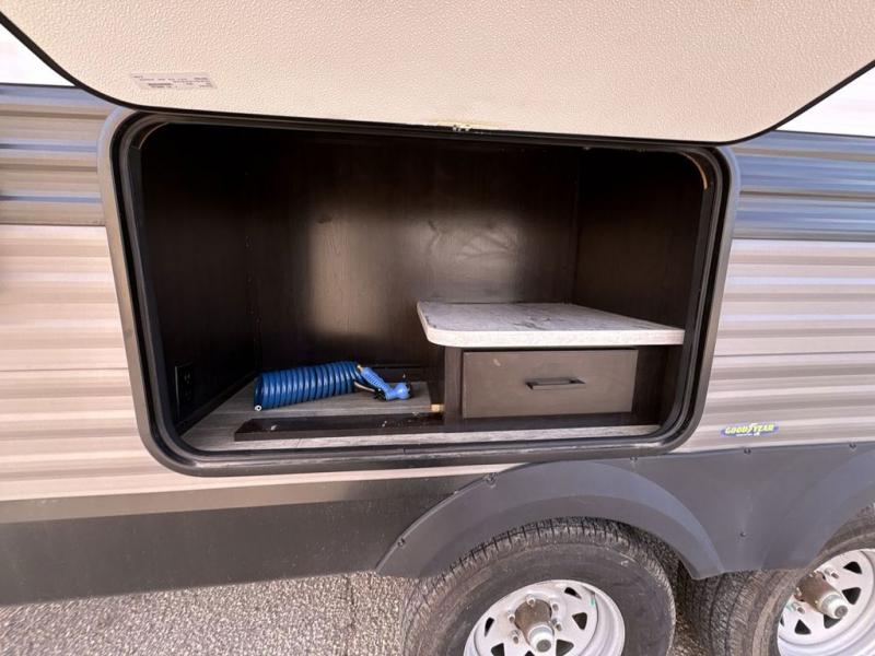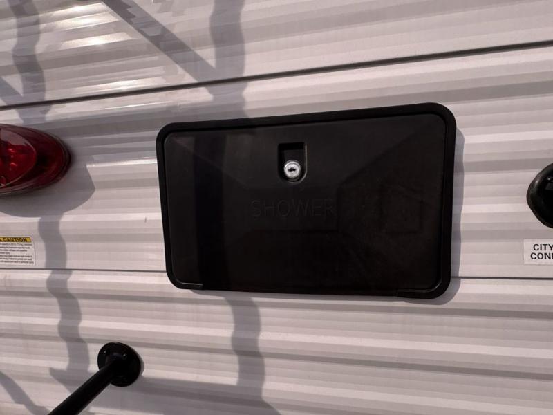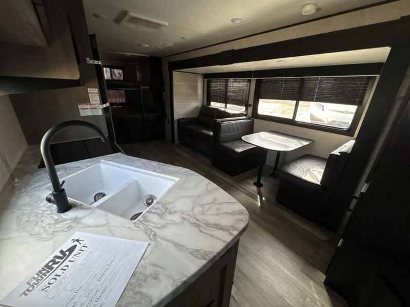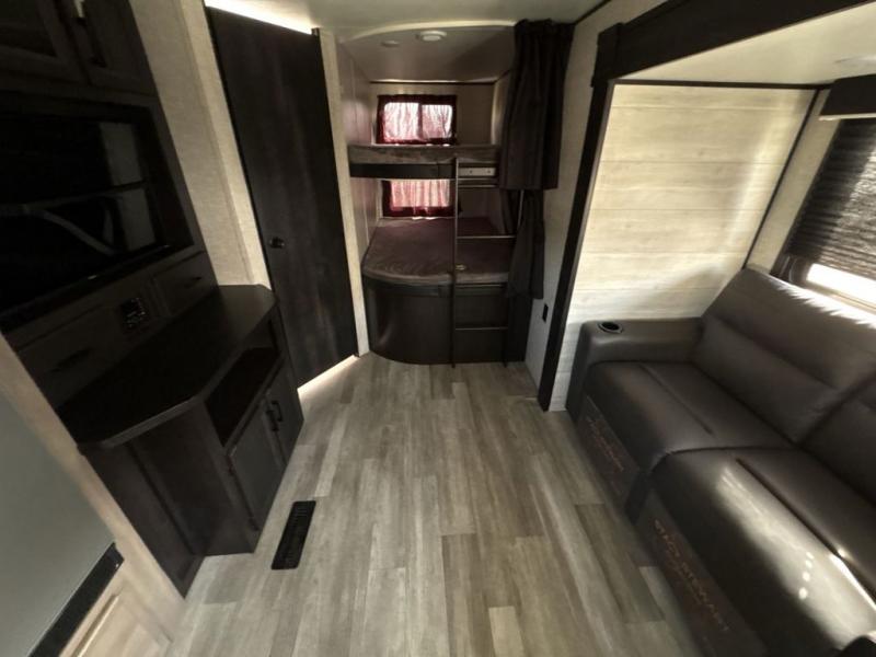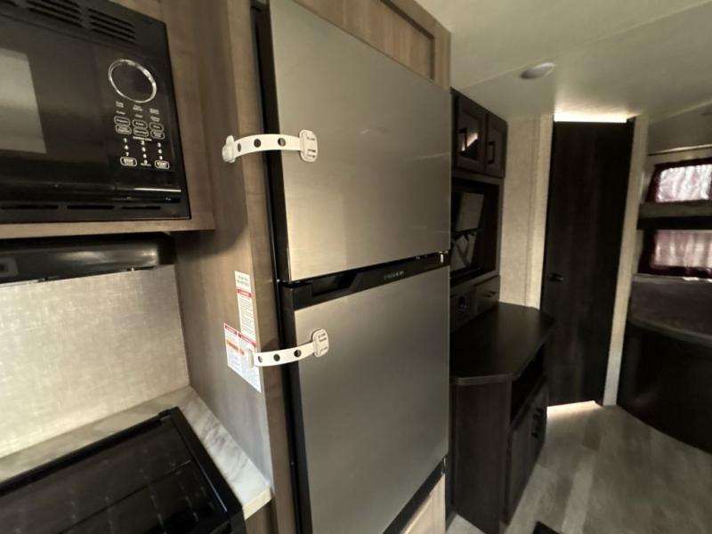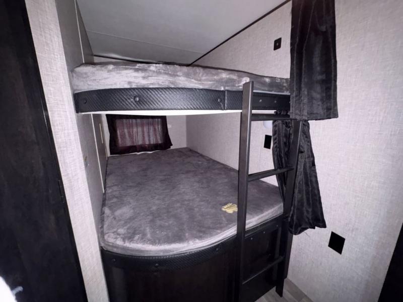 The whole family can get together in this travel trailer! You can sleep on the queen bed in the front private bedroom and the kids can sleep on the 48" x 80" bunk beds with a ladder. The dual entry rear corner bathroom is easy to access even from the outside with one of the dual entry doors to the unit. With a booth dinette and jackknife sofa slide, you will have more walking around space. There is even a bench with storage to keep your shoes out of the way. You also have an outside refrigerator to enjoy a cold beverage without having to go back inside!