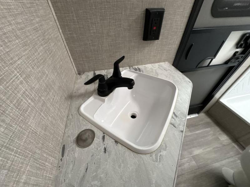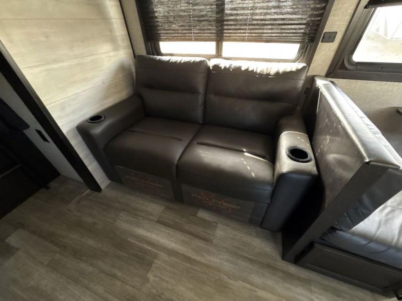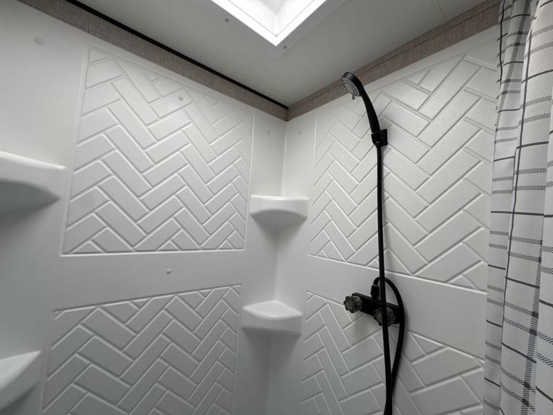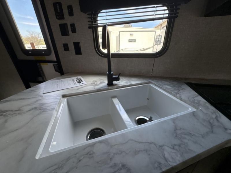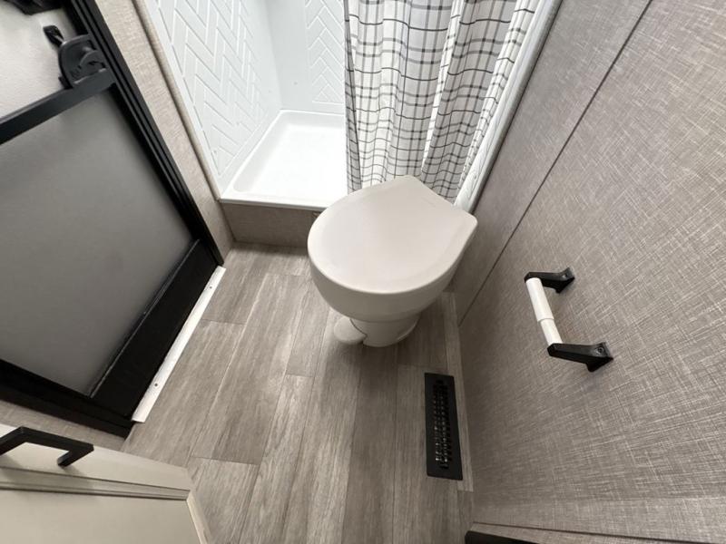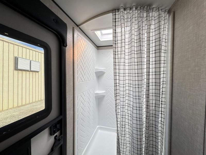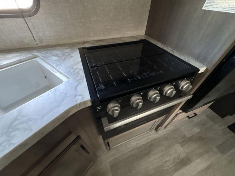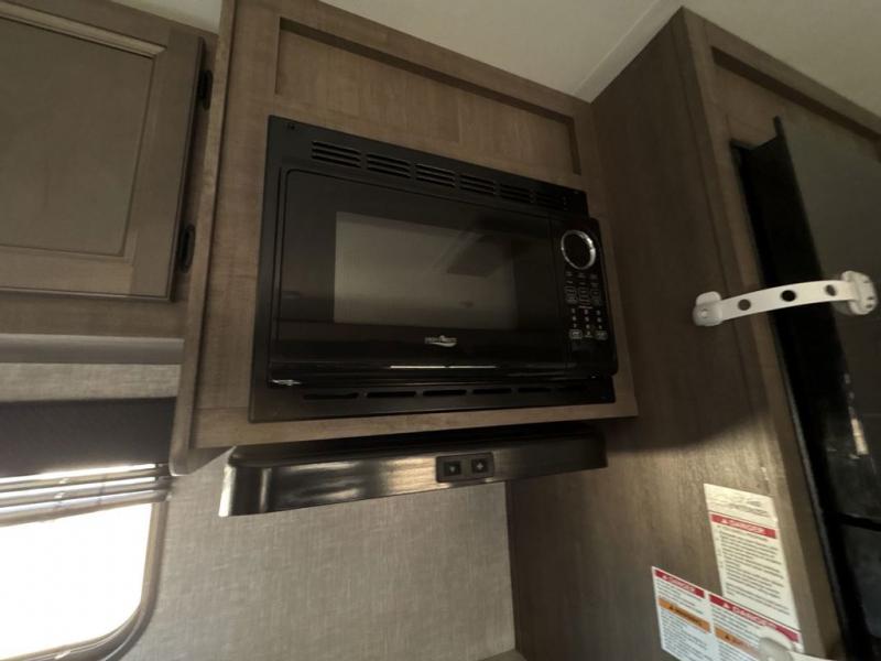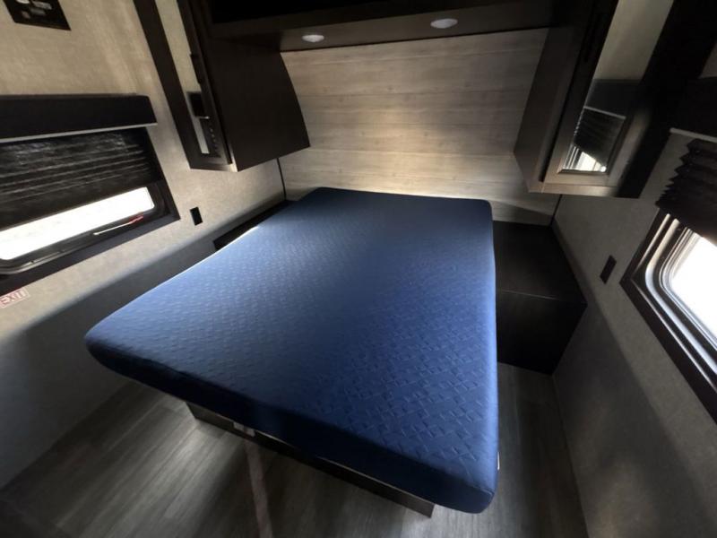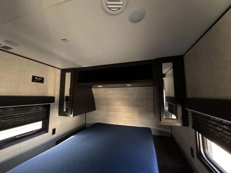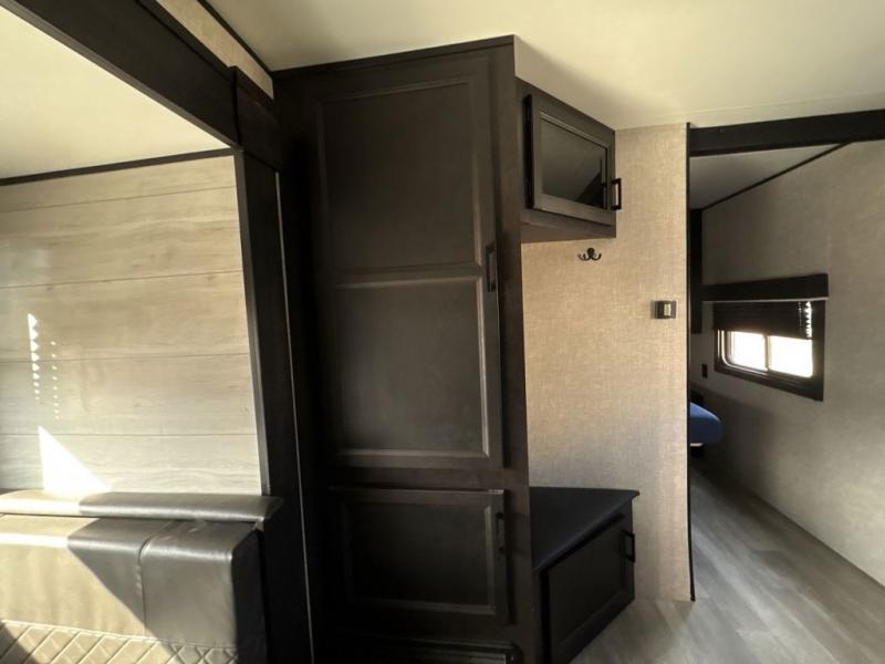 The whole family can get together in this travel trailer! You can sleep on the queen bed in the front private bedroom and the kids can sleep on the 48" x 80" bunk beds with a ladder. The dual entry rear corner bathroom is easy to access even from the outside with one of the dual entry doors to the unit. With a booth dinette and jackknife sofa slide, you will have more walking around space. There is even a bench with storage to keep your shoes out of the way. You also have an outside refrigerator to enjoy a cold beverage without having to go back inside!