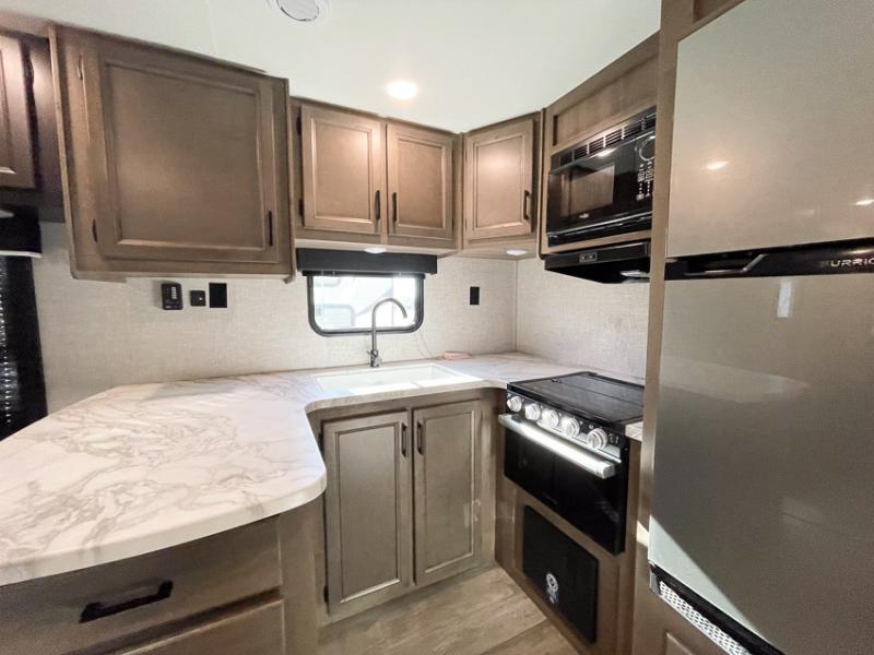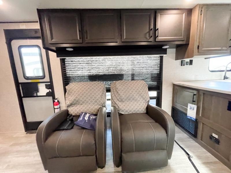 Enjoy all of your camping trips with this Jay Flight in tow! You will find ample seating throughout with dual recliners in the living area opposite a jack-knife sofa and booth dinette slide. Not only can you easily entertain company, but the jack-knife sofa and dinette will also allow you to sleep added family or friends. The rear kitchen layout has everything you need to prepare your favorite home classics or camp favorites with a range top plus oven, and microwave as well. The U-shaped counter provides added prep space and you will also find plenty of storage in the overhead cabinets and storage drawers and cupboards below. A dual entry bath makes it easy to access from the hall or from the private bedroom where you will get a great night's rest after each full day of adventure!