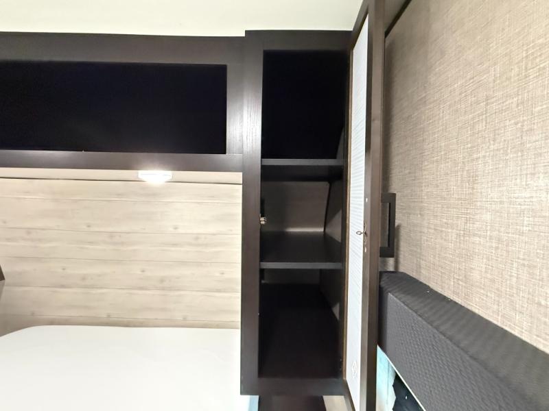 Front private bedroom with 60? x 75? queen bed and wardrobe storage.