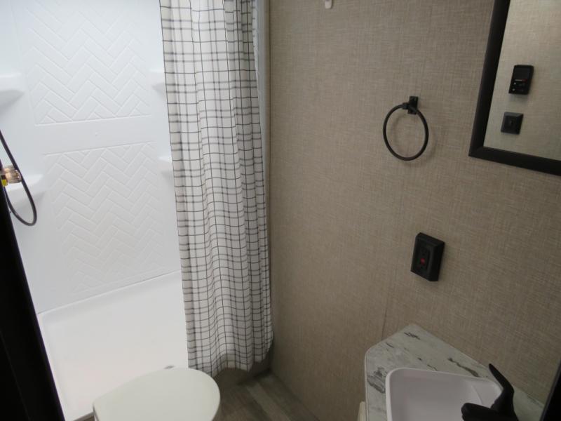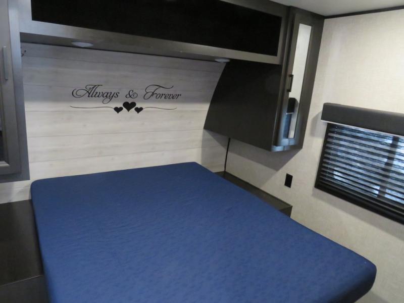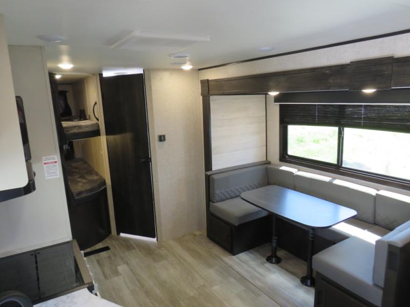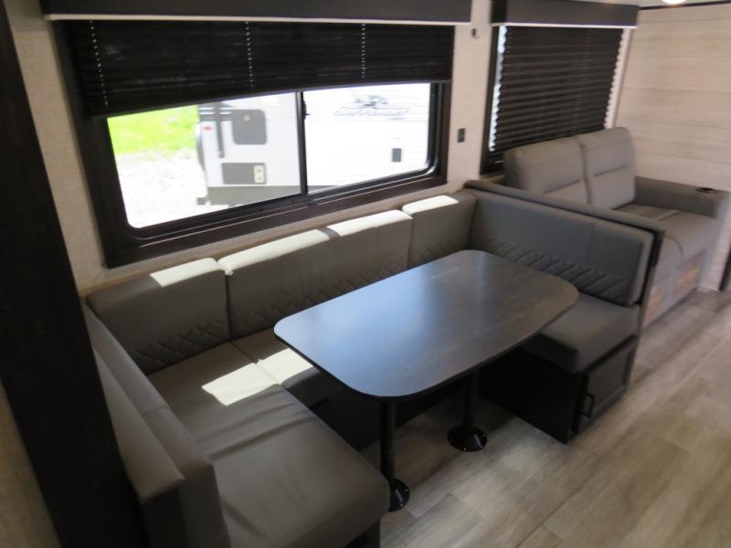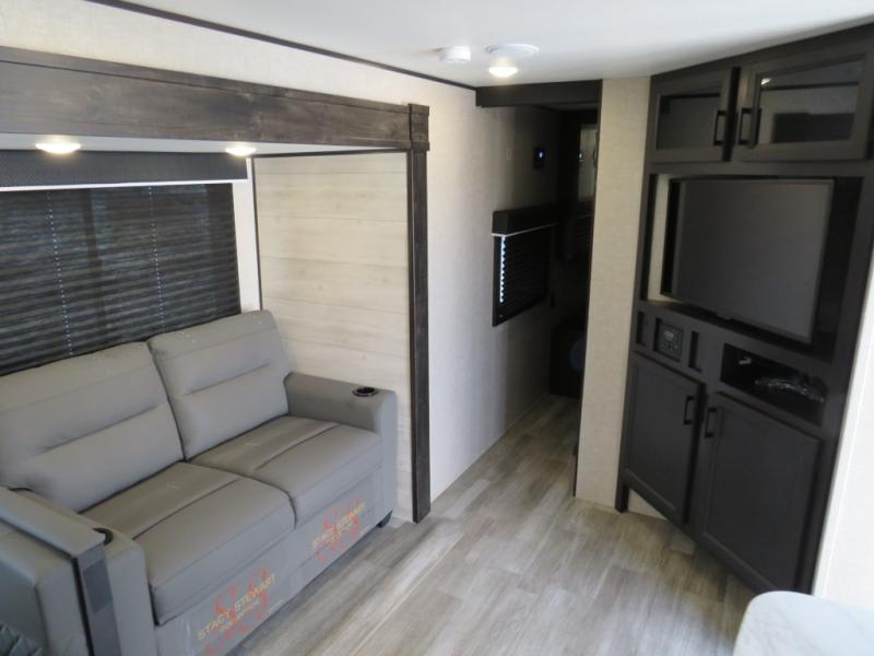 There is much to love about this travel trailer! Starting with the front private bedroom which has a 60" x 75" queen bed with wardrobes on either side and a closet to hang your clothes up. Just outside the bedroom is an entertainment center with a Smart LED TV to watch your favorite movies while you relax on either the jackknife sofa or the U-shaped dinette slide. Freshen up each morning in the rear corner bathroom and then head outside to relax underneath the 20' power awning while you enjoy a cold beverage stored in the outside fridge!