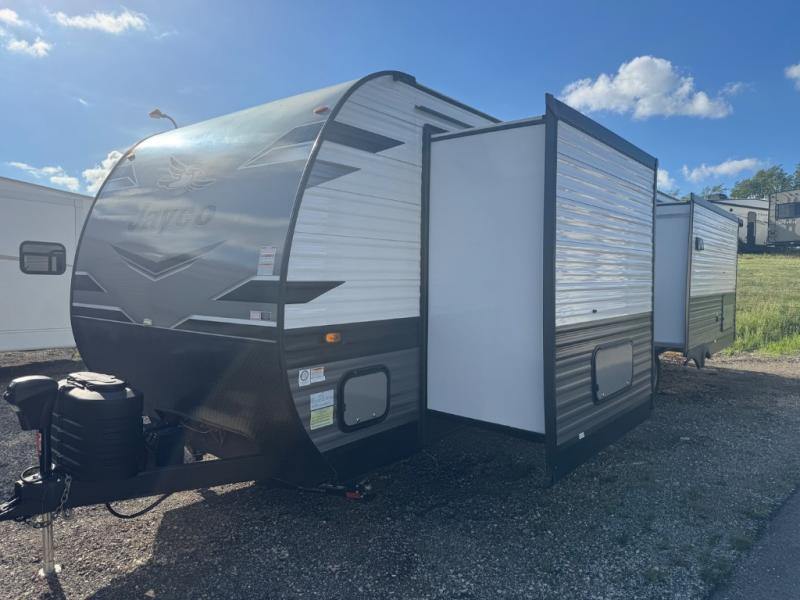 These Jayco Jay Flight travel trailers have been a family favorite for years with their lasting power and superior construction. An integrated A-frame and magnum truss roof system holds them together. When you tow one of these units you're towing the entire unit and not just the frame. With dark tinted windows, you have more privacy and safety. The vinyl flooring throughout will be easy to clean and maintain too. Come find your favorite model today!