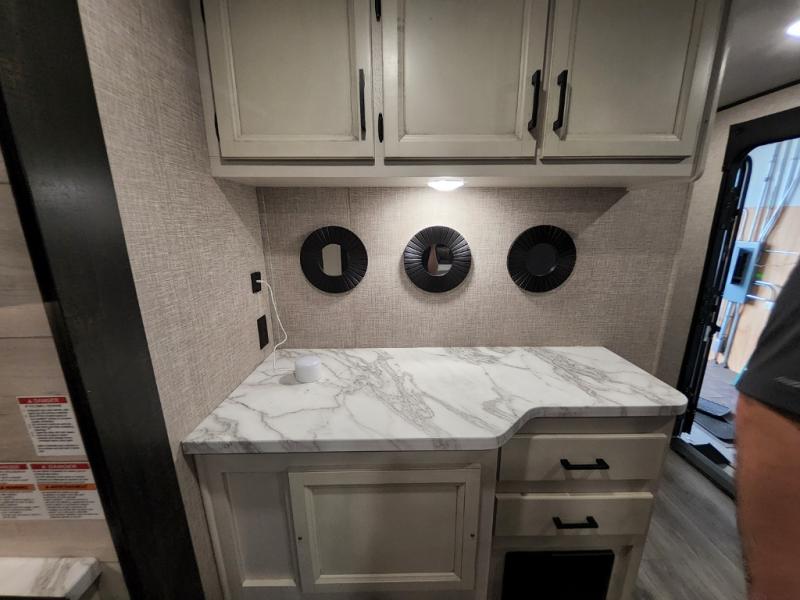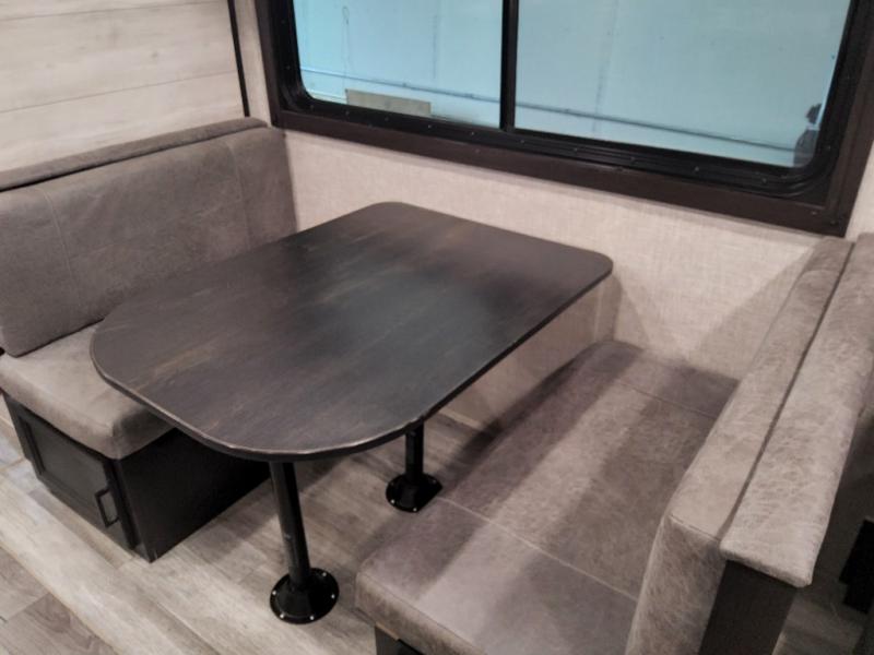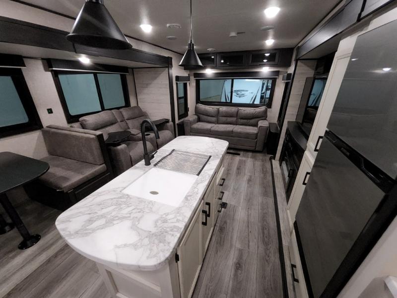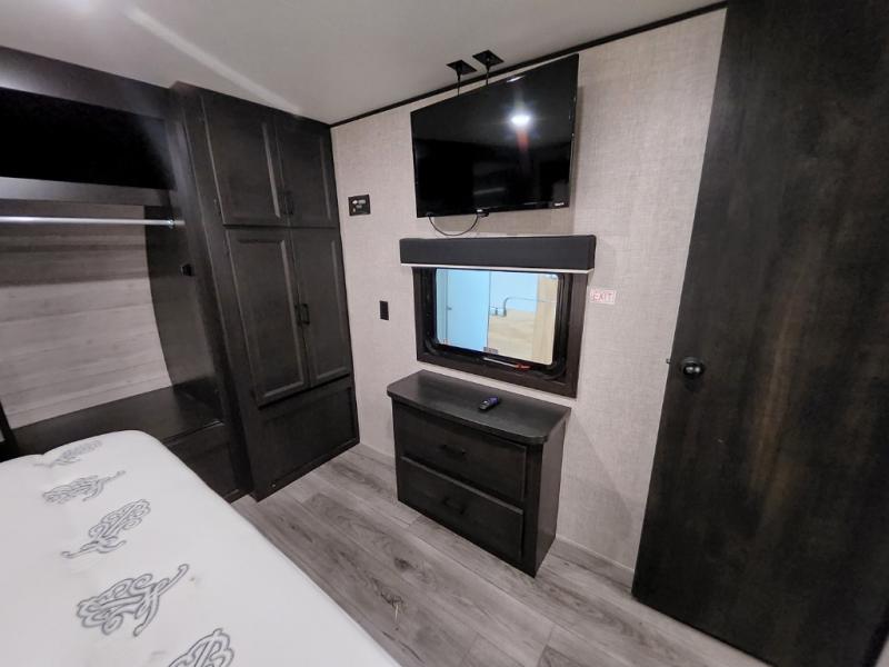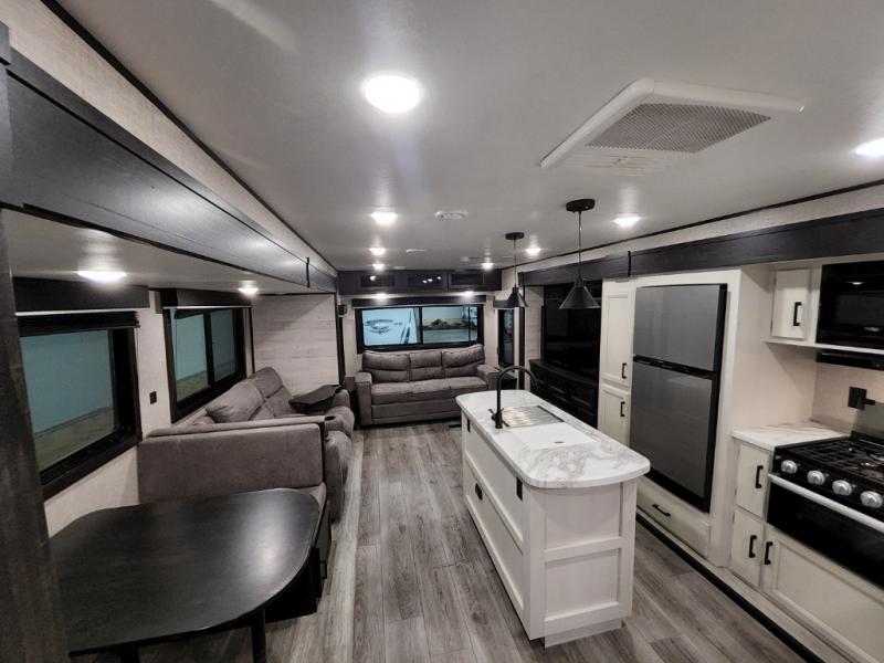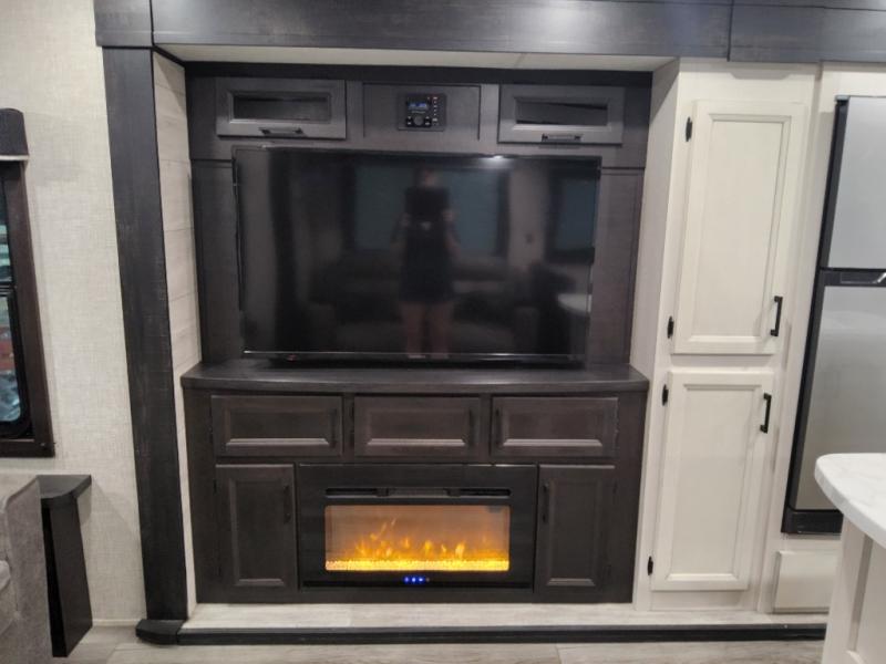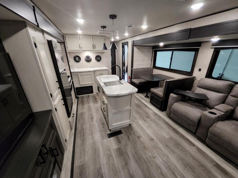 Enjoy a relaxing weekend getaway in this travel trailer! The dual entry bathroom with radius shower creates a front master suite with a queen bed slide, a dresser, and a front large wardrobe with storage space next to that is prepped to add an optional washer and dryer. The chef will have an easy time preparing their best home cooked meals with the kitchen island, hutch, three burner cooktop, and gas/electric refrigerator. Enjoy your meals at the booth dinette then play a card game or transform it into an extra sleeping space. The rear living area has a rear jackknife sofa for a quick afternoon nap and theater seating across from the entertainment center with a fireplace for the perfect spot on movie night!
