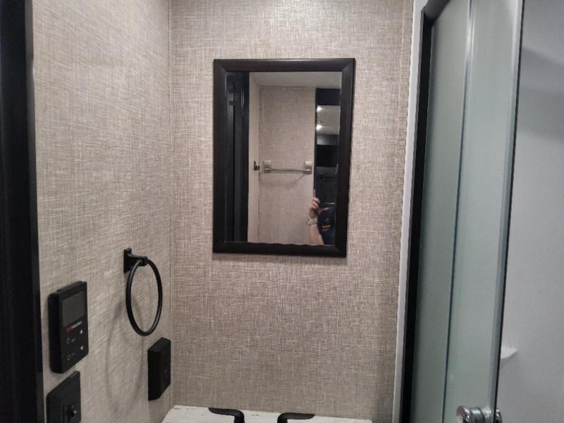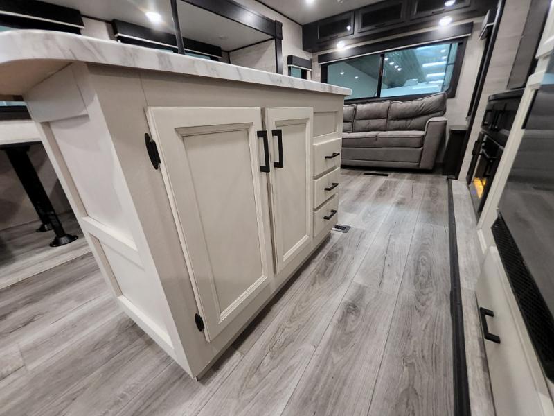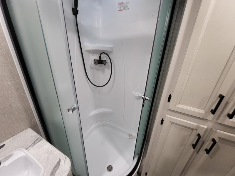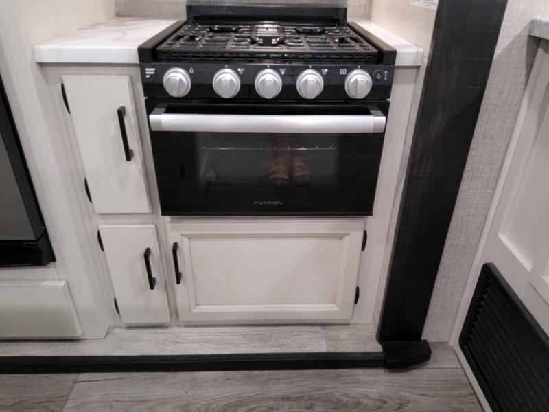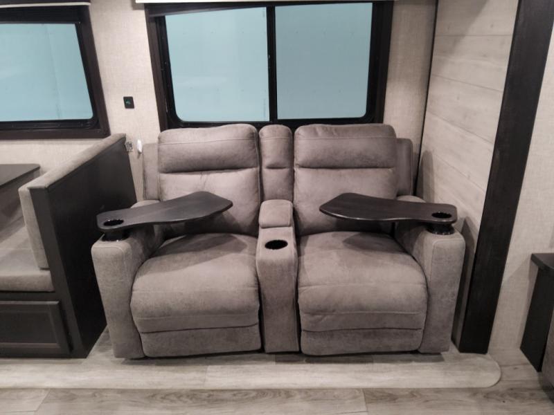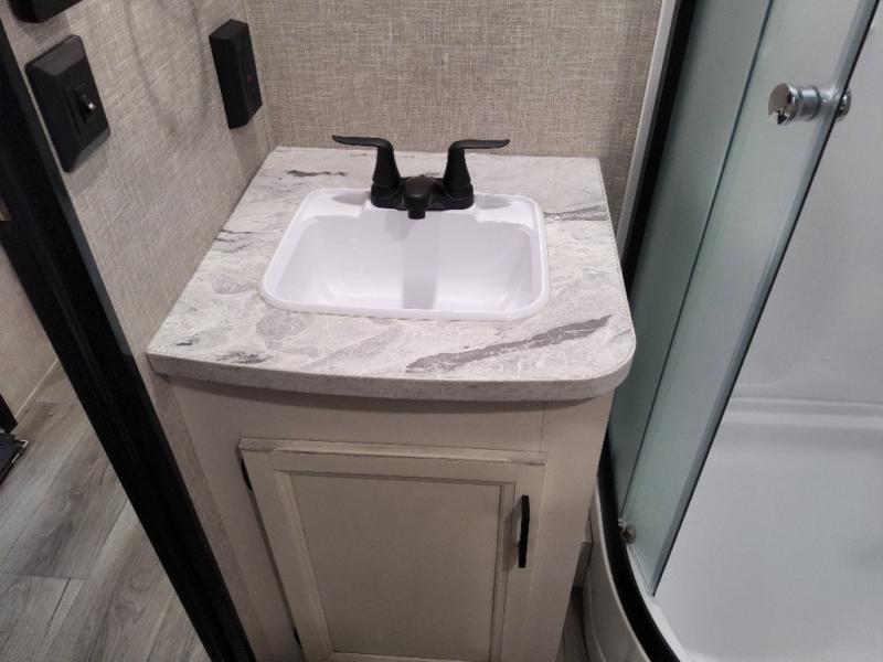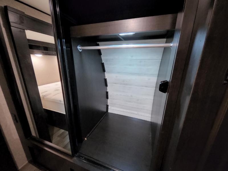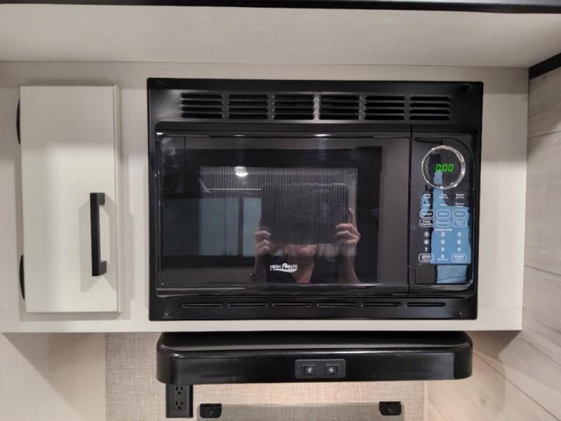 Enjoy a relaxing weekend getaway in this travel trailer! The dual entry bathroom with radius shower creates a front master suite with a queen bed slide, a dresser, and a front large wardrobe with storage space next to that is prepped to add an optional washer and dryer. The chef will have an easy time preparing their best home cooked meals with the kitchen island, hutch, three burner cooktop, and gas/electric refrigerator. Enjoy your meals at the booth dinette then play a card game or transform it into an extra sleeping space. The rear living area has a rear jackknife sofa for a quick afternoon nap and theater seating across from the entertainment center with a fireplace for the perfect spot on movie night!