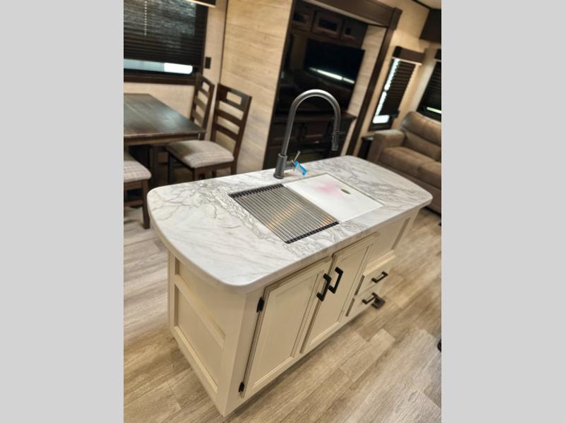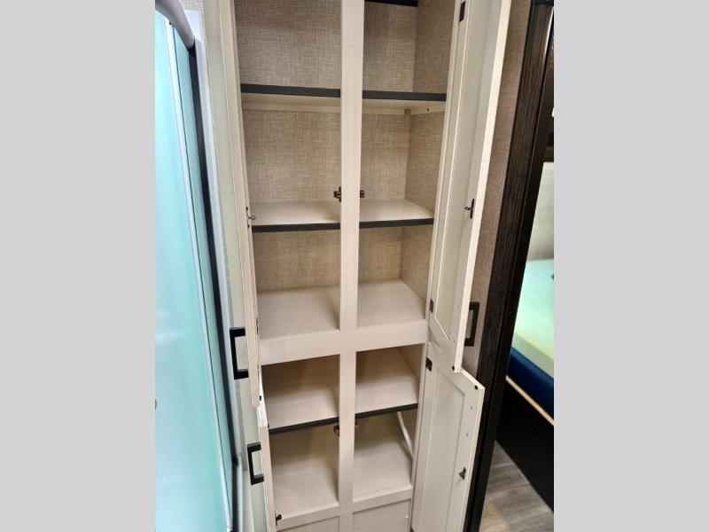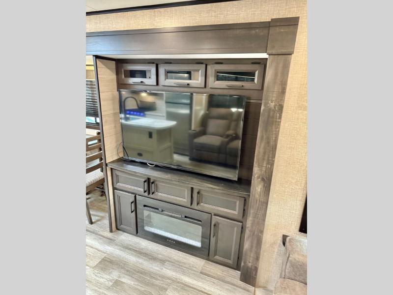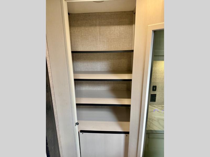 When you travel in the fall or winter, the fireplace on this Jay Flight travel trailer is going to be your favorite feature! It sits below the entertainment center, and both items are across from the theater seating. You'll also have a jackknife sofa right there so that others can join in on the relaxation. A kitchen island adds function to the kitchen, and it also serves as a great dishwashing station. You can cook just about anything on the three-burner range, and the pantry will help you store your snacks. The free-standing table with chairs makes meal time feel like it does at home, and the dual-entry bathroom can be accessed from the main hallway or the front bedroom.
