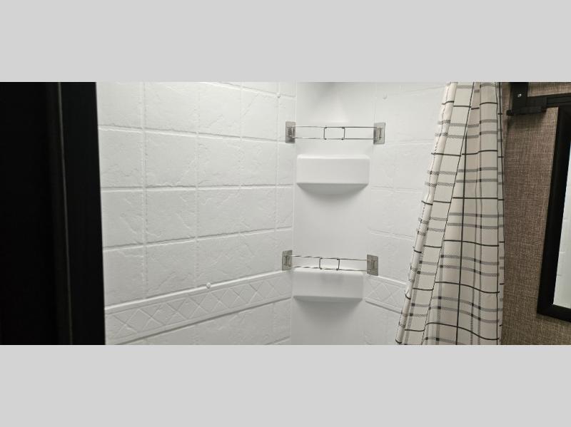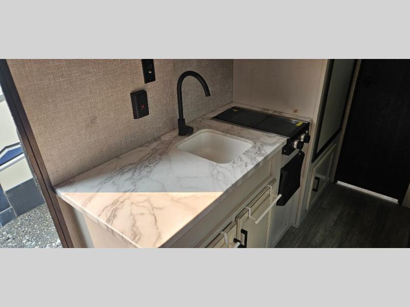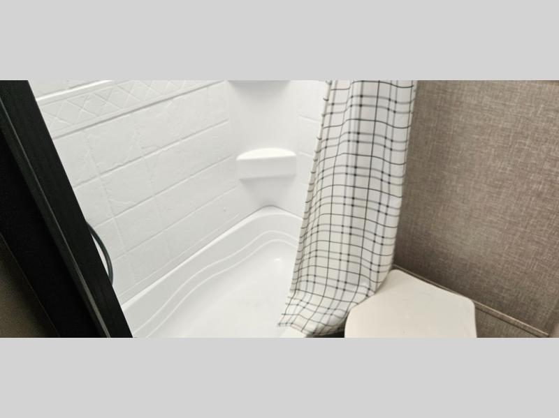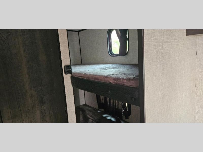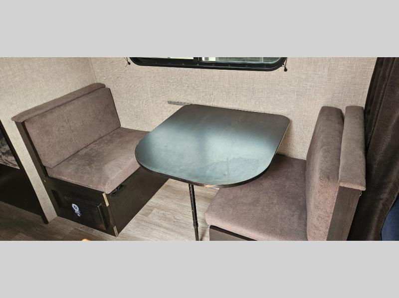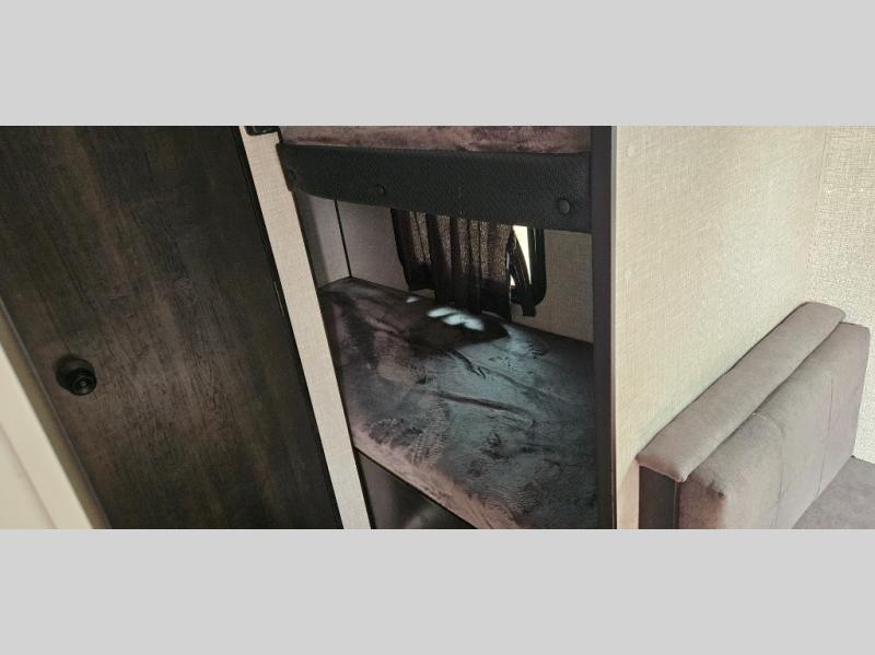 This Jay Flight SLX travel trailer offers you a queen-size bed for sleeping at night, and there is even a privacy curtain that you can draw to separate the bed from the rest of the trailer too. The 29" x 75" bunk beds are another sleeping location, and you can even create a bed for one more person by transforming the booth dinette. Overhead cabinets will help you keep your belongings organized, and the kitchen has a two-burner range, 6-cubic foot refrigerator, residential-style countertops, microwave oven, and a high-rise faucet at the sink to help you prepare meals.