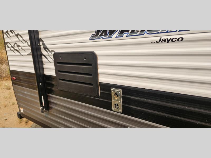 The Jayco Jay Flight SLX travel trailer is quite easy to own because it is lightweight, and it comes with a single axle. Built on a fully integrated A-frame with galvanized-steel, impact-resistant wheel wells, the Jay Flight SLX has quality at its very foundation. That quality continues on to the electric self-adjusting brakes, easy-lube hubs, Magnum Truss roof system, friction-hinge entry door with window, and LP quick connect. Some of what the mandatory Customer Value Package includes are two stabilizer jacks with sand pads, American-made Goodyear Endurance tires, Keyed-Alike entry and baggage doors, and JaySMART LED lighting. Buying your trailer in the East versus the West will determine which optional package is available to you. The East offers an optional STX Edition, and the West offers an optional Baja Package. Both packages come with a 30LB LP bottle, a large fresh water tank, Goodyear off-road tires, an enclosed underbelly, a double entry step, four stabilizer jacks, and a deluxe graphics package. Specific to the STX Edition, you will find a wide-stance axle, aluminum rims, a power tongue jack, and powder-coated wheel fenders while the Baja Package offers you a flipped axle.