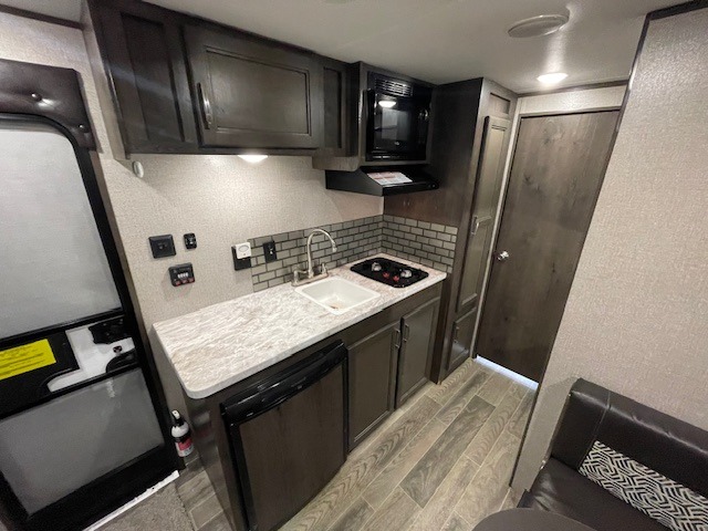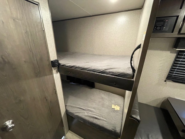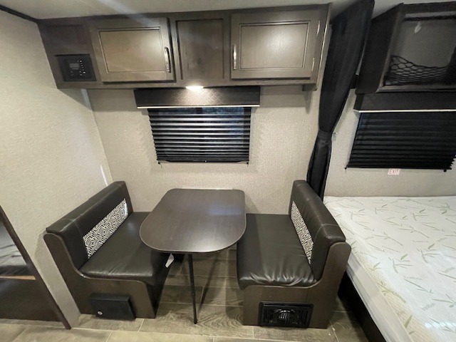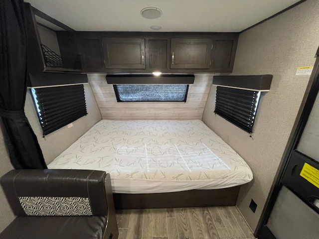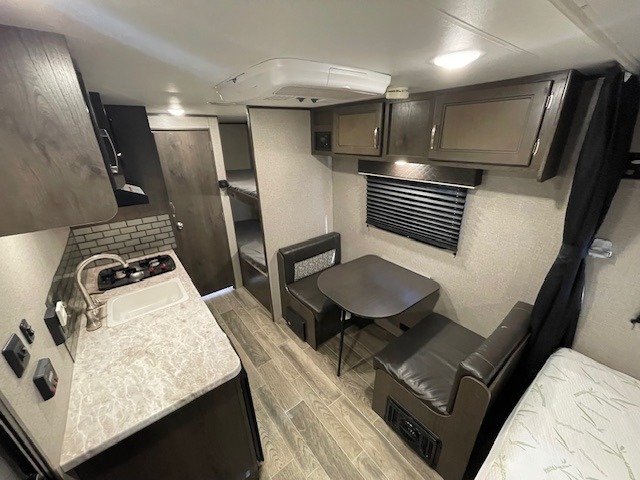 This Jay Flight SLX travel trailer offers you a queen-size bed for sleeping at night, and there is even a privacy curtain that you can draw to separate the bed from the rest of the trailer too. The 29" x 75" bunk beds are another sleeping location, and you can even create a bed for one more person by transforming the booth dinette. Overhead cabinets will help you keep your belongings organized, and the kitchen has a two-burner range, 6-cubic foot refrigerator, residential-style countertops, microwave oven, and a high-rise faucet at the sink to help you prepare meals.