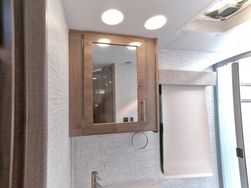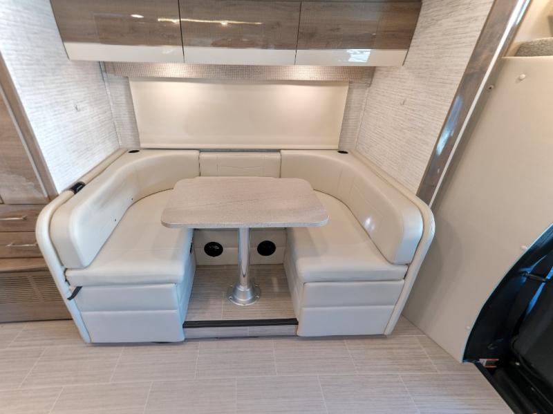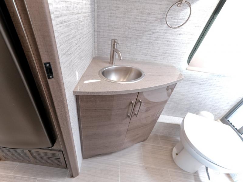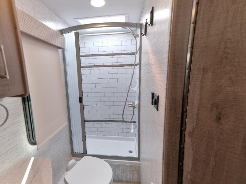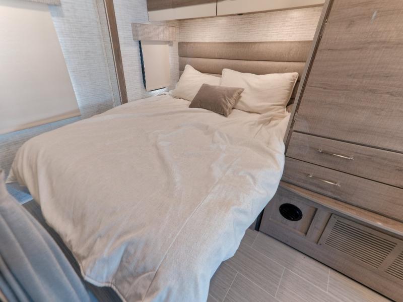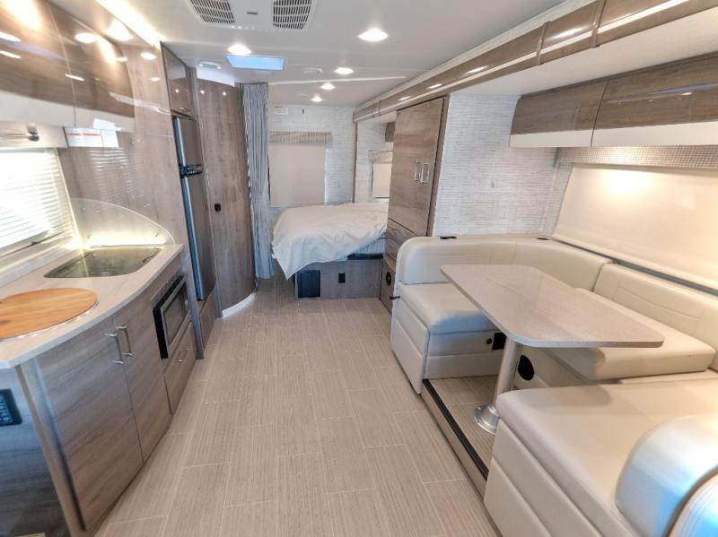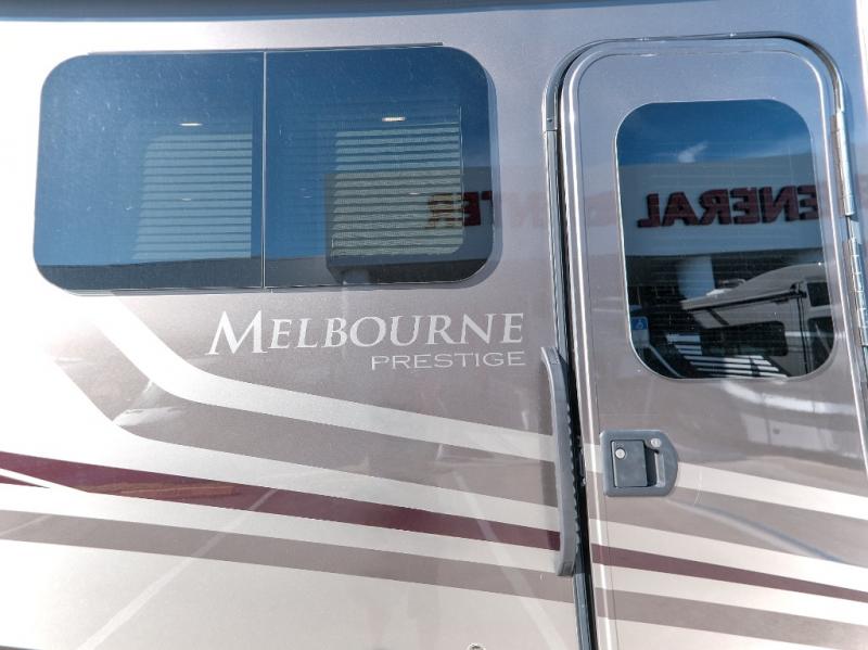 Each Melbourne Prestige Class C diesel motorhome by Jayco includes sidewall, rear wall and slide room walls that are bonded together with Stronghold VBL lamination to create the lightest, yet strongest construction available in the RV industry. There is also a one-piece, seamless front cap that resists wear and tear from years on the road. The interior offers an overhead bunk with 750 lbs. capacity which is way over the industry standard and allows for more overnight guests. And you will find seatbelts installed in every designed seating location to keep your favorite people safe. Other standout features include the JAYCOMMAND powered by Fireplay giving you full control of key operations from your phone or tablet, a Truma AquaGo Comfort Plus tankless water heater, a water filtration system, ball-bearing drawer guides, and an 80-inch interior ceiling height with a padded vinyl ceiling giving you more space to enjoy.