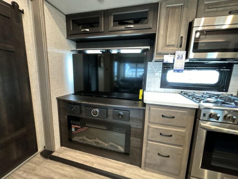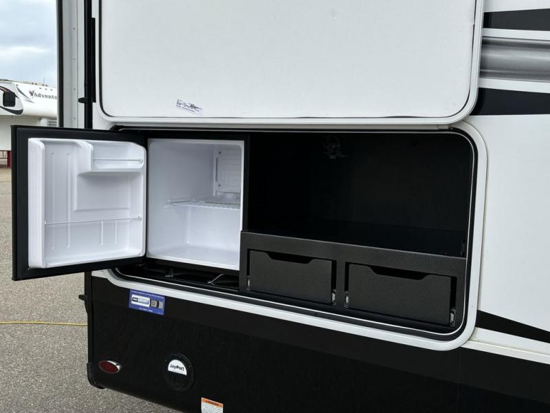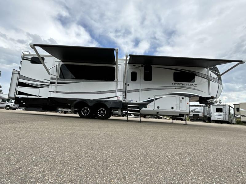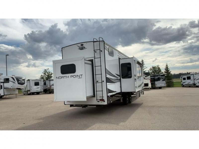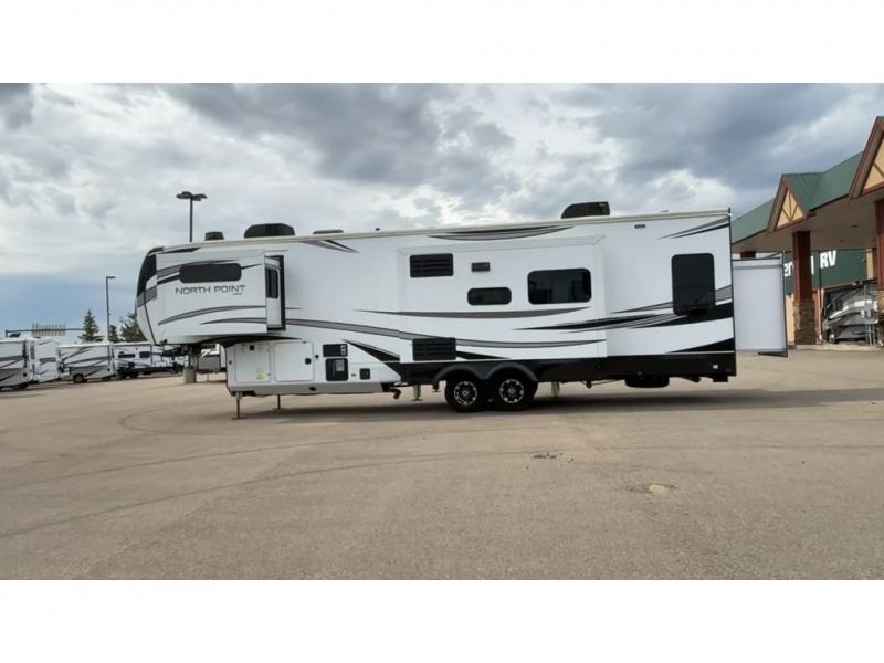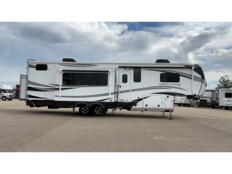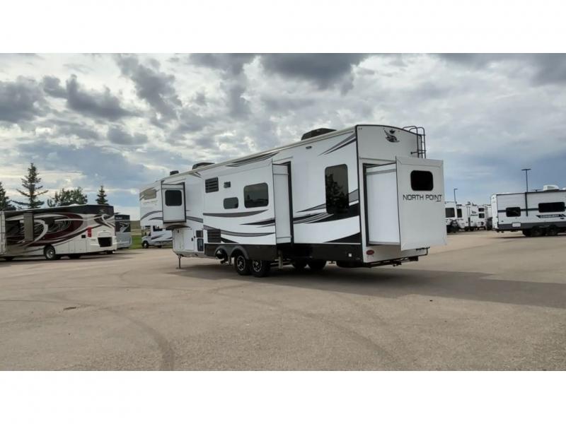 Traveling and living in this fifth wheel is made super easy with this North Point that offers an extra private rear room to utilize as a bunkhouse, an extra living area or even an office. You will find a unique rear slide out that includes a tri-fold sofa with removable table and a flip-up bunk above, plus a loft above this room with steps to access this area from the main living and kitchen area. The kitchen offers an island with flip-up butcher block, a 21 cu. ft. residential refrigerator or choose the 18 cu. ft. option, a pantry and everything you will need to make lots of food for entertaining. The theater seats and the free standing table without a pedestal are great places to sit while watching the 50" Smart LED HDTV with fully digital HDMI output, home entertainment system with subwoofer, and a fireplace below. The full bathroom includes a walk-in shower with a seat and linen storage, and the front master is a great escape with a king bed slide, lots of storage, a space prepped for a washer/dryer option and more.