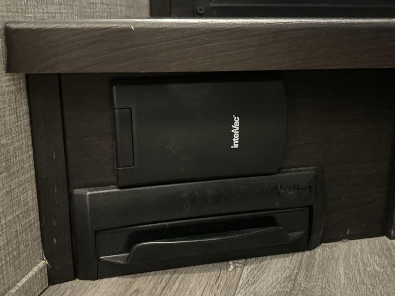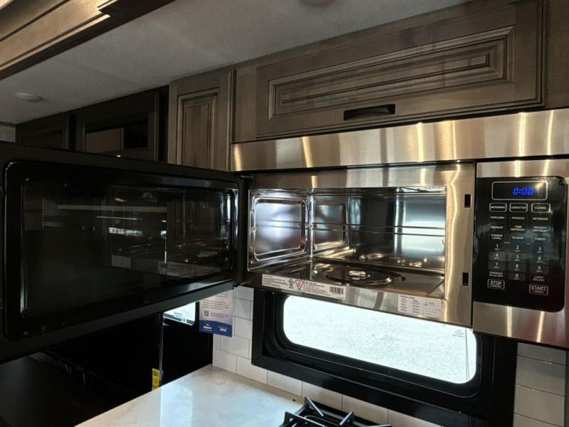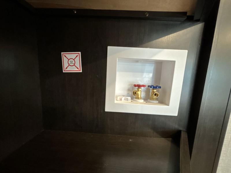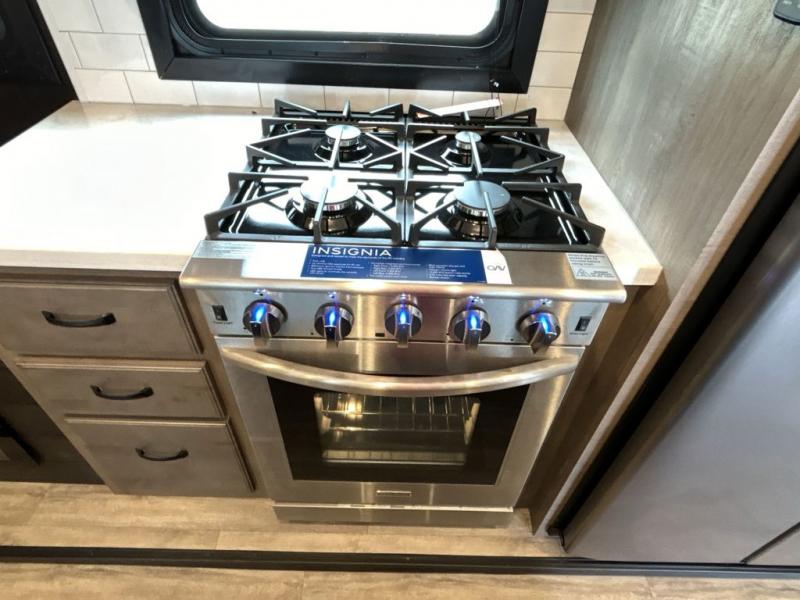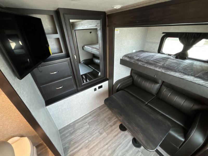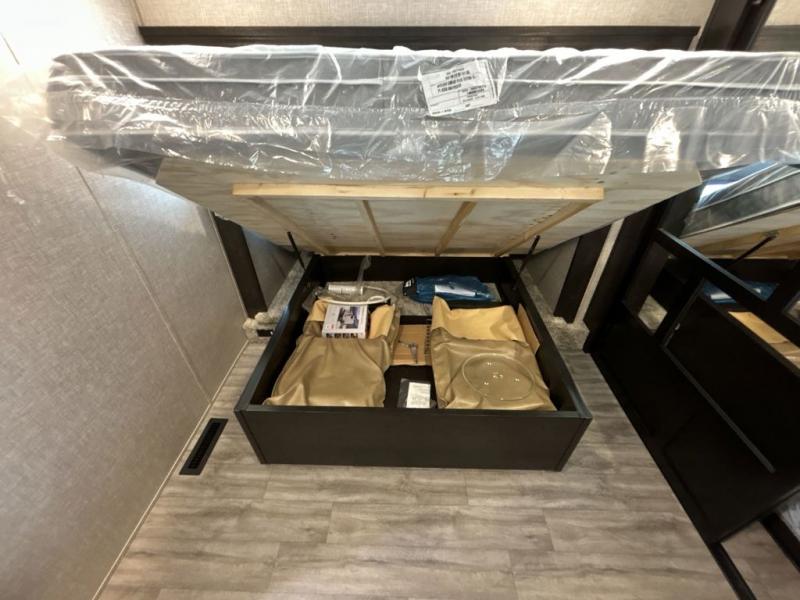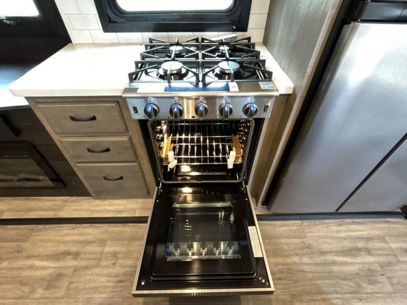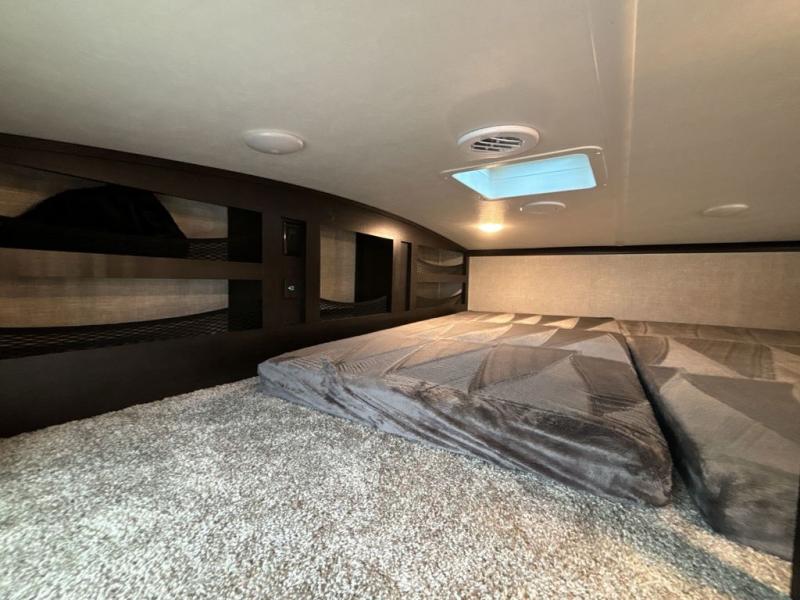 Traveling and living in this fifth wheel is made super easy with this North Point that offers an extra private rear room to utilize as a bunkhouse, an extra living area or even an office. You will find a unique rear slide out that includes a tri-fold sofa with removable table and a flip-up bunk above, plus a loft above this room with steps to access this area from the main living and kitchen area. The kitchen offers an island with flip-up butcher block, a 21 cu. ft. residential refrigerator or choose the 18 cu. ft. option, a pantry and everything you will need to make lots of food for entertaining. The theater seats and the free standing table without a pedestal are great places to sit while watching the 50" Smart LED HDTV with fully digital HDMI output, home entertainment system with subwoofer, and a fireplace below. The full bathroom includes a walk-in shower with a seat and linen storage, and the front master is a great escape with a king bed slide, lots of storage, a space prepped for a washer/dryer option and more.