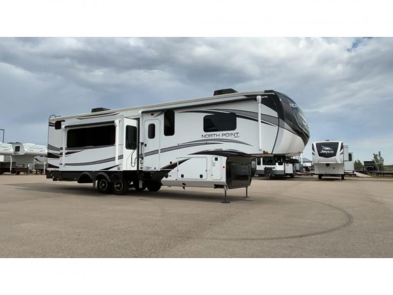 With any North Point fifth wheel by Jayco you begin with a strong foundation with a custom frame, designed and sized specifically to best support each unit. Constructed with Stronghold VBL™ aluminum framed, vacuum bond laminated walls and the Magnum Truss™ XL6™ roof system with a one-piece, seamless DiFlex II material which is the strongest tested roof in the industry. The 5-Star Handling package is included with Uniroyal tires, a MORryde rubber pin box, Dexter axles with Nev-R-Adjust brakes, MORryde CRE-3000 rubberized suspension and wet bolt fasteners and bronze bushings. The interior has handcrafted hardwood glazed doors and drawers, vinyl flooring throughout, a vessel bowl sink with high rise faucet in the main bathroom, plus so much more you just have to see one to believe it all!