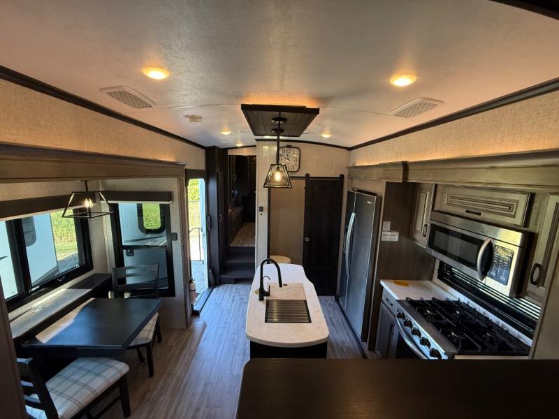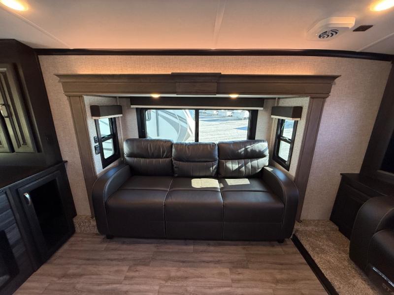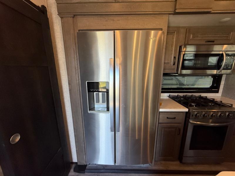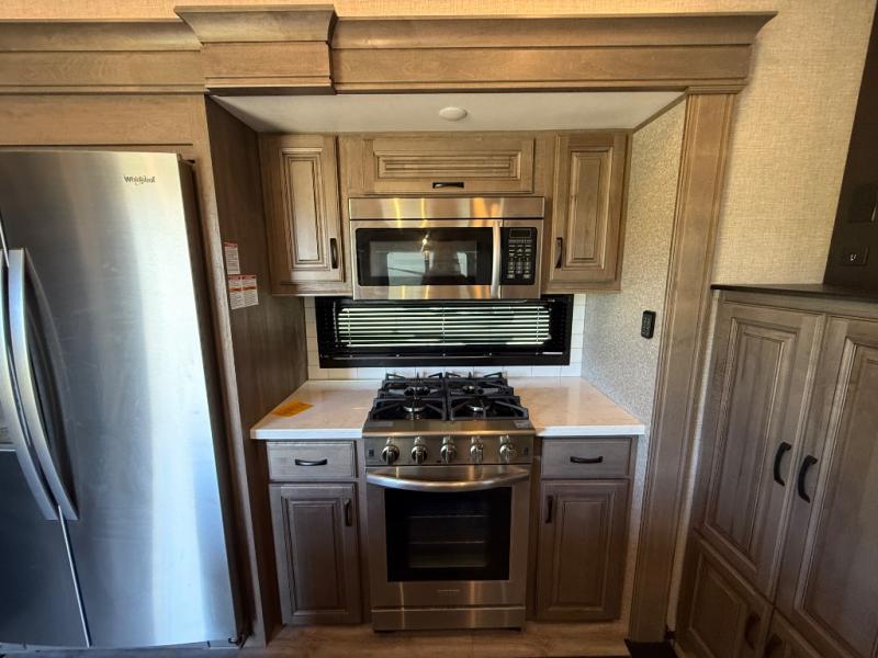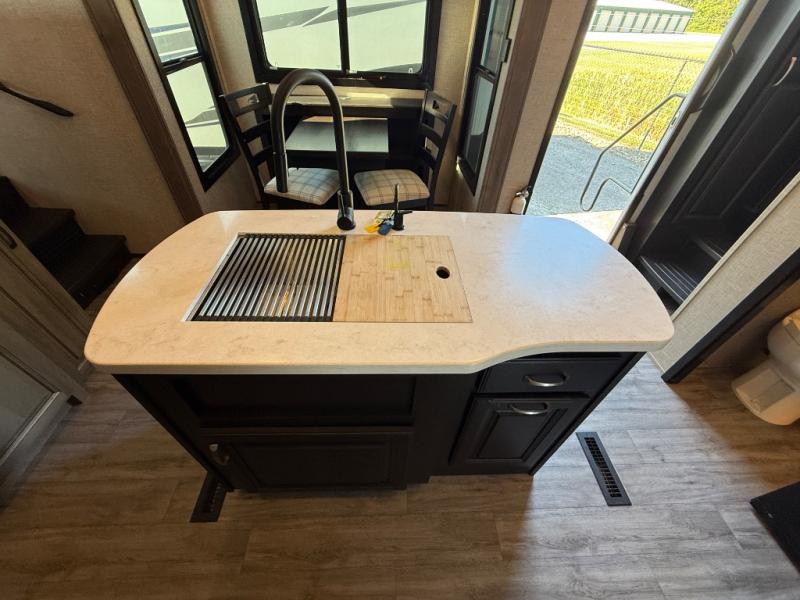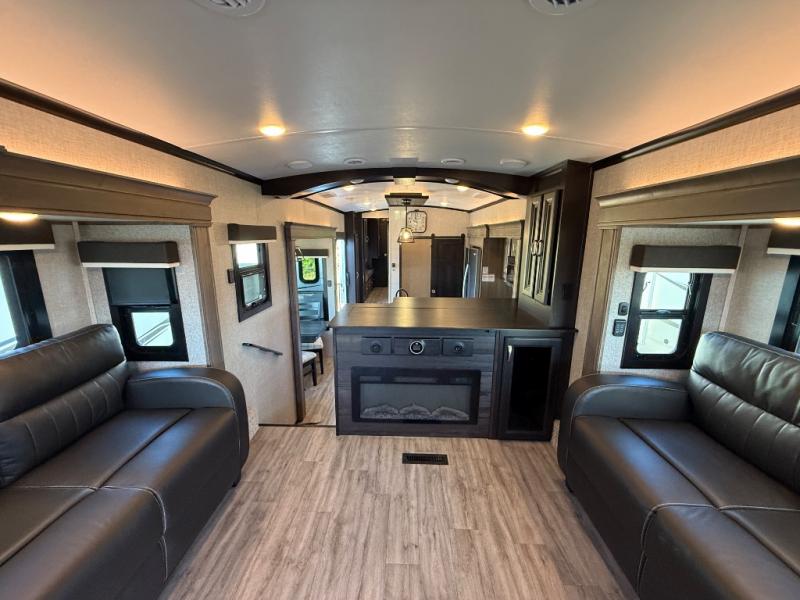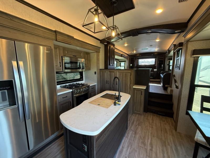Entertainment can be found throughout this fifth wheel from the front living area with a 50" Smart LED HDTV with fully digital HDMI output and home entertainment system with subwoofer including a fireplace below that you can enjoy while relaxing on theater seats and two tri-fold sofas within slide outs, a 32" TV in the middle kitchen and there is a bedroom 32" TV. You might even like to add the tailgate TV option along the exterior. Back inside the kitchen, the cook will love the center island, the pantry, the 21 cu. residential refrigerator or choose the 18 cu. ft. option, and the free standing table with a leaf, two free standing chairs and two folding chairs. The half bath is a few steps away as an added convenience. The master bedroom includes a king bed slide, a bench, two wardrobes and a sliding door into the bathroom which offers two sinks, a space prepped for a washer/dryer option, and a walk-in shower. And don't forget about the exterior features such as the outside kitchen for more choices when making meals, the storage for your outdoor gear and chairs, and the two awnings with integrated LED lighting.