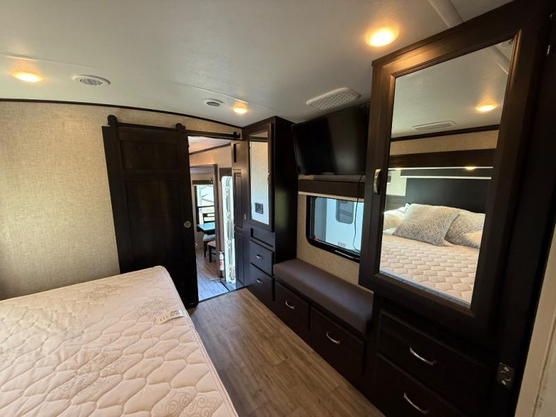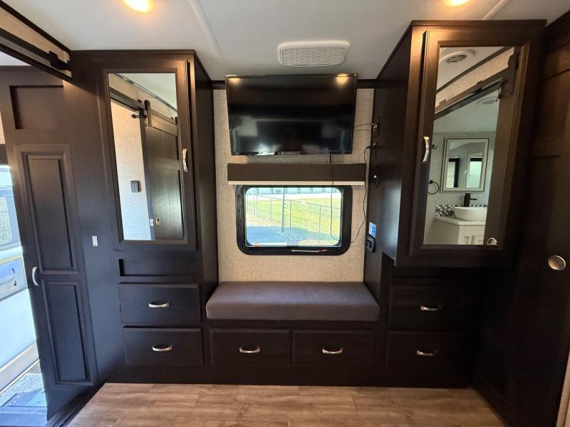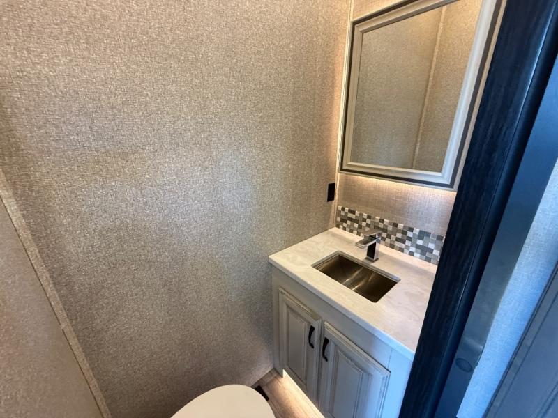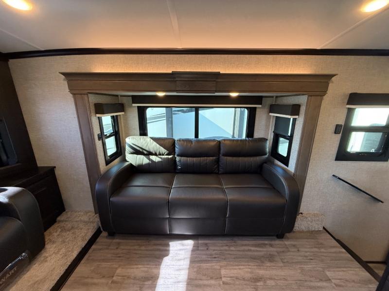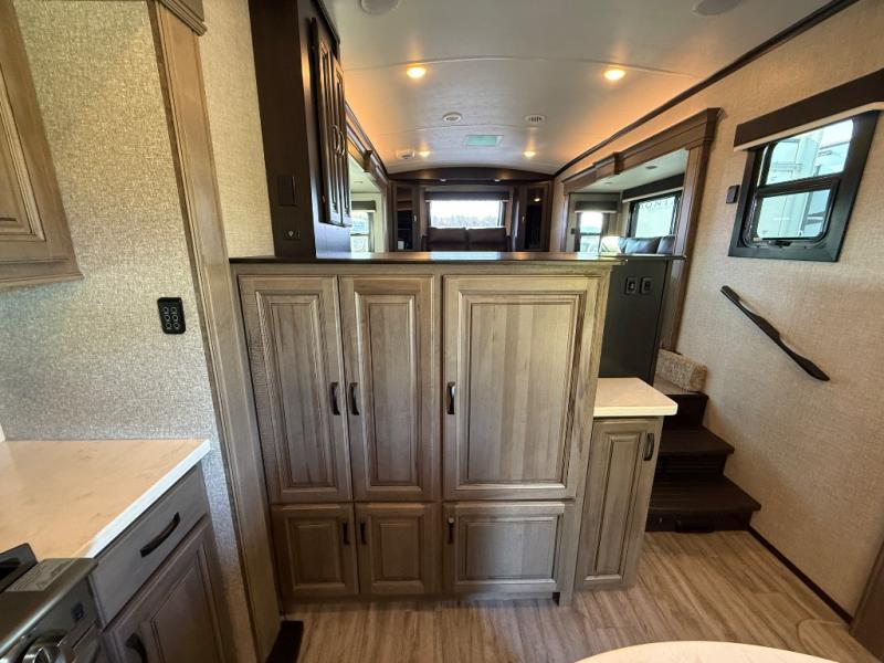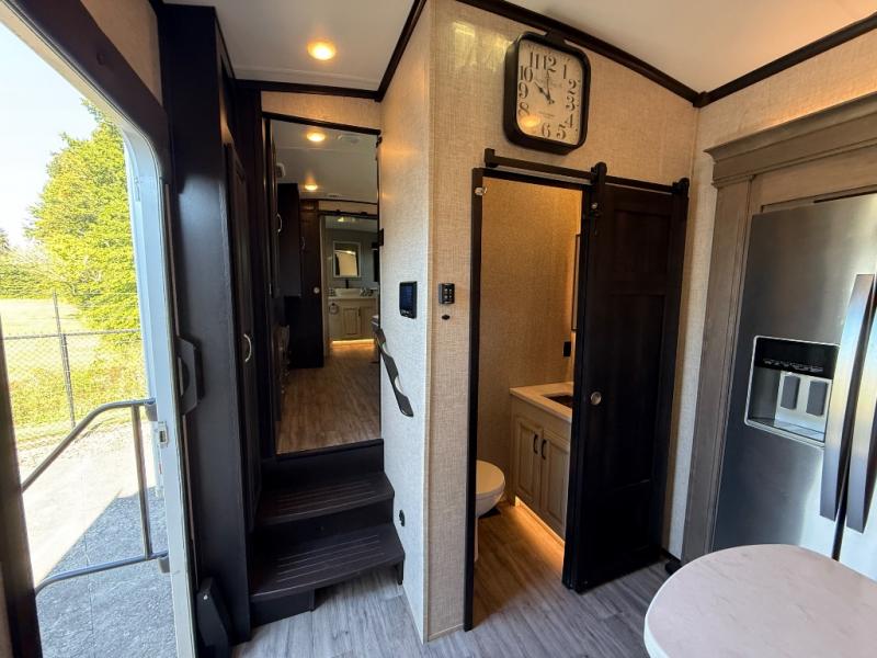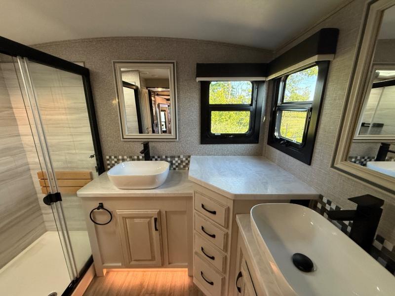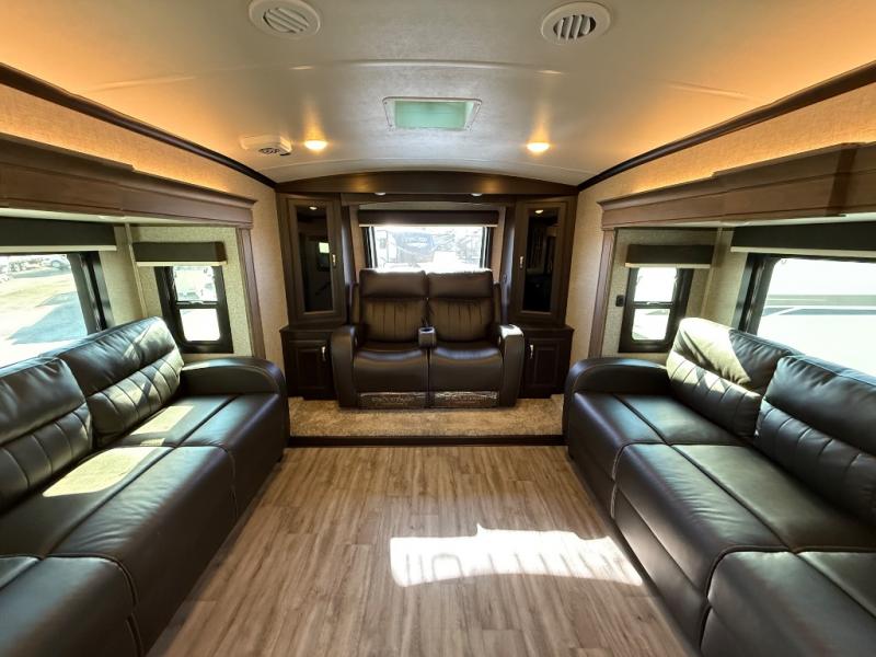 Entertainment can be found throughout this fifth wheel from the front living area with a 50" Smart LED HDTV with fully digital HDMI output and home entertainment system with subwoofer including a fireplace below that you can enjoy while relaxing on theater seats and two tri-fold sofas within slide outs, a 32" TV in the middle kitchen and there is a bedroom 32" TV. You might even like to add the tailgate TV option along the exterior. Back inside the kitchen, the cook will love the center island, the pantry, the 21 cu. residential refrigerator or choose the 18 cu. ft. option, and the free standing table with a leaf, two free standing chairs and two folding chairs. The half bath is a few steps away as an added convenience. The master bedroom includes a king bed slide, a bench, two wardrobes and a sliding door into the bathroom which offers two sinks, a space prepped for a washer/dryer option, and a walk-in shower. And don't forget about the exterior features such as the outside kitchen for more choices when making meals, the storage for your outdoor gear and chairs, and the two awnings with integrated LED lighting.