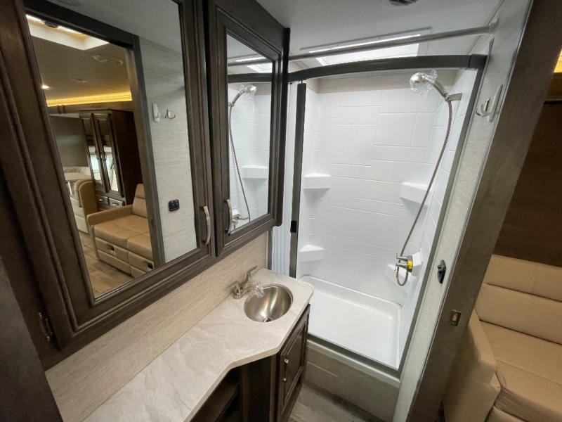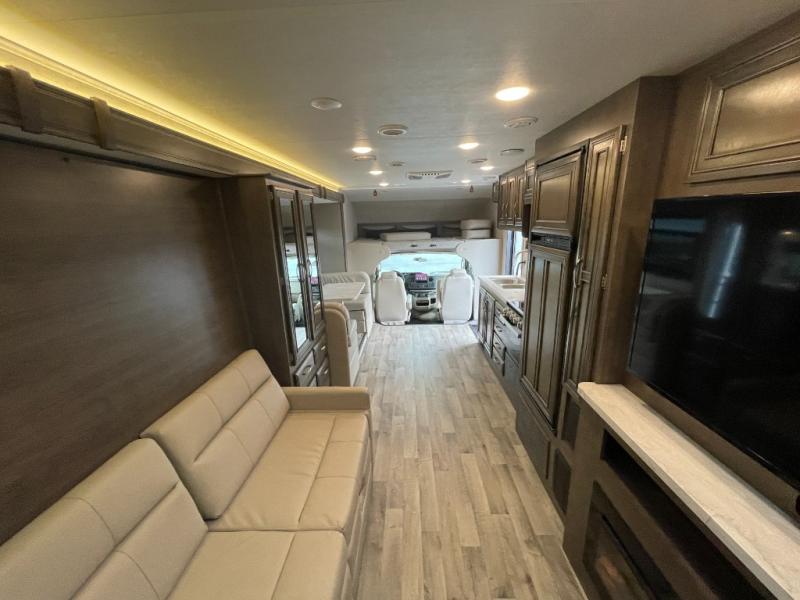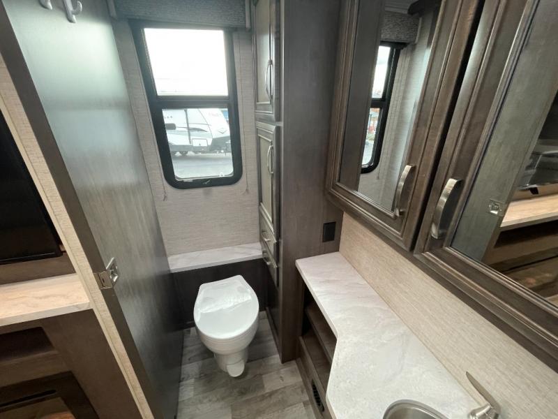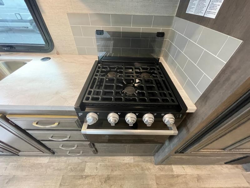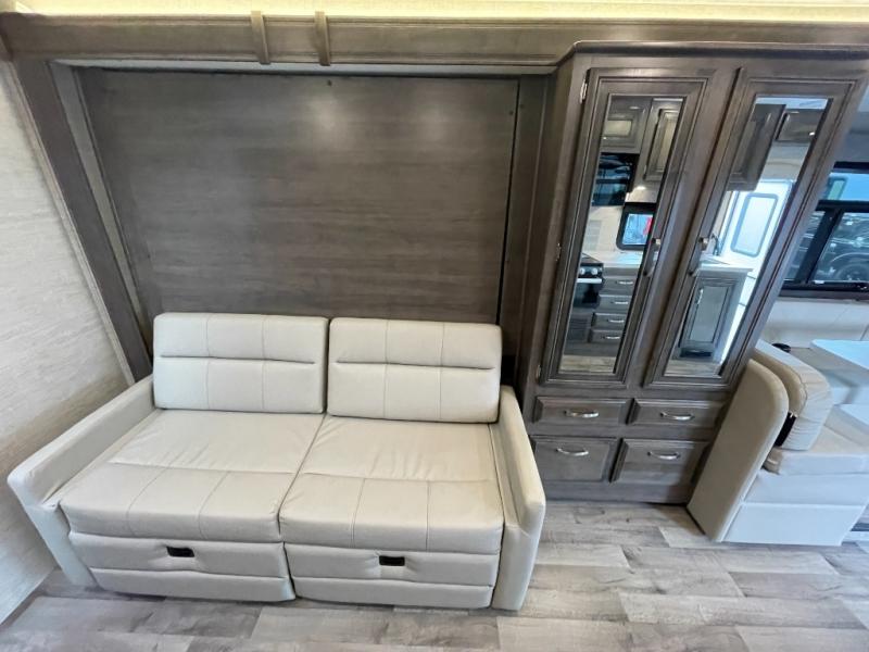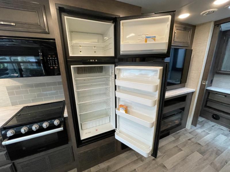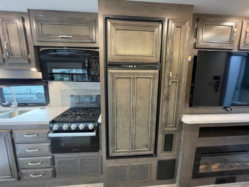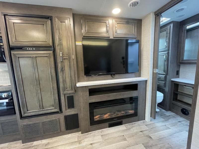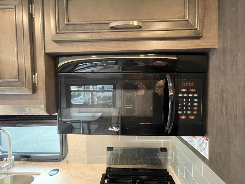 Enjoy a versatile space with the queen Murphy bed and sofa combination which allows you to relax and watch the 50" LED HD Smart Fire TV with a fireplace. The rear full bathroom is spacious, and provides extra counter space, linen storage, plus a space savings sliding door. The cook will love the galley kitchen with everything nearby including a residential-size microwave, a pantry and the 8 cu. ft. refrigerator. The cook can use the outside kitchen as well. Dine at the U-shaped dinette or while outside sitting under the 19' electric awning, yet you might chose the theater seating option if you like that type of comfort. And the cab over bunk is sure to be a popular place to sleep when you have guests.