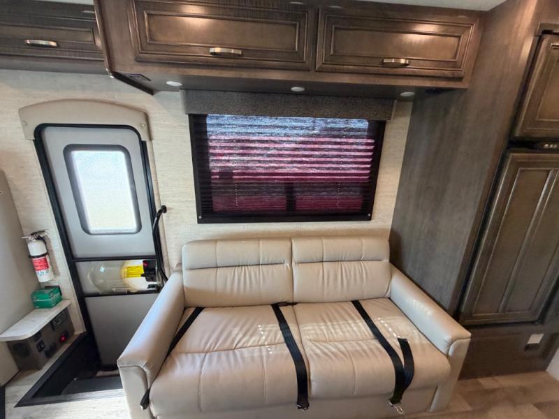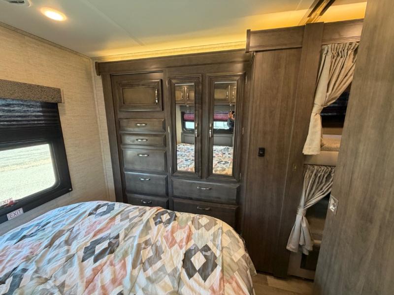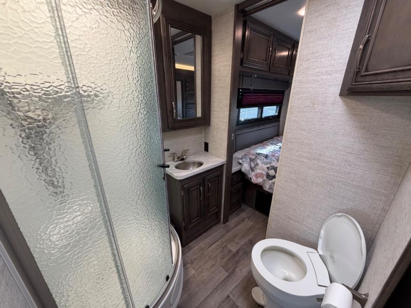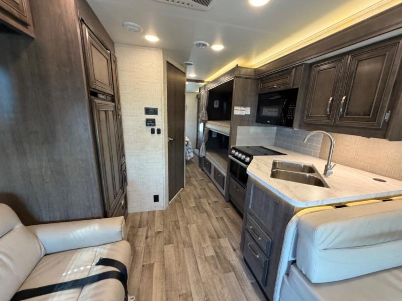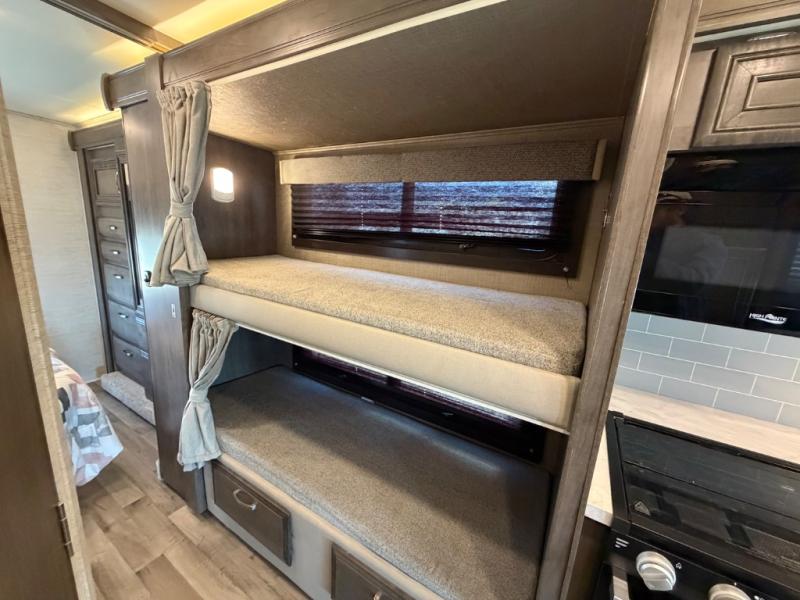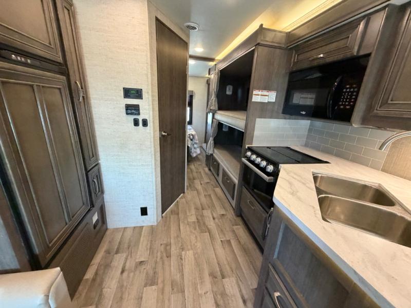 Searching for an RV to travel with family and friends? This coach offers up to seven sleeping spaces when you utilize the queen bed, the bunk beds, the cab over bunk and the furniture. The private master bedroom is in the rear and has access to the double entry bathroom, and the bunk beds are just across from the main entrance which is convenient. The kitchen provides a Furrion all-in-one cooktop and oven, a residential-size microwave and an 8 cu. ft. refrigerator, plus a pantry. You can dine at the Jayco exclusive, easy-operation legless dinette table or while sitting on the sofa. You might like to add the theater seating option in place of the sofa if you prefer that setup. And the cab seats swivel for more seating.
