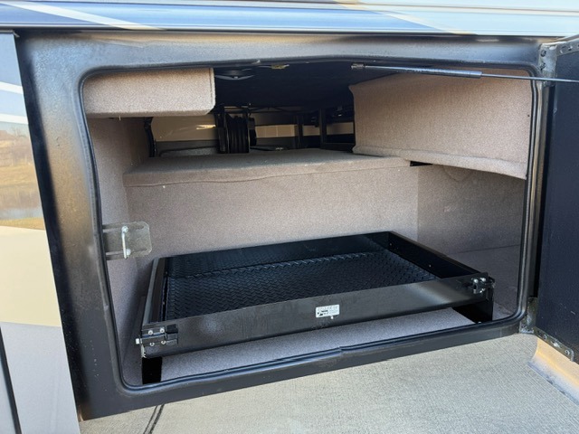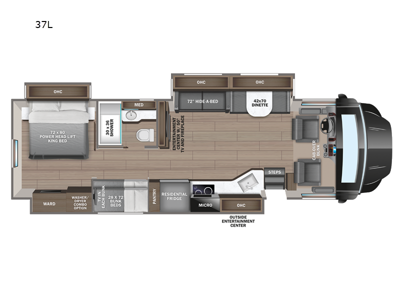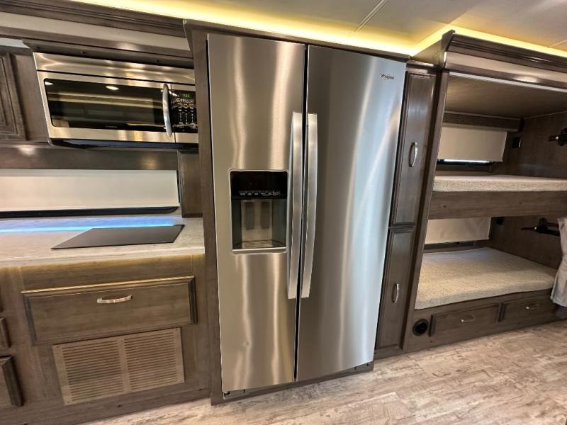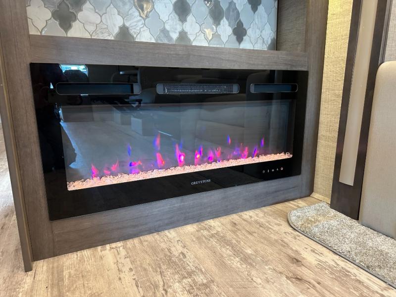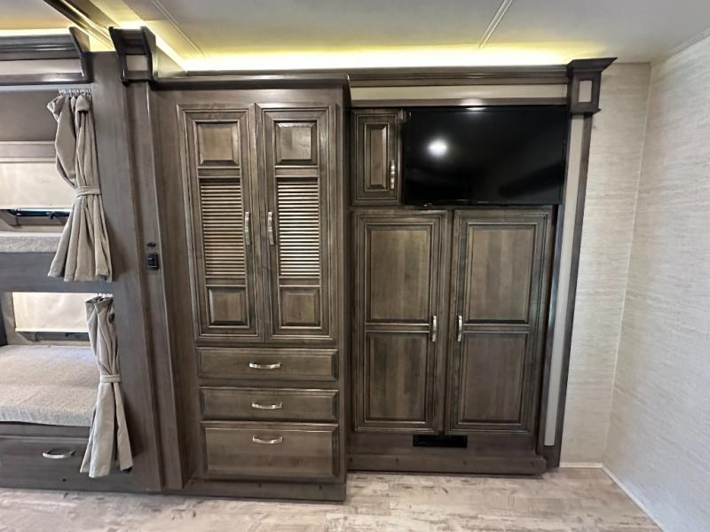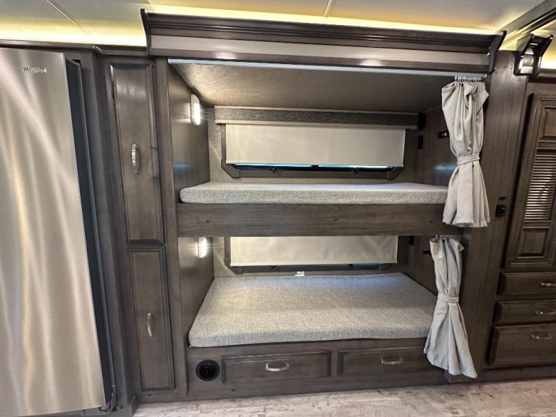 This Seneca Super C diesel motorhome is stunning, and it has sleeping space scattered all throughout! There is a private bedroom with a 72" x 80" king bed slide that can be used by the owners of this coach, and if there are any children, they will appreciate the set of bunk beds with TVs at each bunk. Out in the main living area, you'll find a hide-a-bed sofa and booth dinette which can both be used as lounging or sleeping spaces, and the last sleeping location is included above the cab with the overhead bunk that is closed off with privacy curtains. The living area is comfortable and residential with its fireplace and 50" LED TV, and you'll have an additional entertainment center on the exterior which comes with an exterior LED TV mounted on a swivel bracket, outside speakers, and an AM/FM radio.