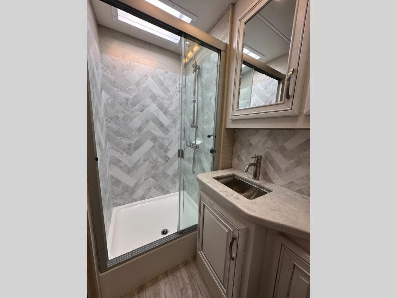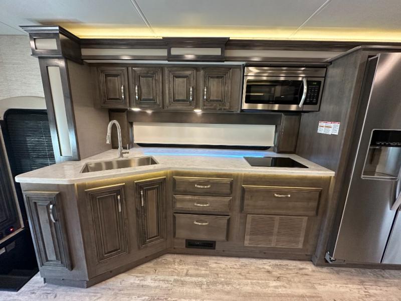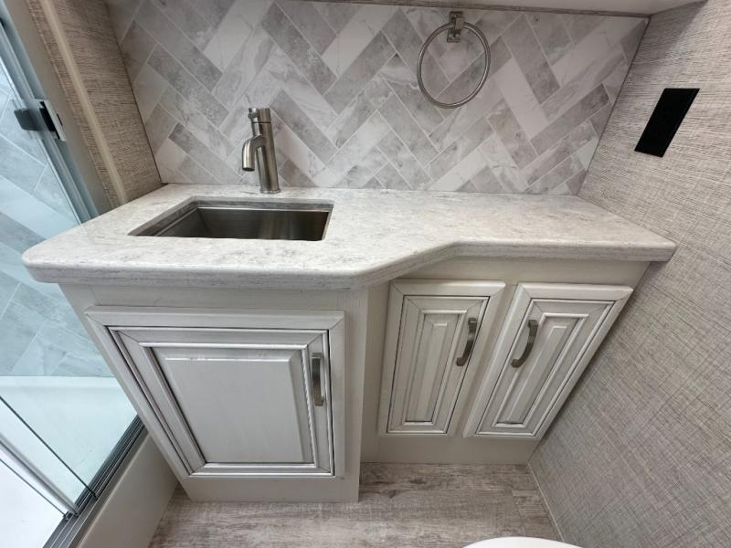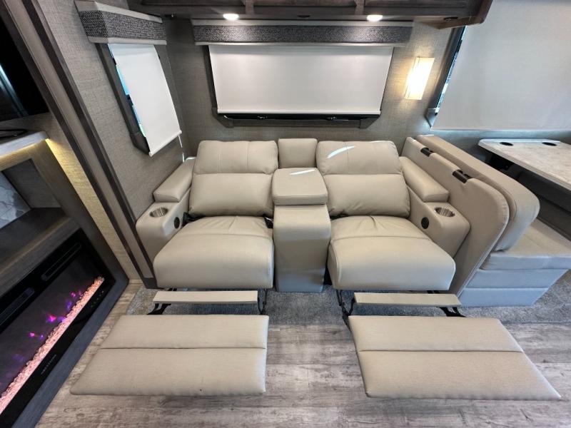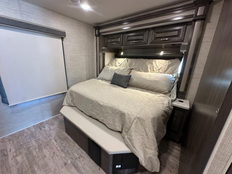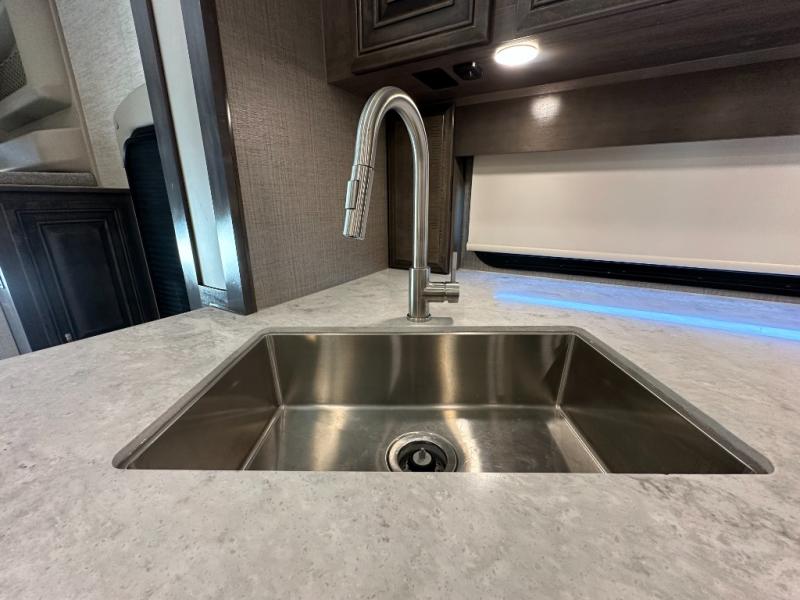 You will be quite impressed with the Jayco Seneca Super C diesel motorhome! The construction consists of a Stronghold VBL roof, floor, and sidewalls, and the premium Sikkens full-body paint is going to draw attention as you cruise down the highway. The entrance door has the industry's largest travel-view window, and you have four 6V AGM (220Ah) house batteries on a slide out tray for convenience. The JAYCOMMAND control system powered by Firefly will give you access to your coach's functions from the smartphone in your hand, and the high-gloss polished porcelain tile flooring has a heated floor mat for extra comfort. The luxury continues on with the addition of the solid-surface countertops and water filtration system, and the 9" Sony® infotainment center with Apple CarPlay® and Android Auto™ as well as the backup and sideview cameras are an excellent contribution to the front cab area.