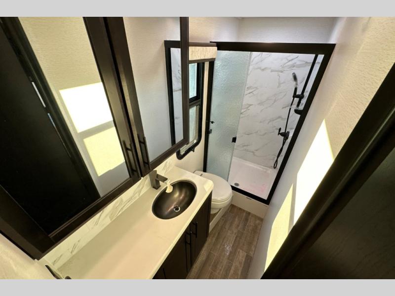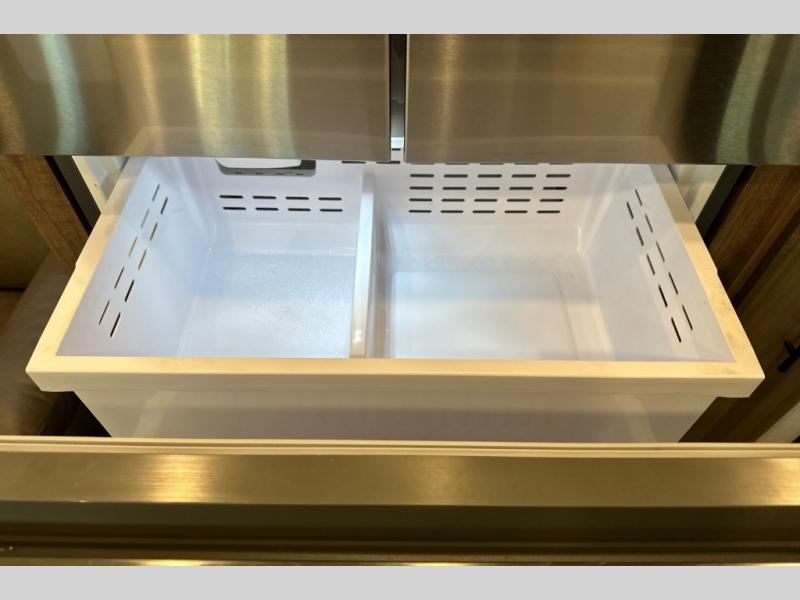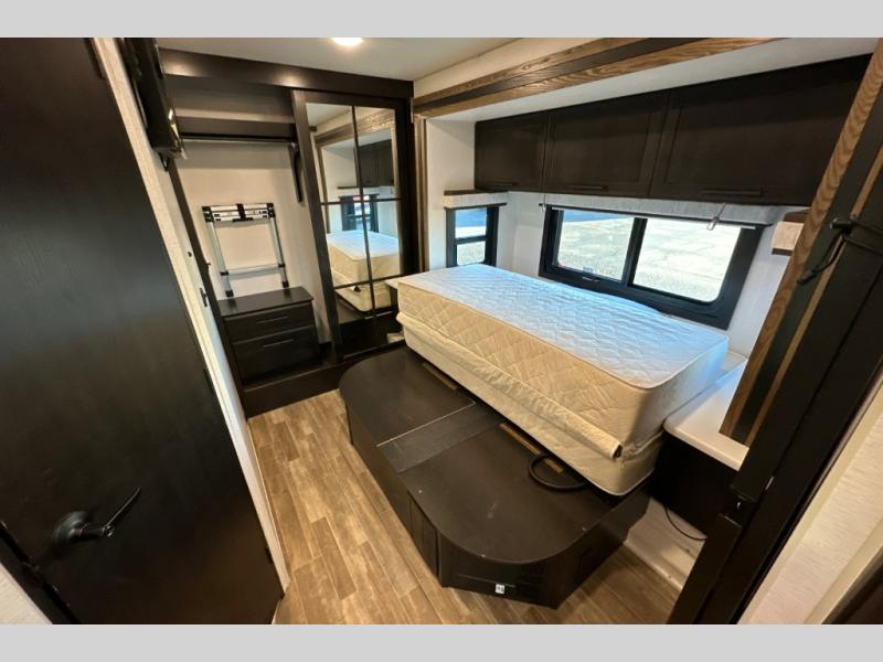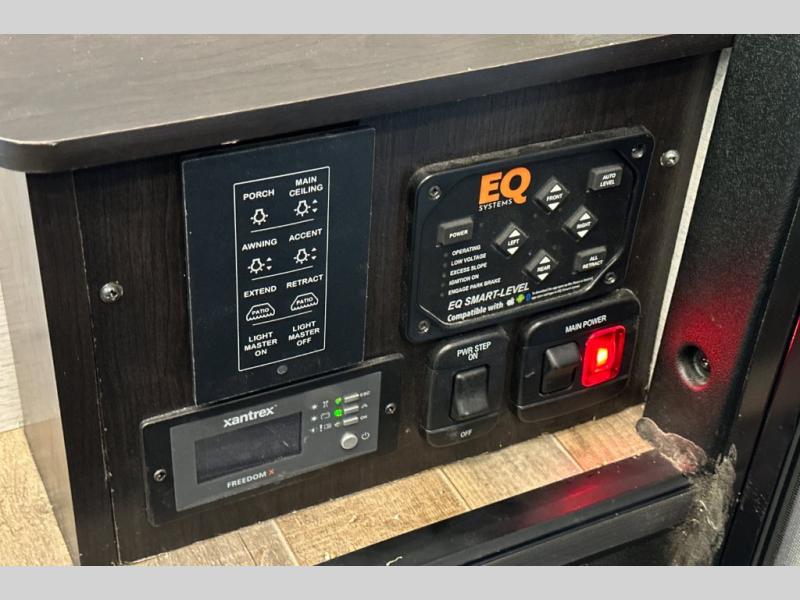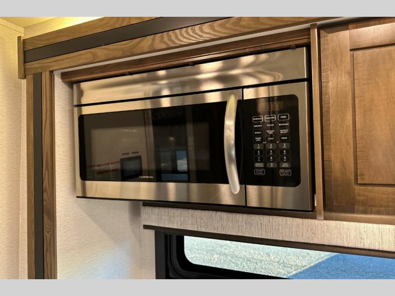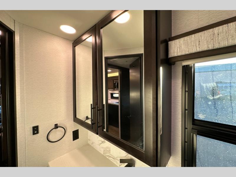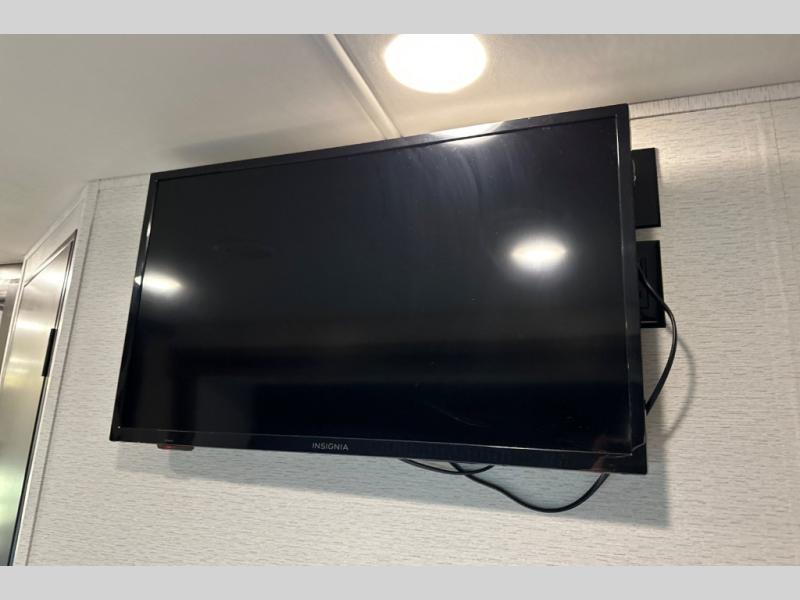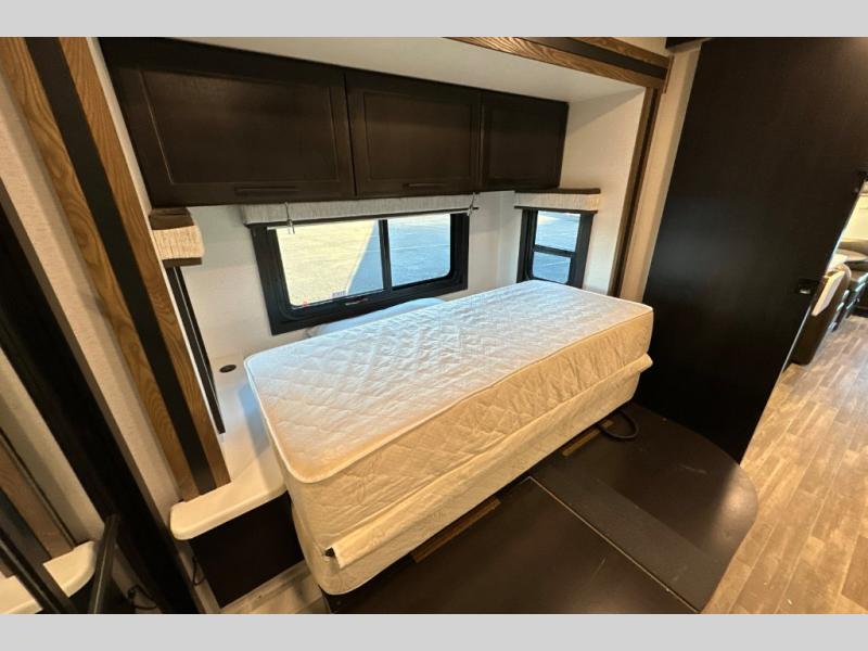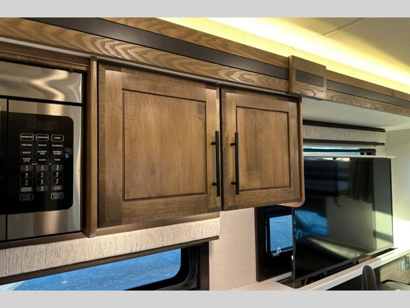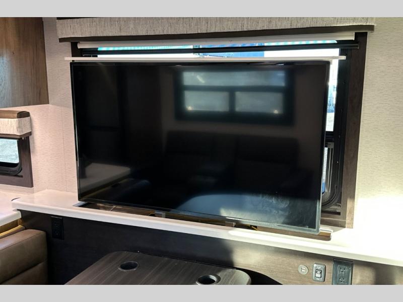 Travel to any destination in comfort with this motorhome! You will have your own place to sleep in the private bedroom with a king bed slide, two wardrobes, and access to the rear corner bathroom which has a 30" x 36" shower. There are more sleeping spaces throughout between the cabover bunk, the 68" jackknife sofa, and the 38" x 70" booth dinette can even transform into an extra sleeping space. Above the dinette is a 50" TV lift and for even more entertainment there is an outside entertainment center with speakers, a LED HD Smart TV, and Bluetooth receiver underneath the 20' awning.