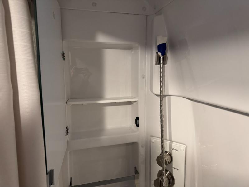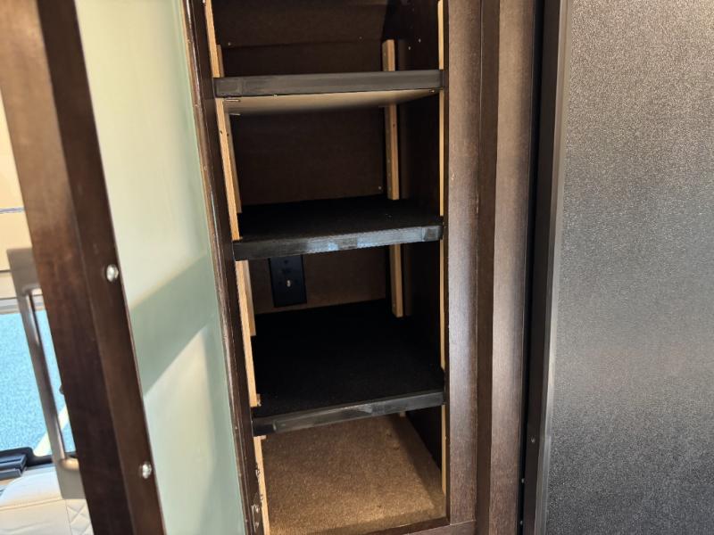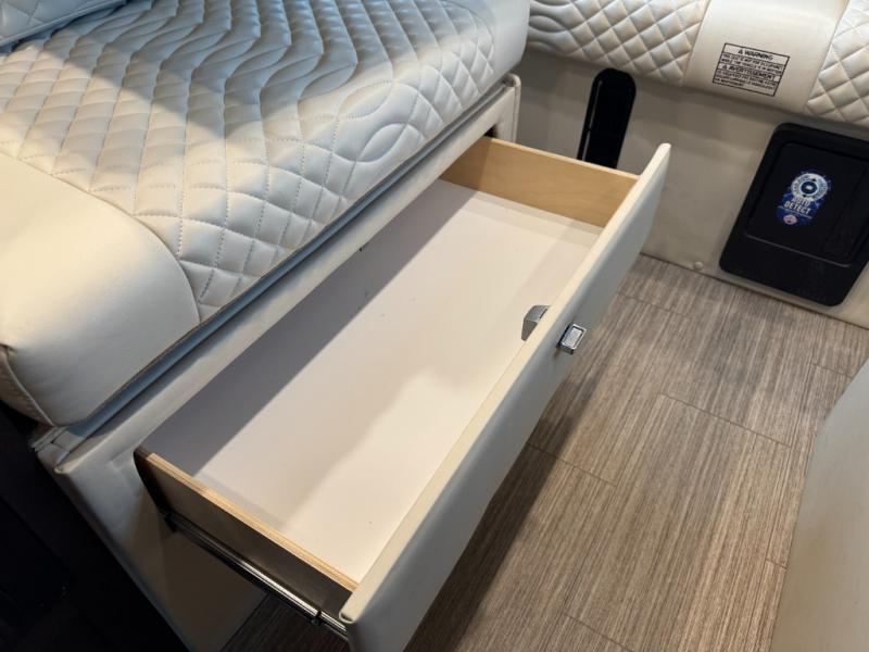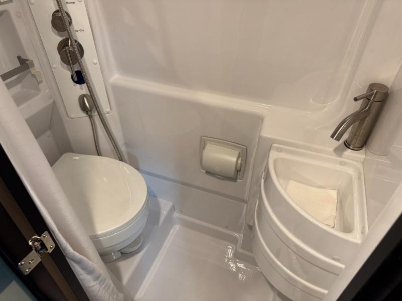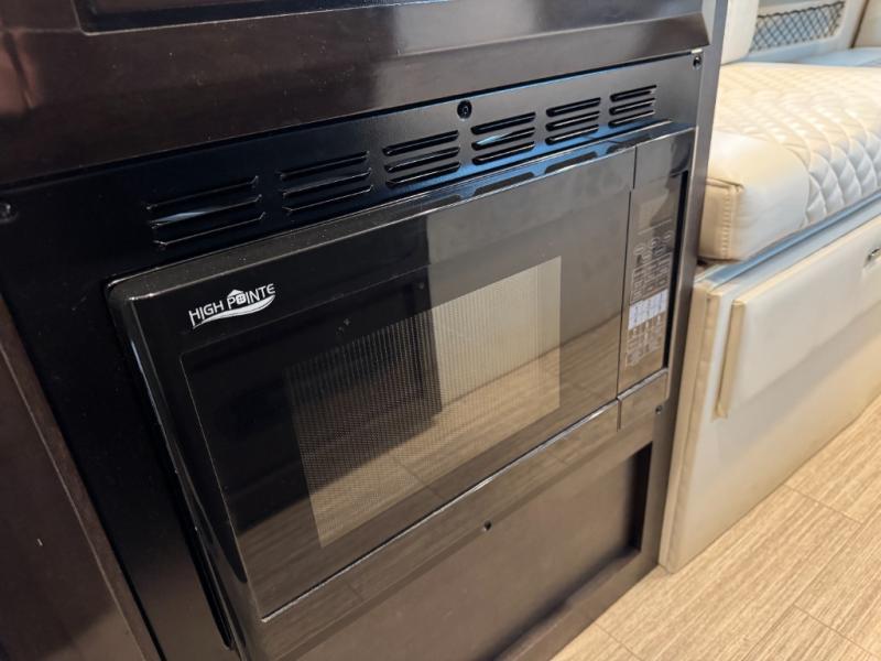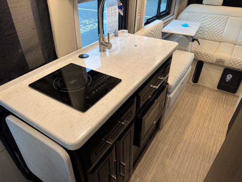 This couple's coach is ready to hit the road when you are! The rear 68" power sofa comes with a Lagun table mount to enjoy your meals at that were prepared with the one burner induction cooktop, convection microwave, and 5.3 cu. ft. refrigerator. If you want to eat a quick bite of food to get back on the road fast then simply swivel around from the captain and passenger chairs and set up the fold down table and Lagun table. Wash the travels away in the 25" x 46 3/4" wet bath with a magnetic curtain surround and Aqua View SHOWERMI$ER water management system to keep your water usage low. When you're ready for a good night's rest then convert the sofa into a 68" x 76" bed!