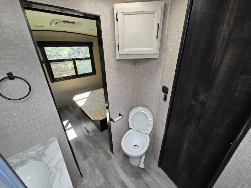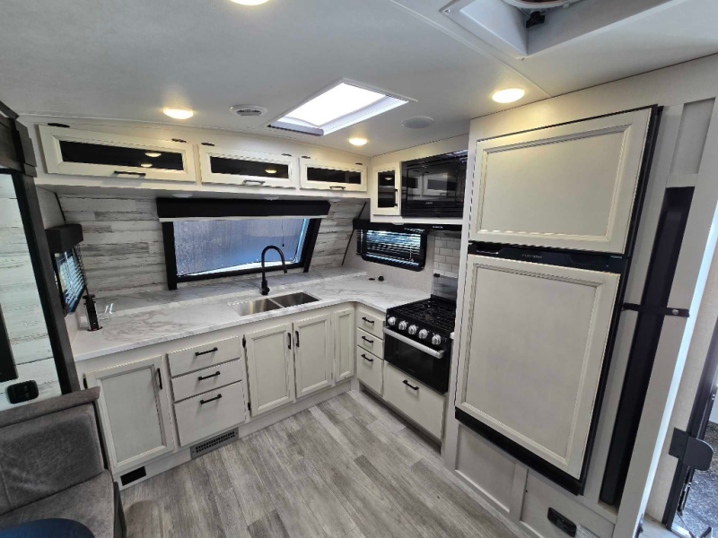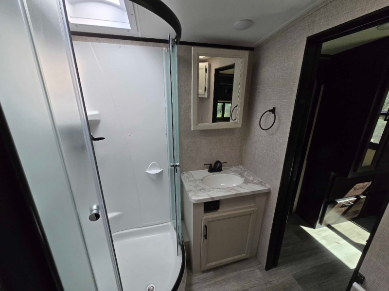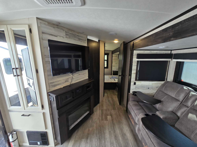 You will experience a smooth flow of traffic in and out of this travel trailer with dual entry doors! The rear private bedroom has one of the entrance/exit doors so you can sneak out for an early morning fishing trip, a queen bed slide for more space, and a wardrobe for your clothes. The full bathroom has a radius shower to clean up in and handy storage areas like a linen closet, a medicine cabinet, and a shelf. Grab a snack from one of the two pantries and head to the theater seating with swivel tables across from the entertainment center for a relaxing movie night. The chef will love cooking in the front kitchen with all of the countertop space and three burner cooktop. It comes standard with a booth dinette, but you can switch it out for the optional table and two chairs with ottoman or the optional table and four chairs.