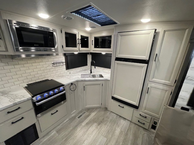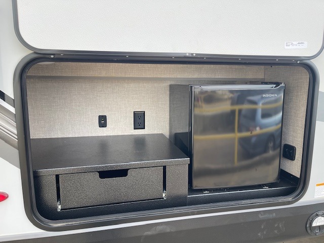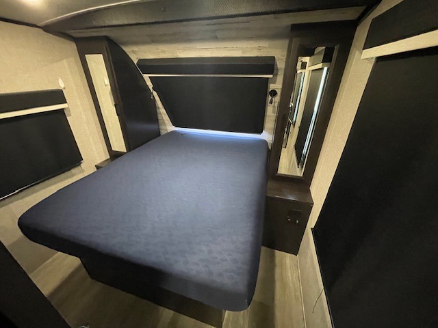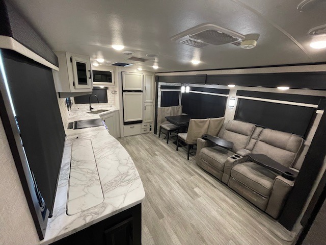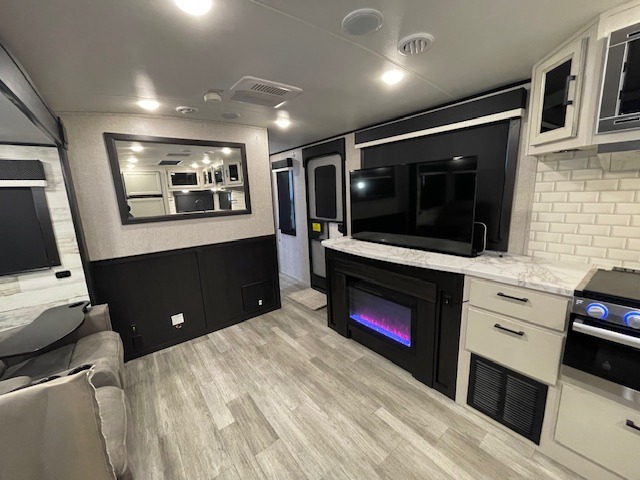 Step inside this rear kitchen travel trailer for fun family vacations. The large slide will provide the chef space to cook, while the kids watch a movie on the TV on lift. If the weather is just right, you will probably want to cook on the outside kitchen while the kids ride their bikes around the campsite. This model includes a tri-fold sofa and a booth dinette that will be perfect for meal times, relaxing, and sleeping space at night. You and your spouse can take the front private bedroom with a queen bed and dual wardrobes for your things, and the full bath is centrally located for easy access!