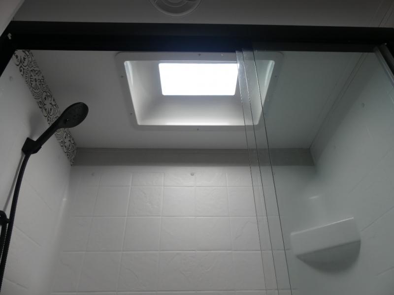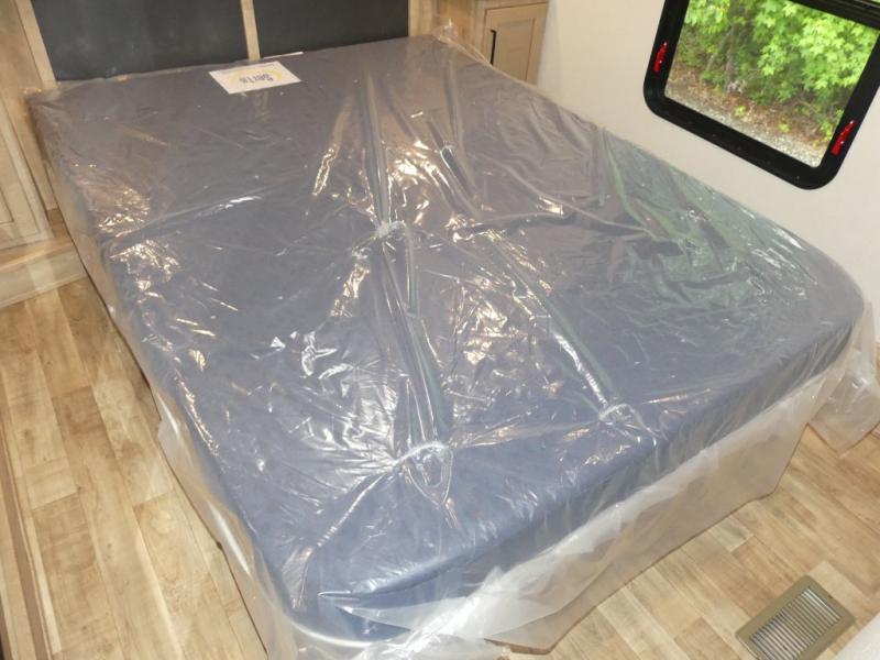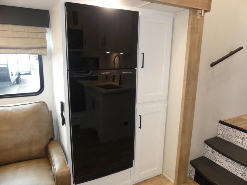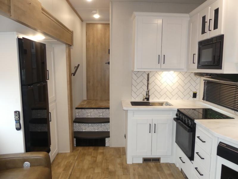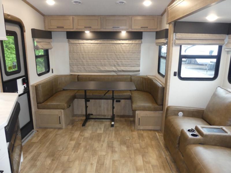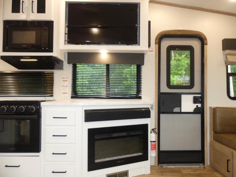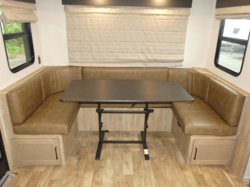This fifth wheel is both spacious and easy to tow; so come take a look! When you arrive at the campground you can set up the 20' electric awning, then stretch your legs on a trail or two. The full bath will be waiting for you when you return, and you'll enjoy a large shower here with a glass door and a skylight for added light. Head to the full kitchen to prepare dinner on the three burner cooktop, or use the microwave oven here. There is also a high-rise chef's faucet and sprayer here and a 10 cu. ft. 12V "solar friendly" refrigerator with dent resistant doors. Your crew can dine around the U-shaped dinette with the fireplace close by, plus this model includes theater seating for all-around comfort! After a long day, the queen bed in the front bedroom will be calling your name, while your guests sleep on the rear dinette.