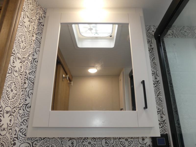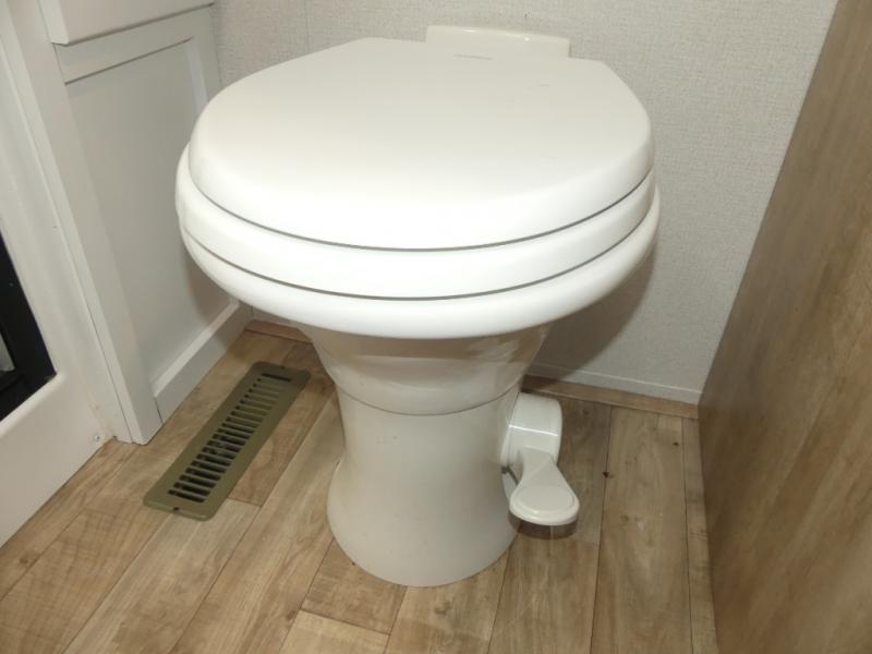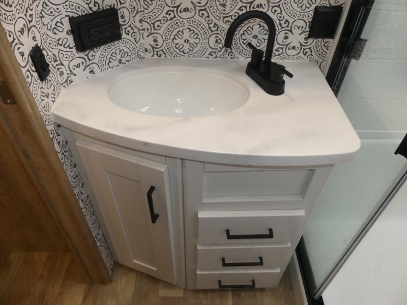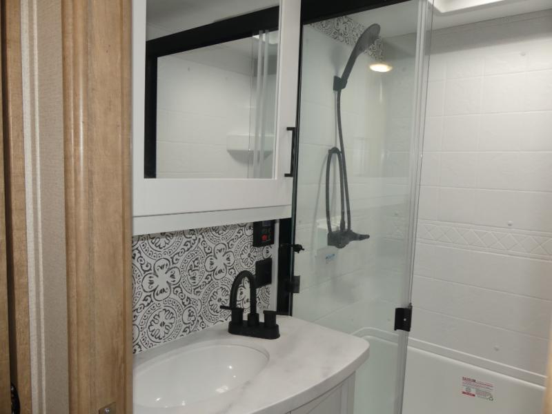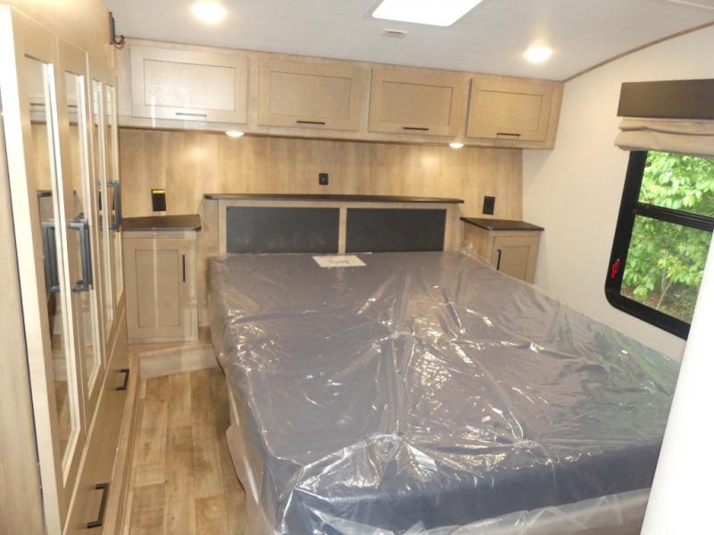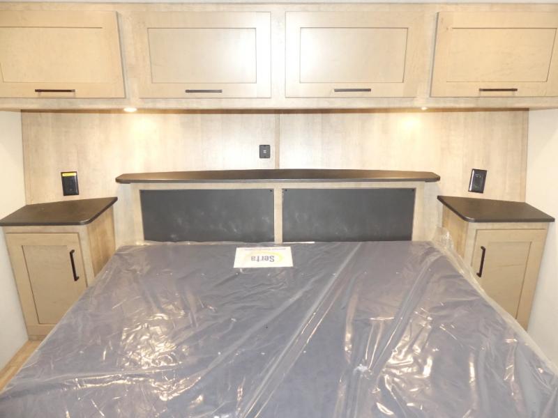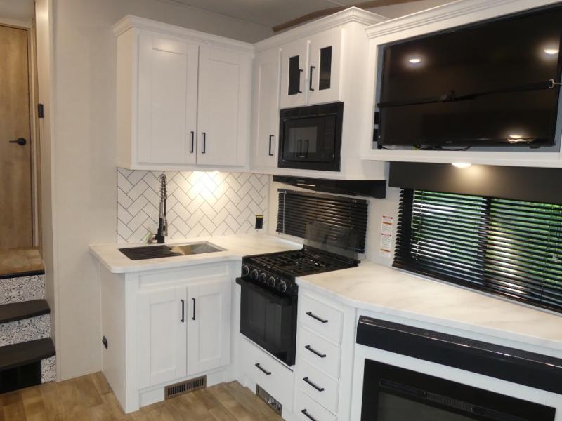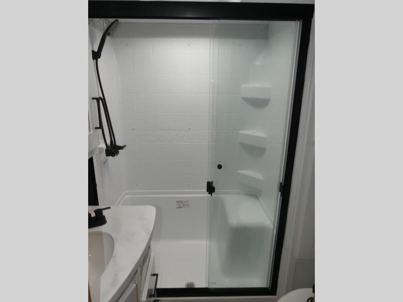 This fifth wheel is both spacious and easy to tow; so come take a look! When you arrive at the campground you can set up the 20' electric awning, then stretch your legs on a trail or two. The full bath will be waiting for you when you return, and you'll enjoy a large shower here with a glass door and a skylight for added light. Head to the full kitchen to prepare dinner on the three burner cooktop, or use the microwave oven here. There is also a high-rise chef's faucet and sprayer here and a 10 cu. ft. 12V "solar friendly" refrigerator with dent resistant doors. Your crew can dine around the U-shaped dinette with the fireplace close by, plus this model includes theater seating for all-around comfort! After a long day, the queen bed in the front bedroom will be calling your name, while your guests sleep on the rear dinette.